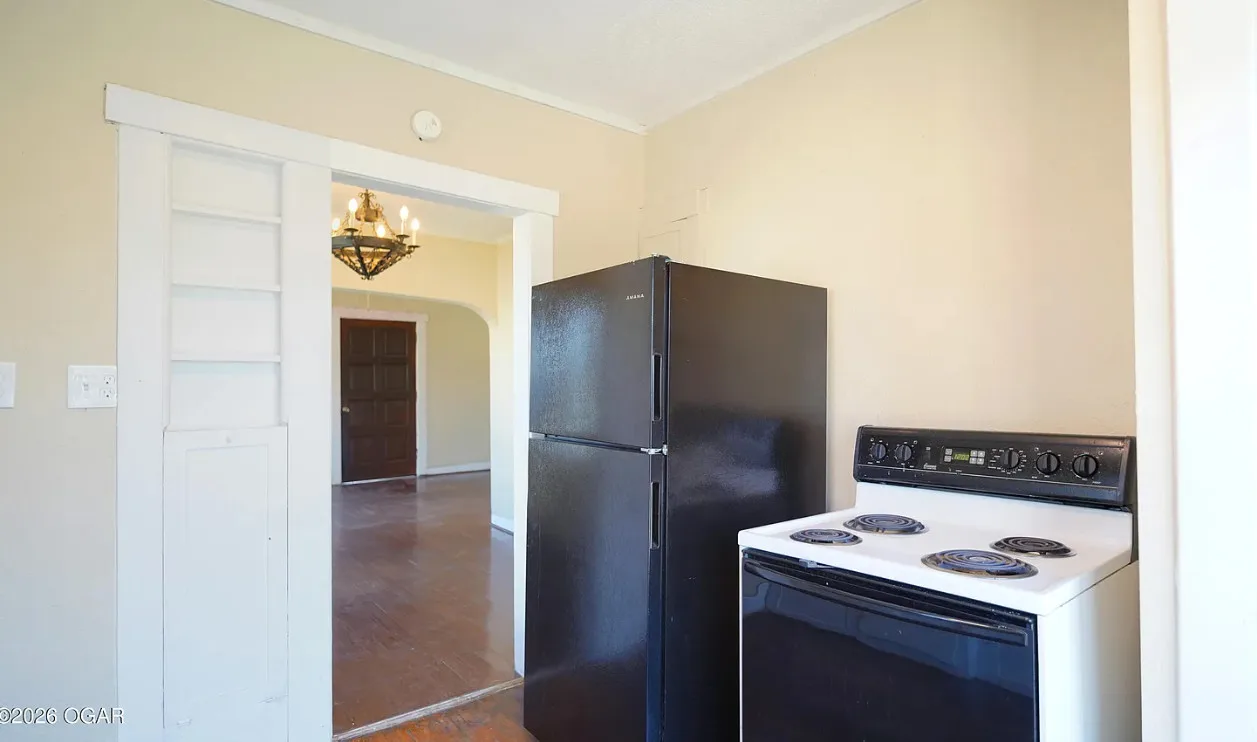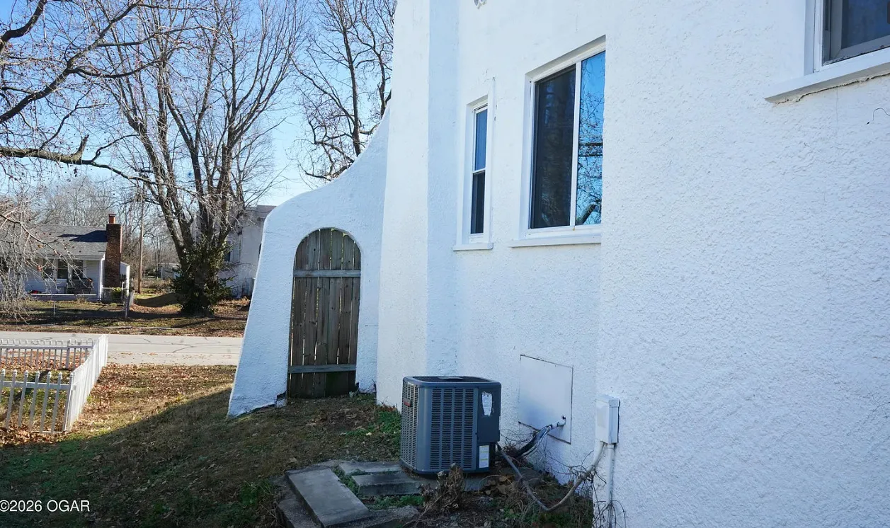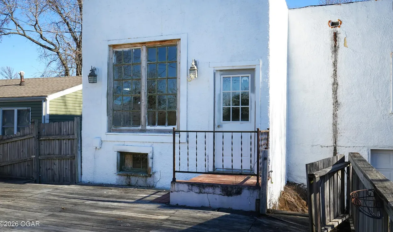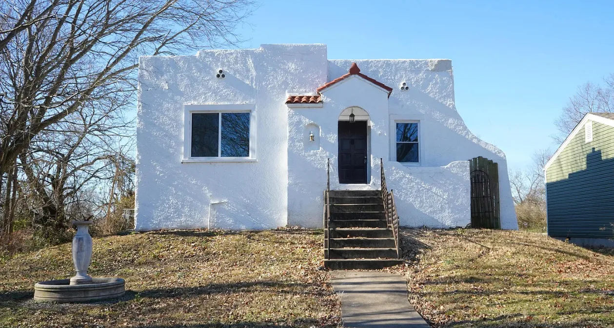 A Spanish Eclectic style home. Interesting how there are quite a few on this street in Missouri. The house was built in 1927. It is located in Joplin, Missouri. The Spanish Eclectic-Revival home features a stucco exterior, softly rounded parapets, arched entryways, wood floors, clay accent and a brick fireplace. There is a large unfinished basement, fenced in backyard and a detached storage shed. Two bedrooms, one bathroom and 842 square feet. $95,000