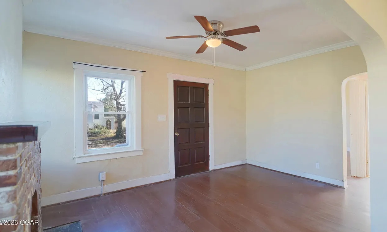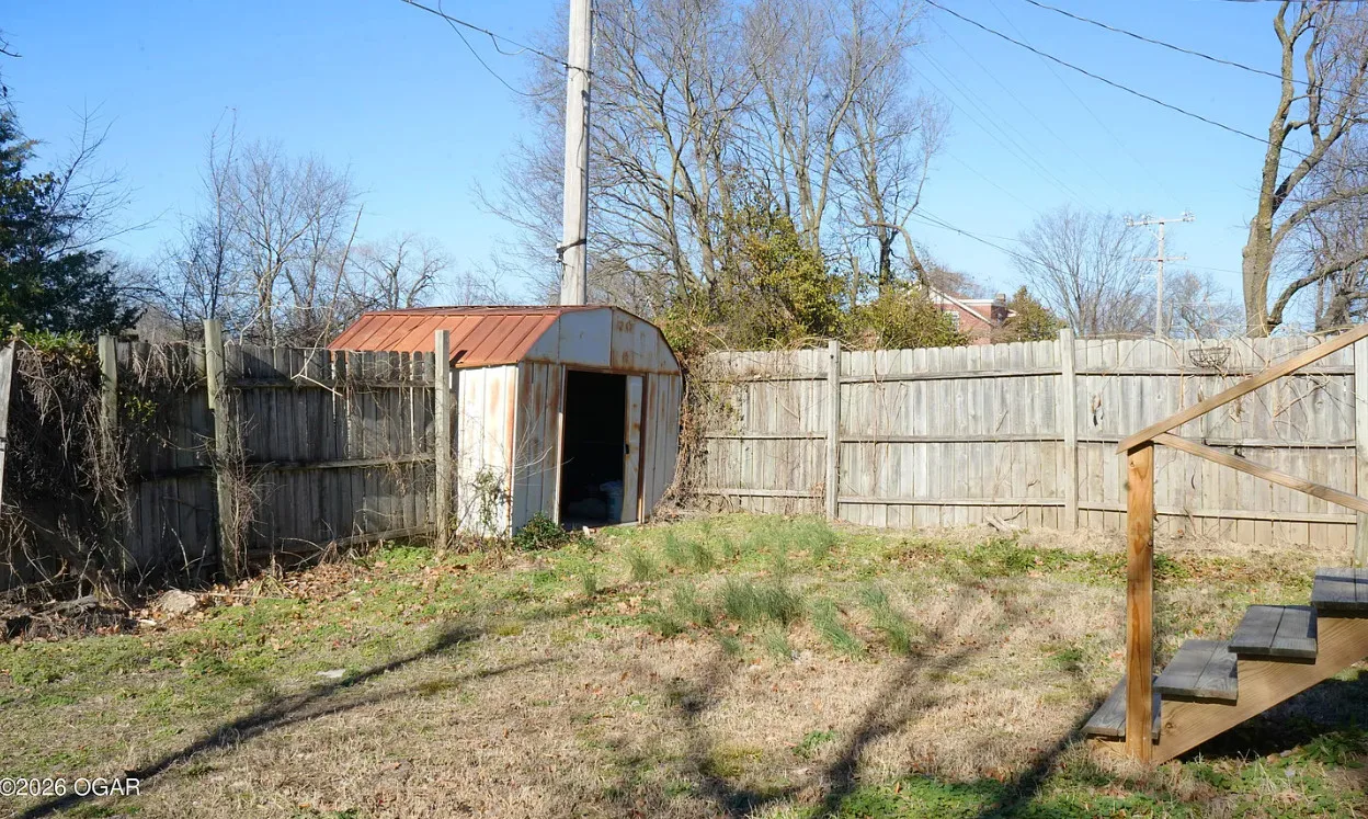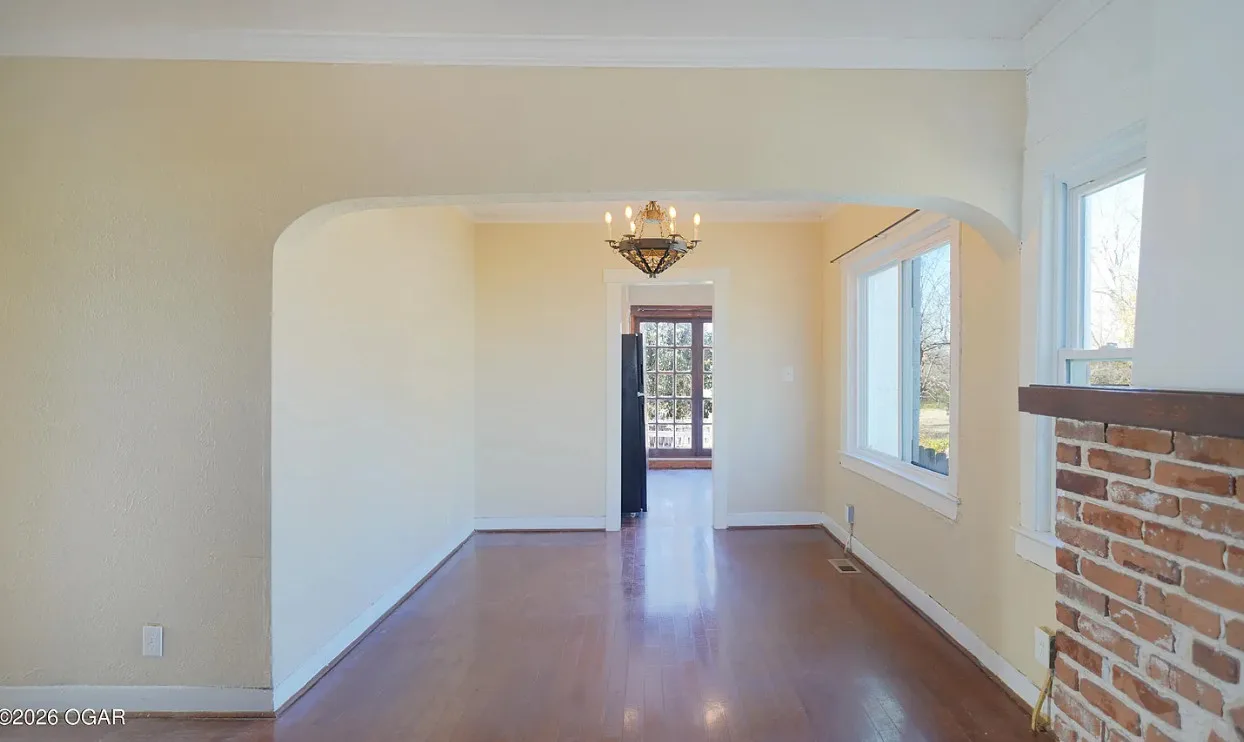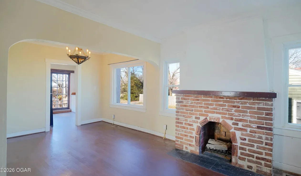 A Spanish Eclectic style home. Interesting how there are quite a few on this street in Missouri. The house was built in 1927. It is located in Joplin, Missouri. The Spanish Eclectic-Revival home features a stucco exterior, softly rounded parapets, arched entryways, wood floors, clay accent and a brick fireplace. There is a large unfinished basement, fenced in backyard and a detached storage shed. Two bedrooms, one bathroom and 842 square feet. $95,000