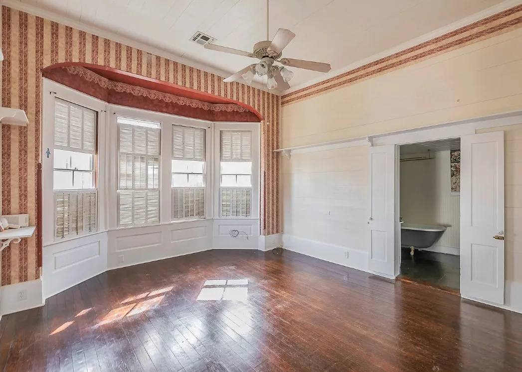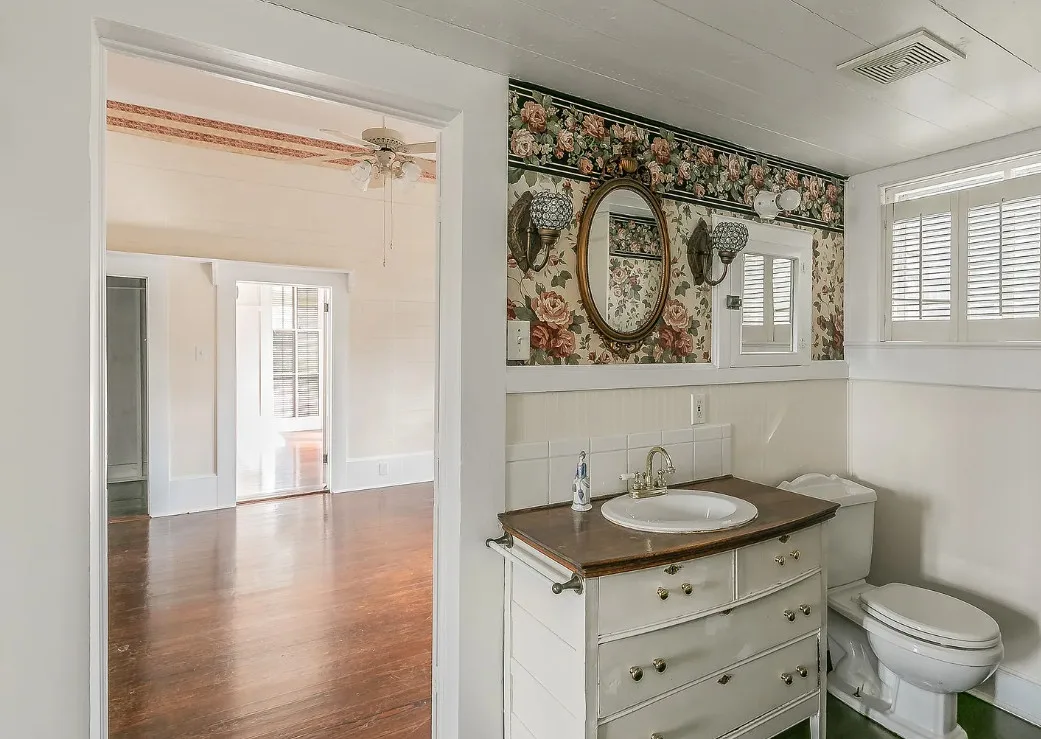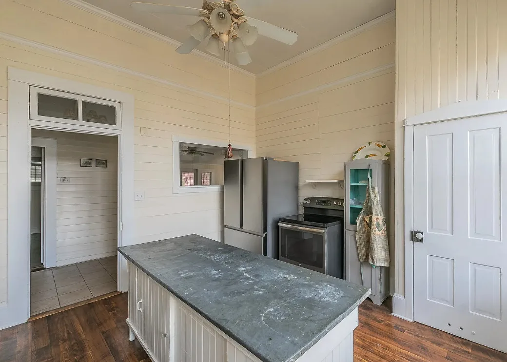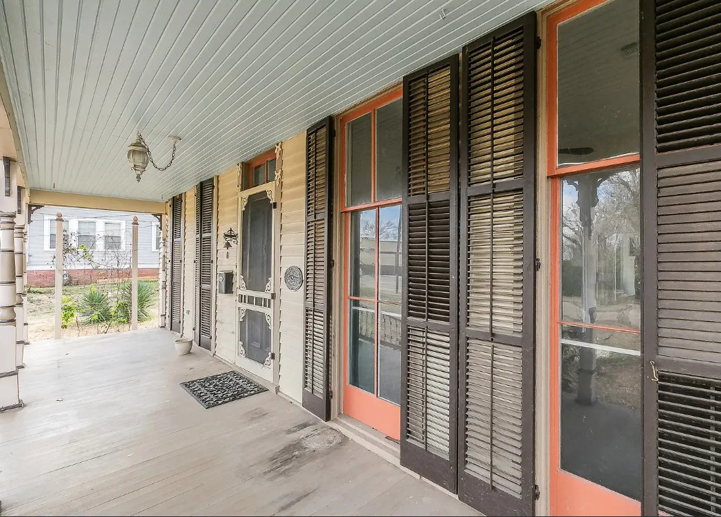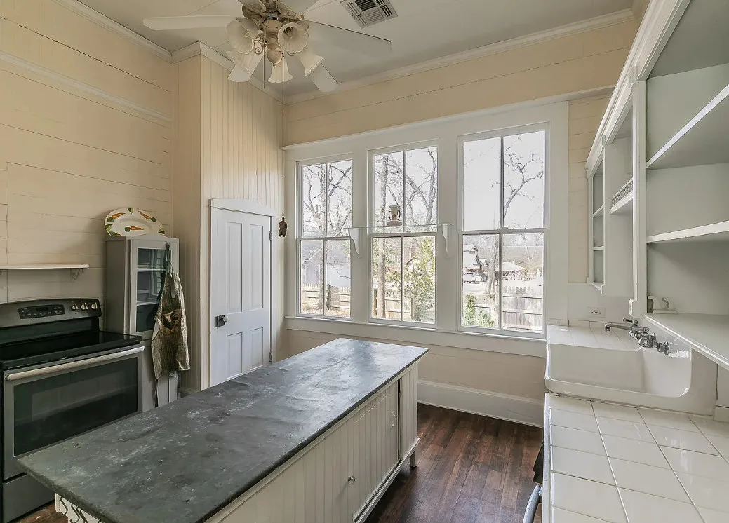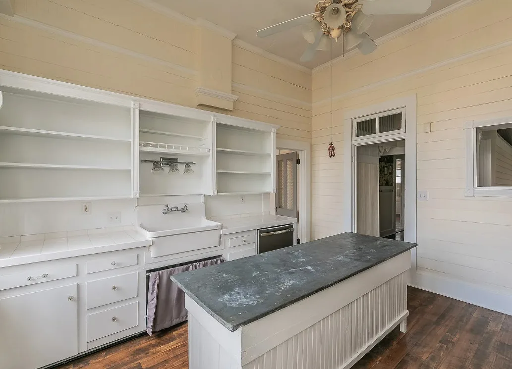 I love the kitchen sink in this house! The screened in porch is nice too! There is a greenhouse on the property. The house was built in 1884. It is located on .50 acre in Palestine, Texas. The house features a covered front porch, jib windows, wood floors, crown moulding, wide baseboards, transom windows, chair rails and a lot of natural light. There is a screened in porch on the back of the house. The property has a detached carriage house and a greenhouse. Three bedrooms, two bathrooms and 2,262 square feet. $215,000