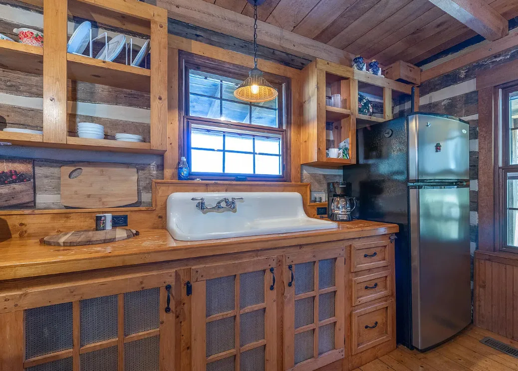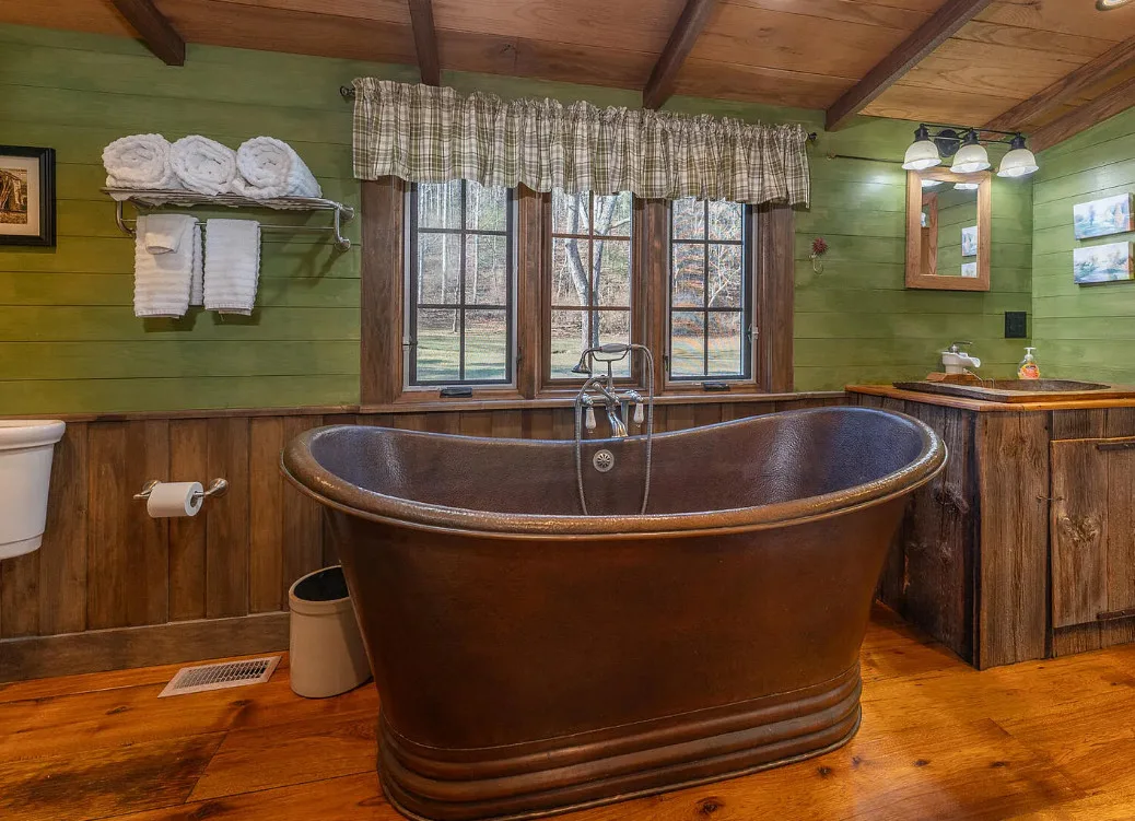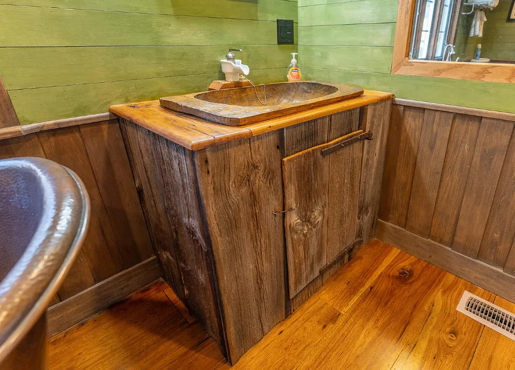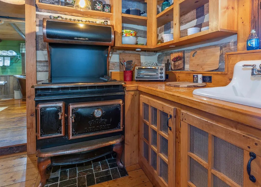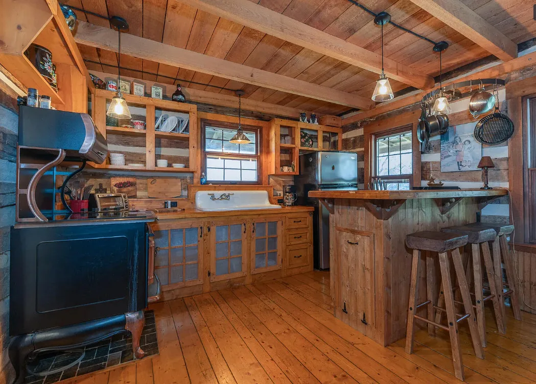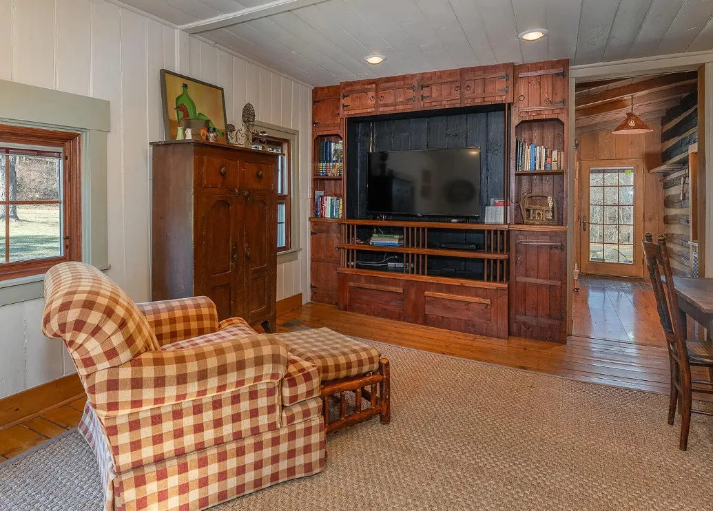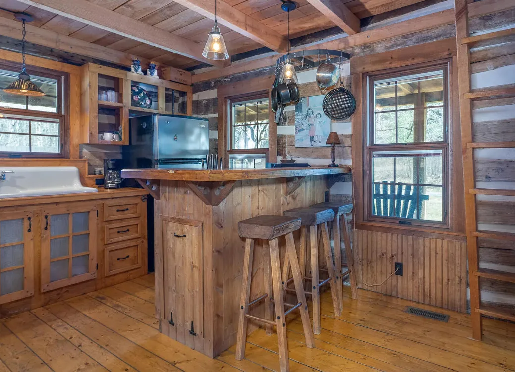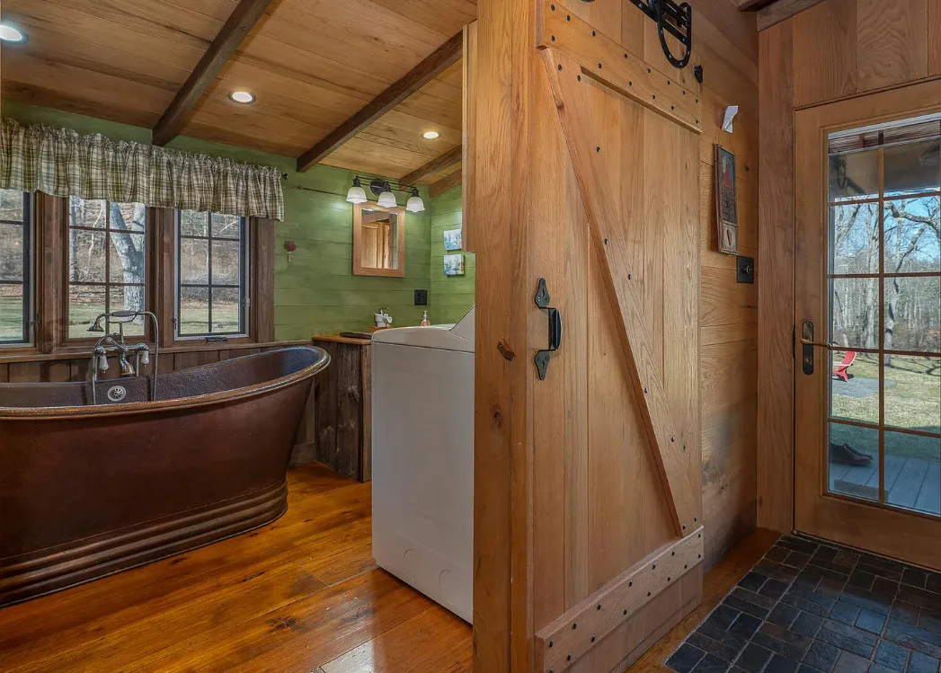 I am in love with this house and property! There are eight outbuildings! Love the interior details! The house was built in 1800. It is located on 4.84 acres in Buchanan, Virginia. The house features a large covered front porch, wood floors, log walls, great stove, pretty kitchen sink, loft area, stone fireplaces, beautiful tub and exposed beams. There are nice outbuildings and pretty scenery! Two bedrooms, one bathroom and 1,553 square feet. $489,000