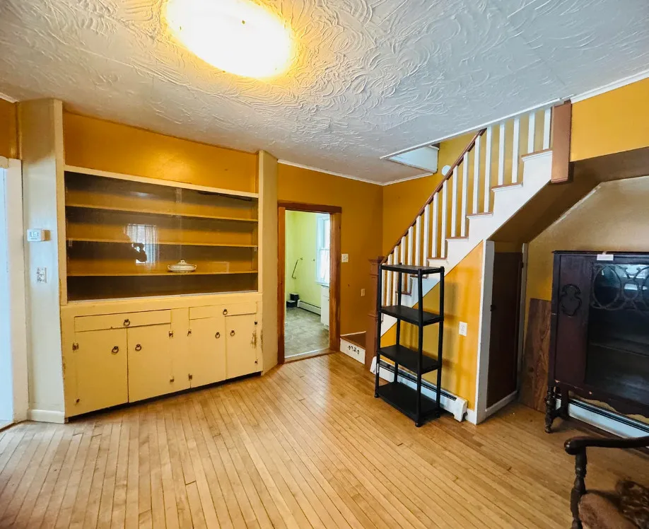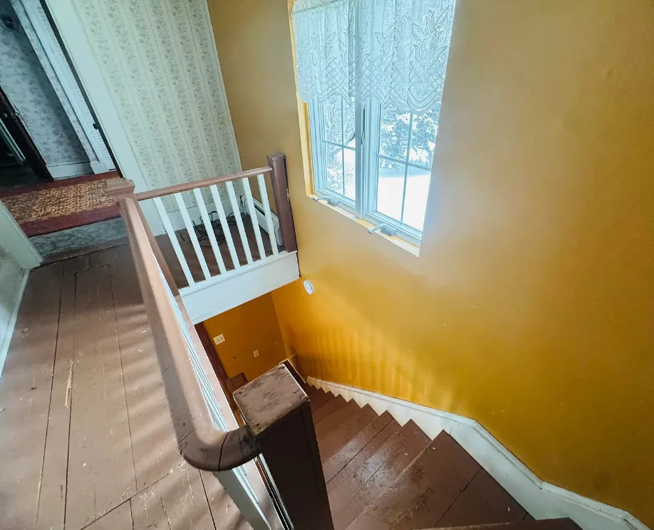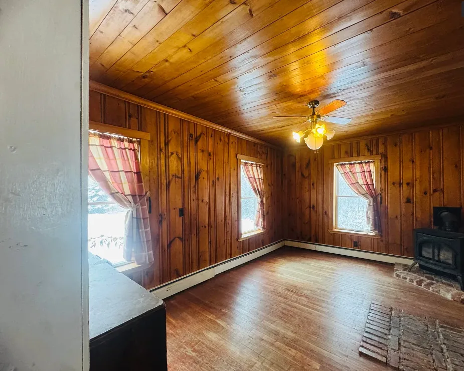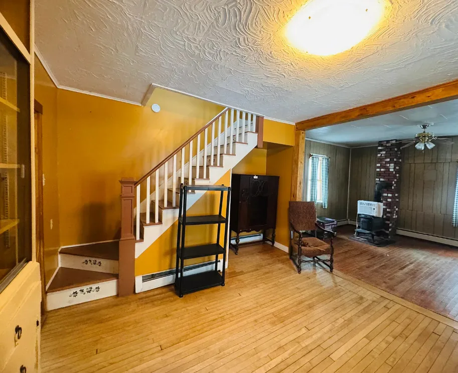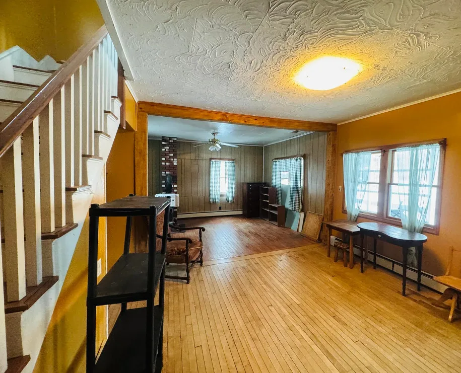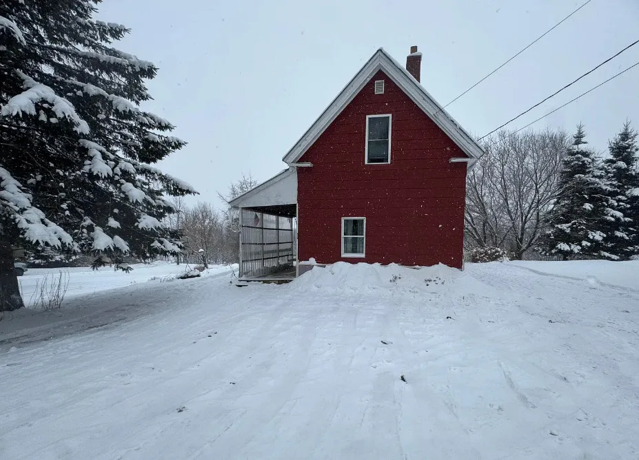 This isn’t a bad house! Would love to see it in the summer! The house was built in 1880. It is located on 2.95 acres in Presque Isle, Maine. The house features a partially enclosed porch, some wood floors, nice staircase and built-ins. The river is on the back of the property. Four bedrooms, one bathroom and 1,368 square feet. $128,500