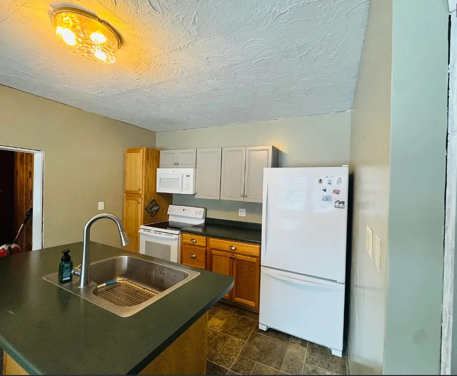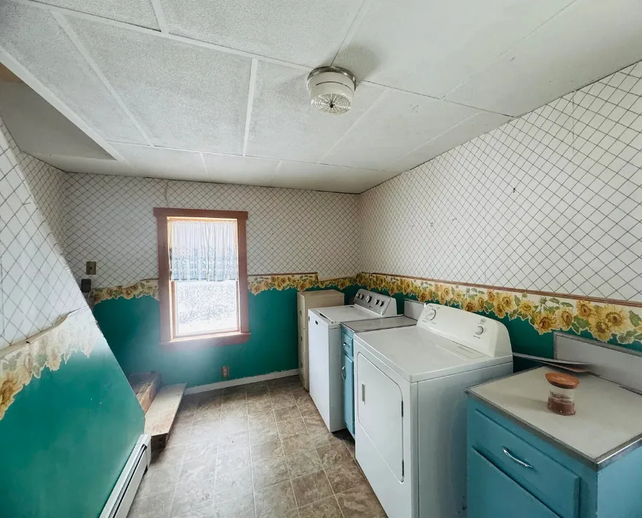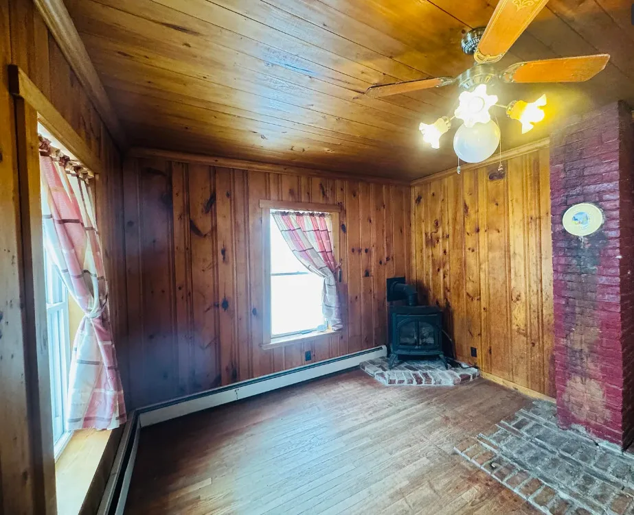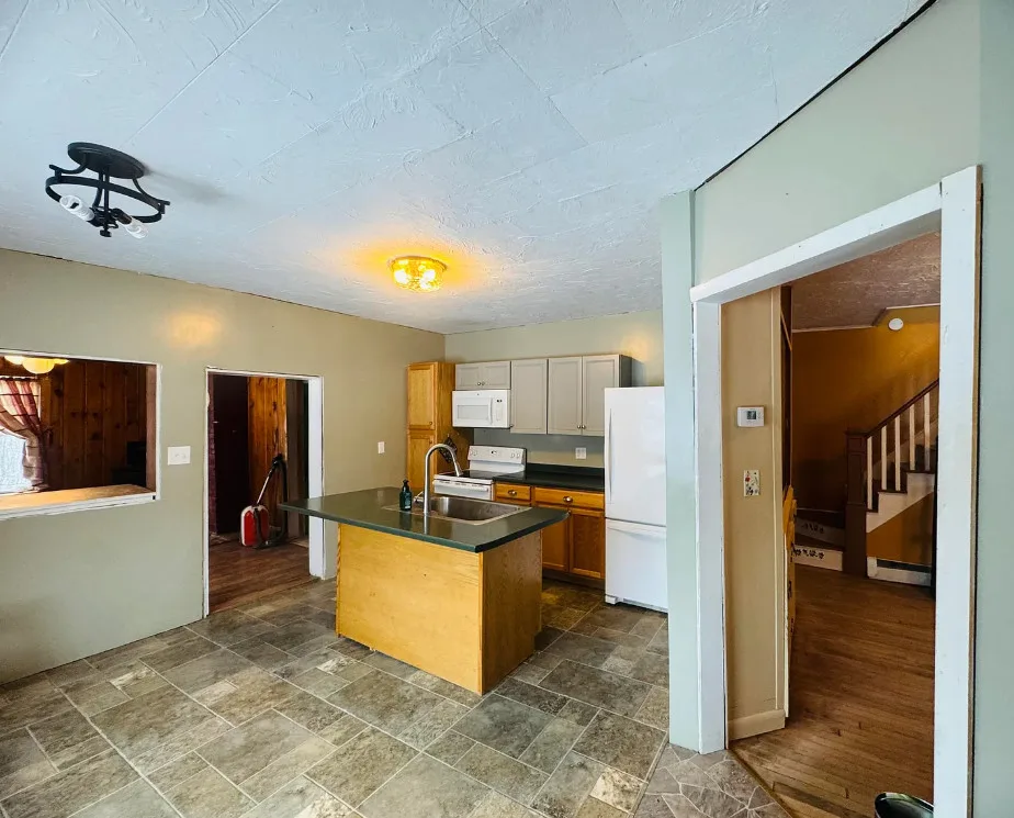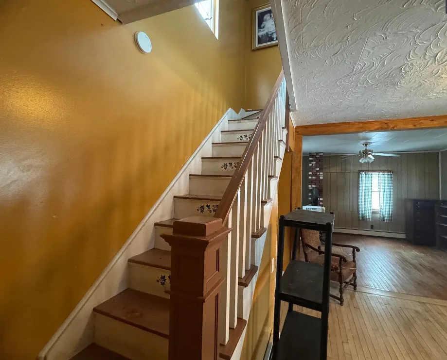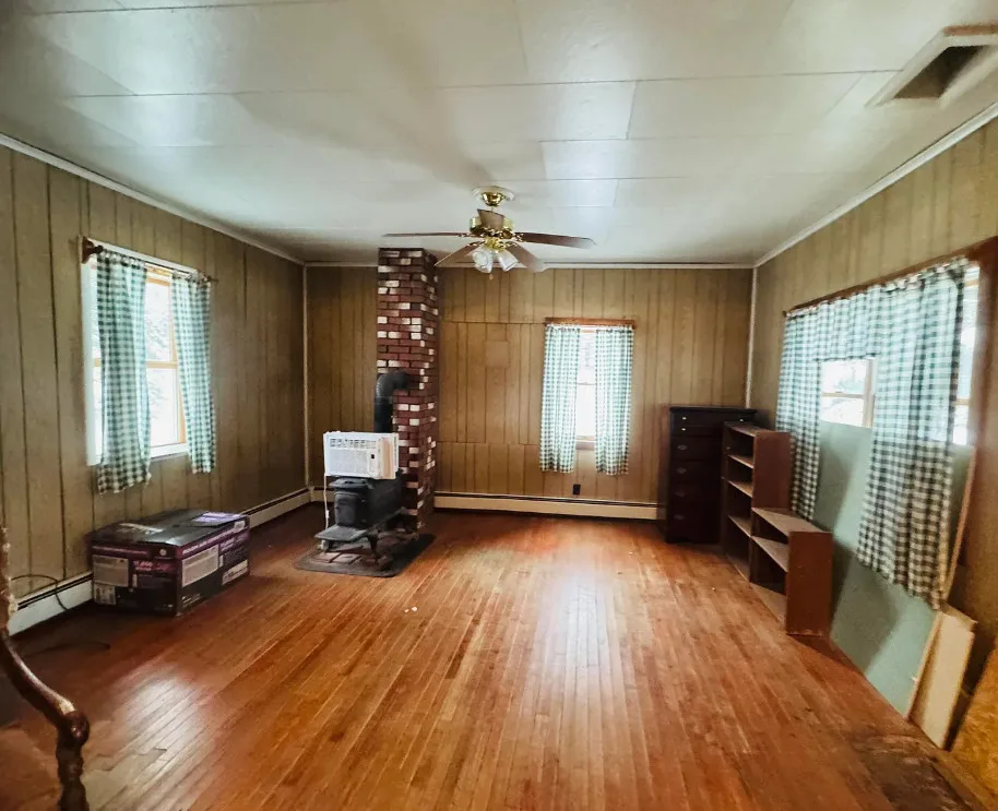This isn’t a bad house! Would love to see it in the summer! The house was built in 1880. It is located on 2.95 acres in Presque Isle, Maine. The house features a partially enclosed porch, some wood floors, nice staircase and built-ins. The river is on the back of the property. Four bedrooms, one bathroom and 1,368 square feet. $128,500