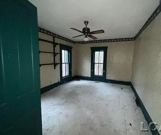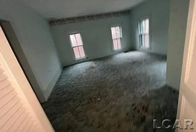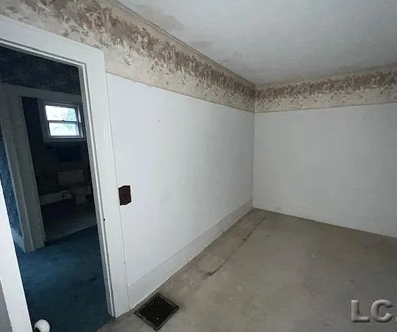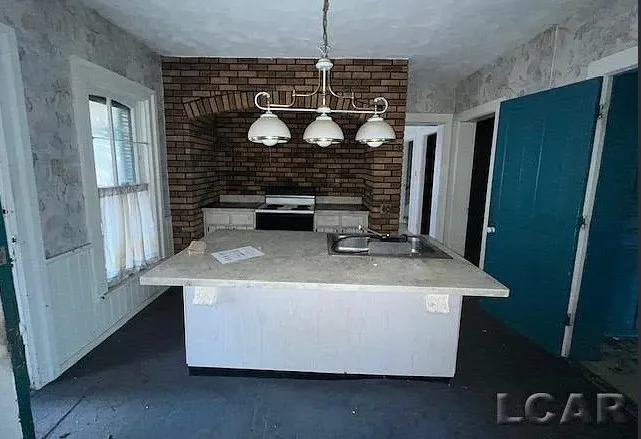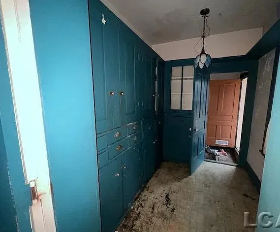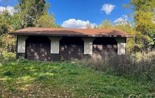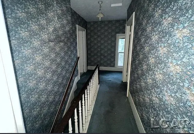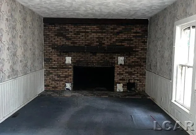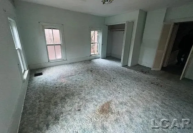 Love the sunroom and that chimney is unique! The house was built in the 1870’s. It is located on 6.5 acres in Addison, Michigan. The house features a covered front porch, large chimney, large fireplace, wainscoting, bay windows and baseboards. The house definitely needs some carpet removal! There are a couple of outbuildings, including a four car carriage house. Three bedrooms, two bathrooms and 2,318 square feet. $169,900