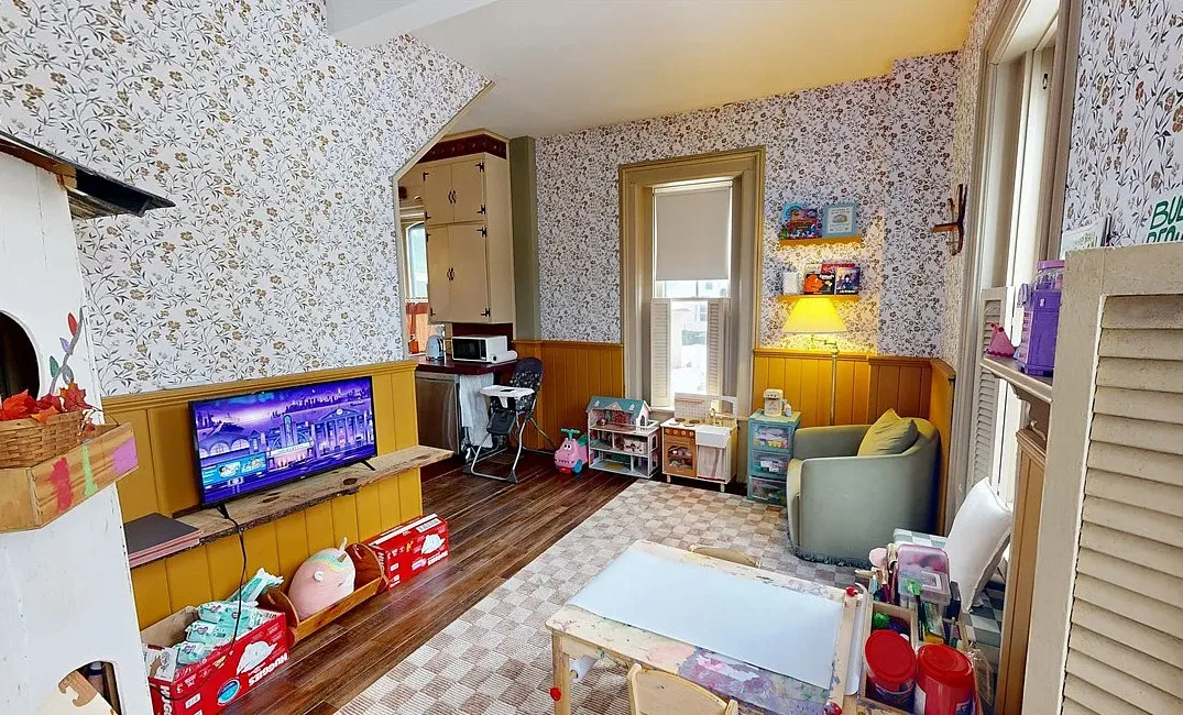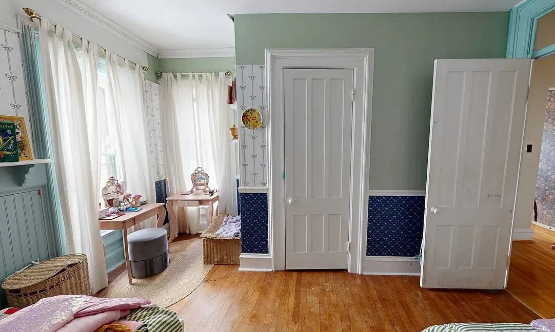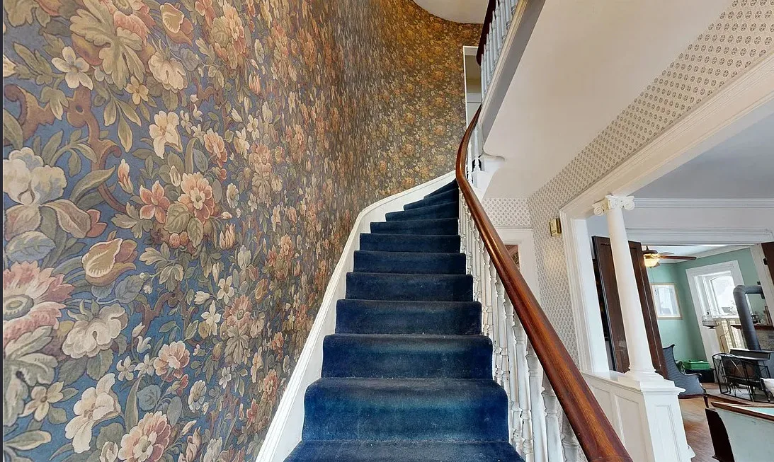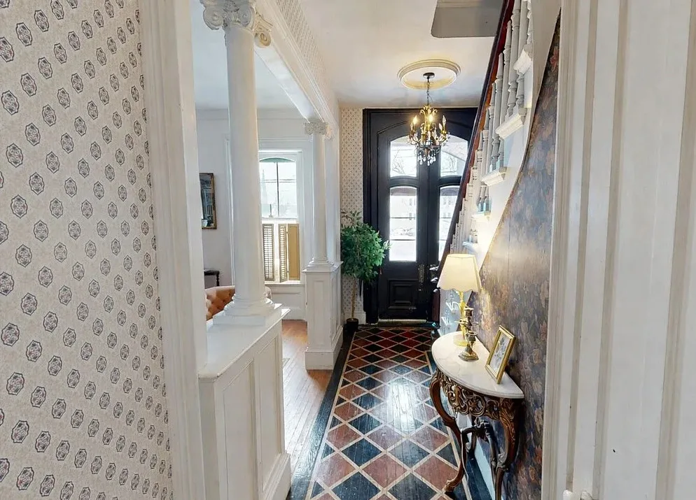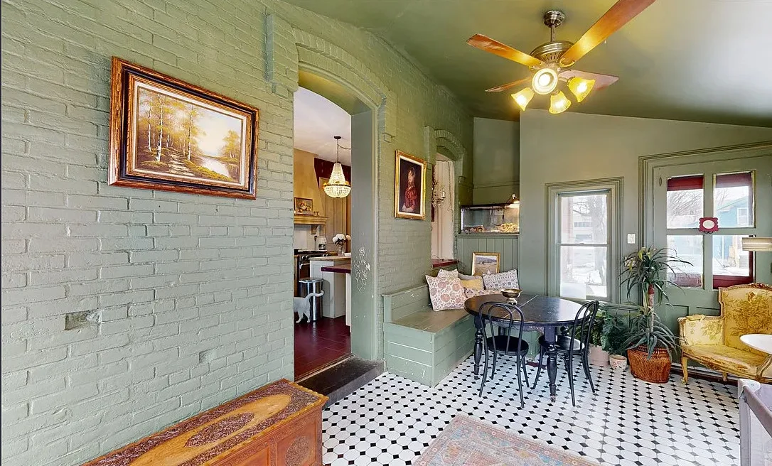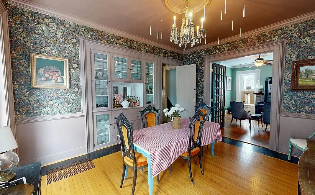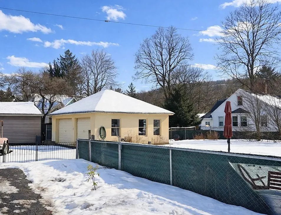 This house has a pretty interior! I love that staircase and there are a lot of nice details. The house was built in 1900. It is located on .25 acre in Norwich, New York. The house features two small covered porches, wood floors, pretty staircase, crown moulding, ceiling medallions, built-ins, french doors, beautiful built-in china cabinet and wainscoting. There is a large attic for storage. The backyard is fenced and there is a detached garage. Four bedrooms, three bathrooms and 2,898 square feet. $249,900