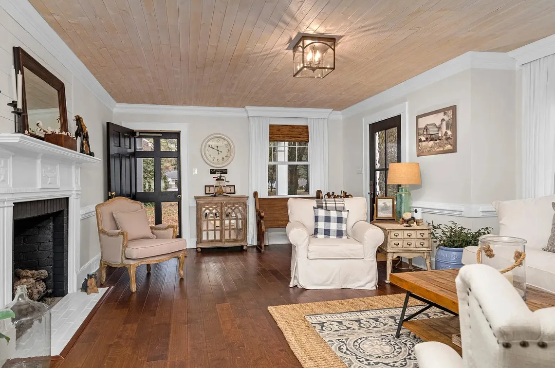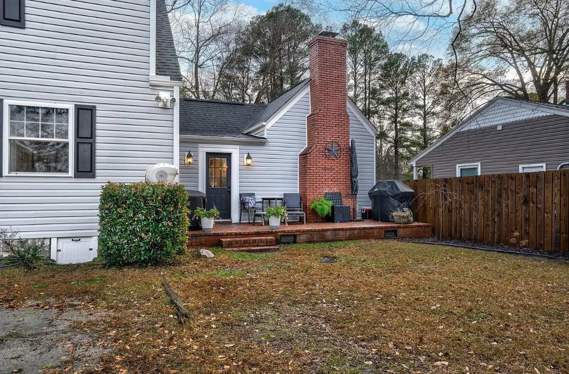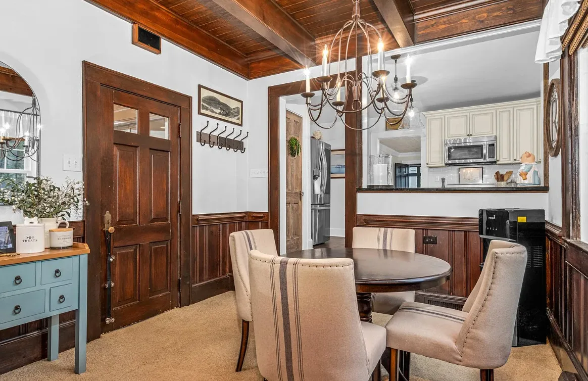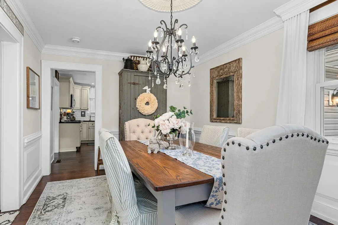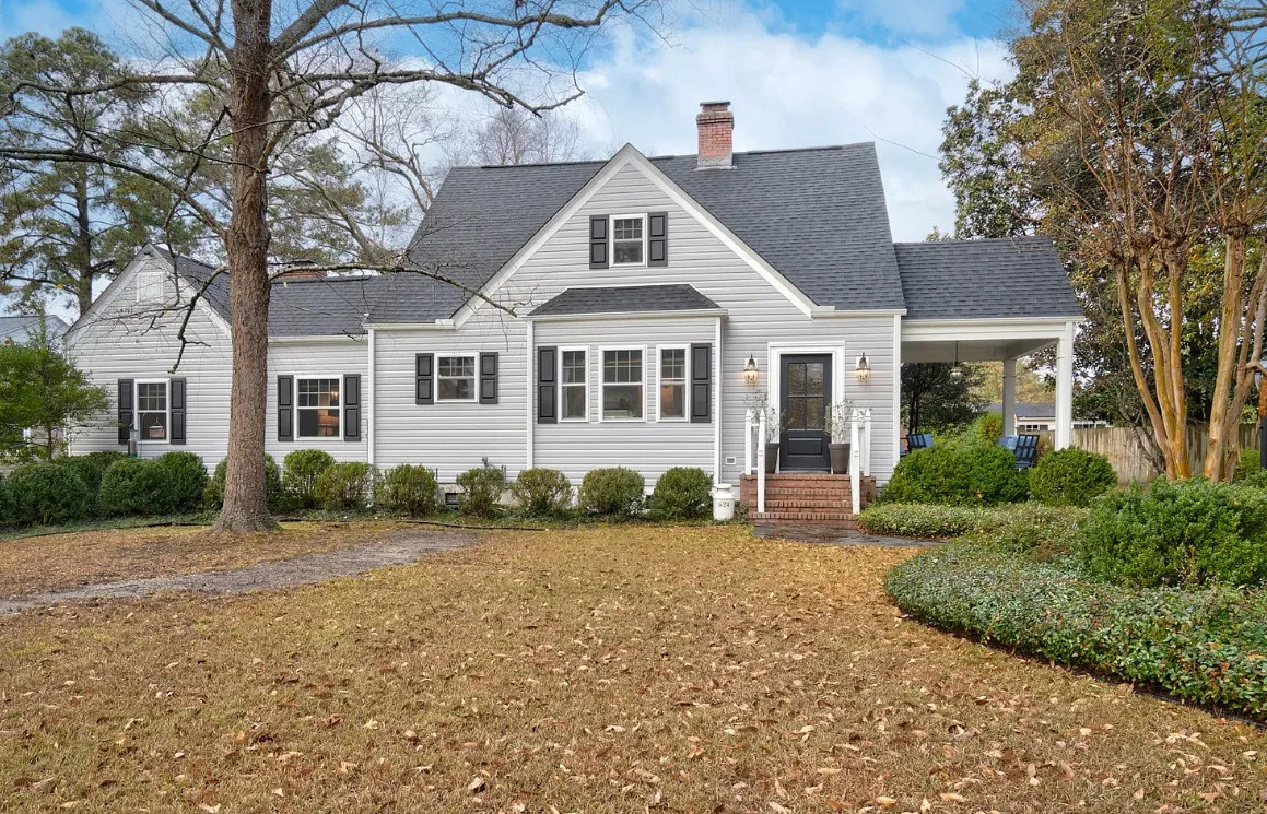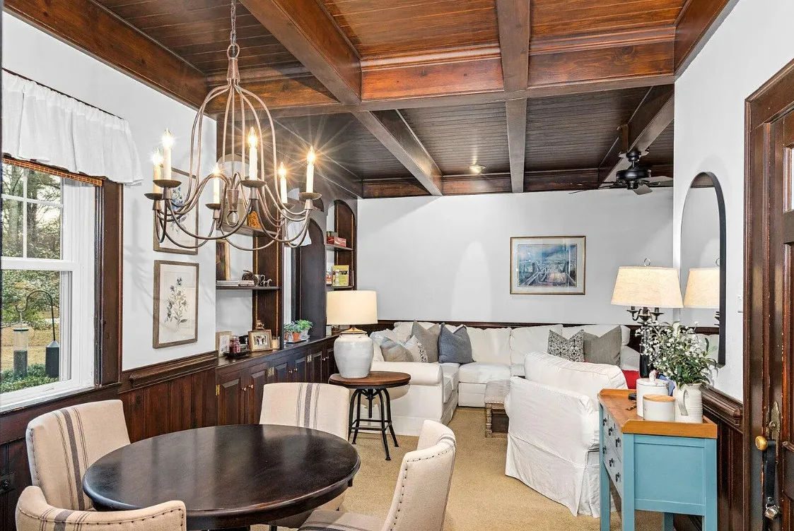 This house has a pretty interior! The home was built in 1948. It is located on .38 acre in Enfield, North Carolina. The house features a covered side porch, chair rails, crown moulding, paneled wainscoting, crystal chandelier, updated kitchen, coffered ceiling, built-in bookshelves, bead board and a brick fireplace. There is a fenced in backyard with a patio area and a detached storage shed. Four bedrooms, two bathrooms and 2,294 square feet. $278,000