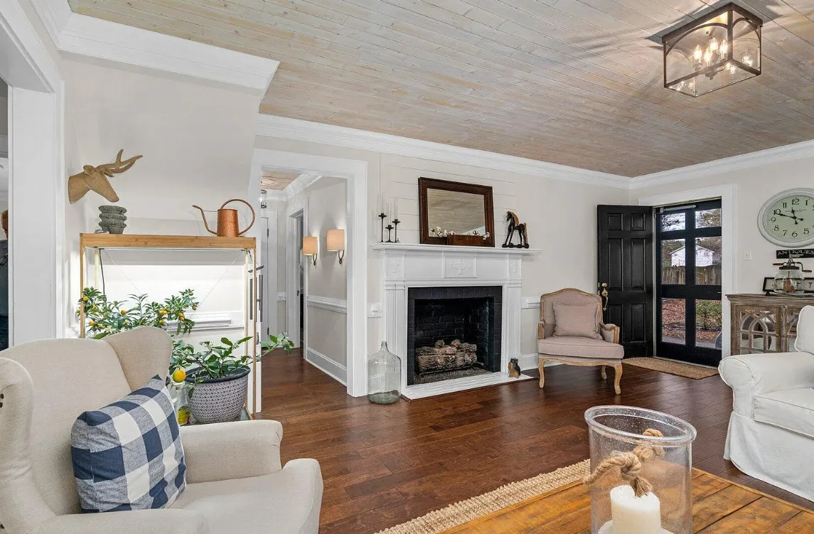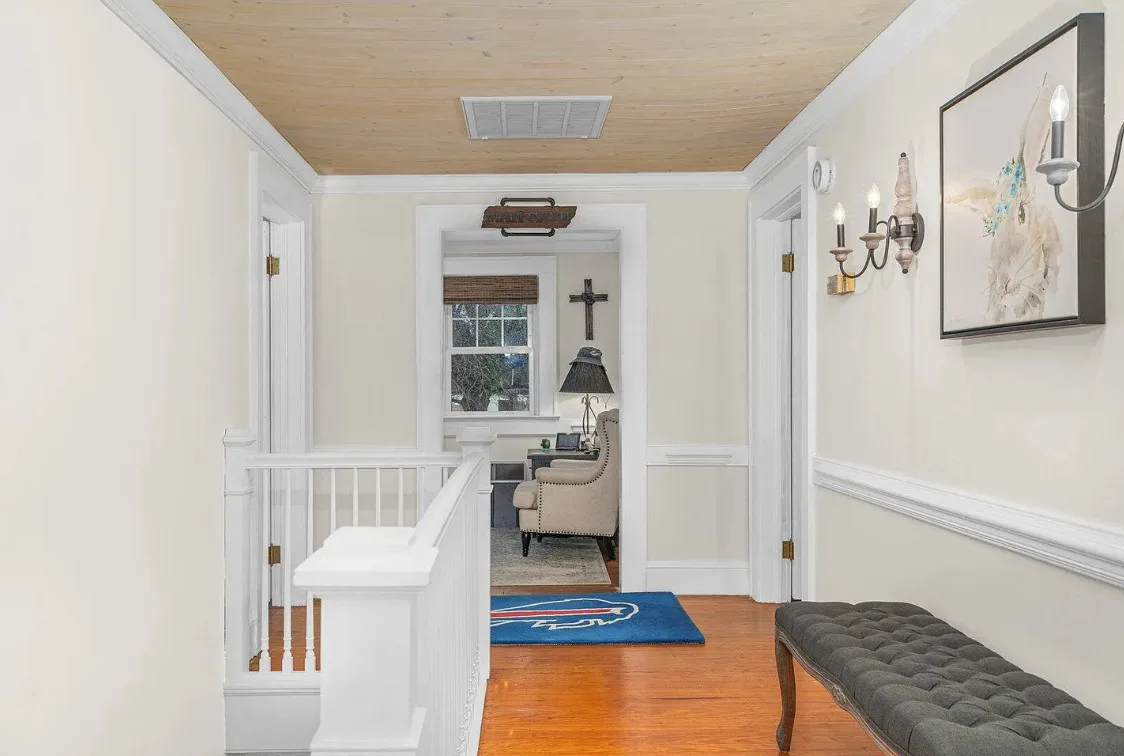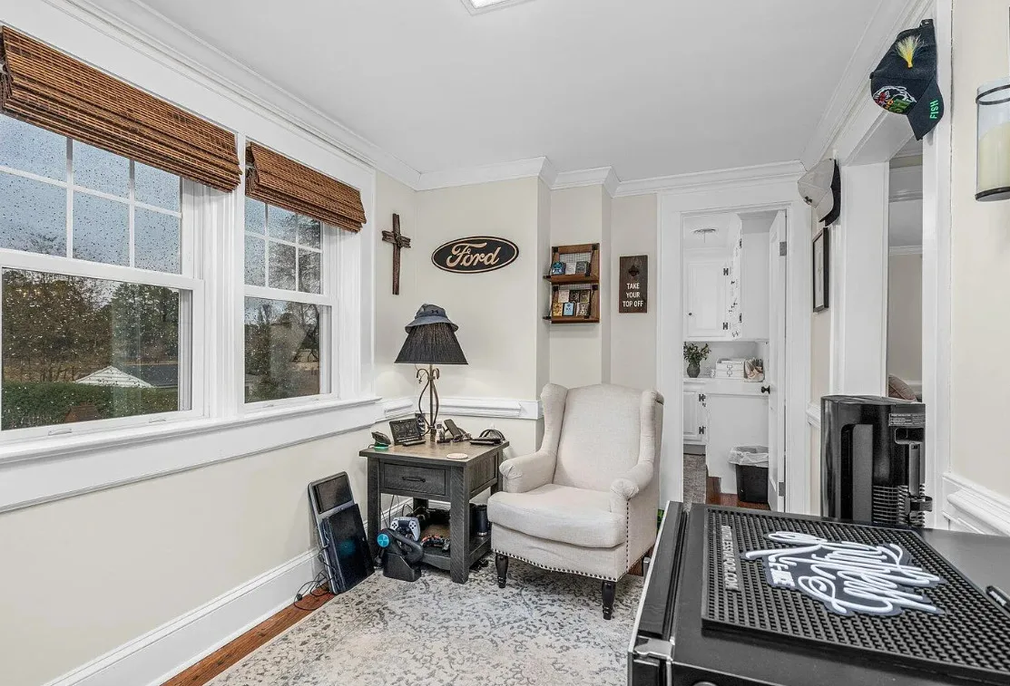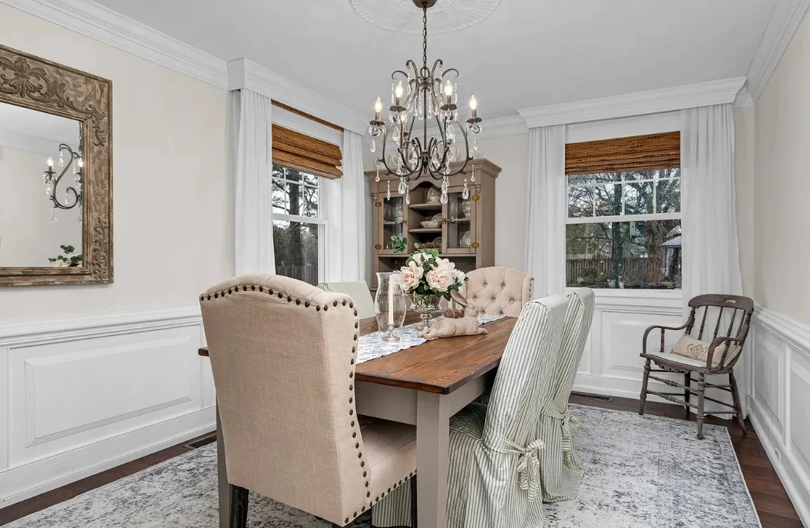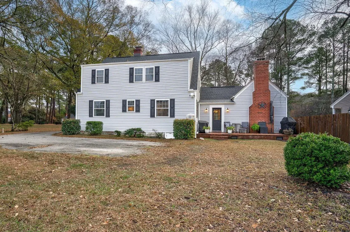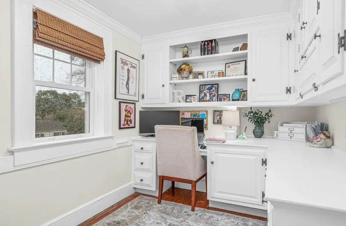 This house has a pretty interior! The home was built in 1948. It is located on .38 acre in Enfield, North Carolina. The house features a covered side porch, chair rails, crown moulding, paneled wainscoting, crystal chandelier, updated kitchen, coffered ceiling, built-in bookshelves, bead board and a brick fireplace. There is a fenced in backyard with a patio area and a detached storage shed. Four bedrooms, two bathrooms and 2,294 square feet. $278,000