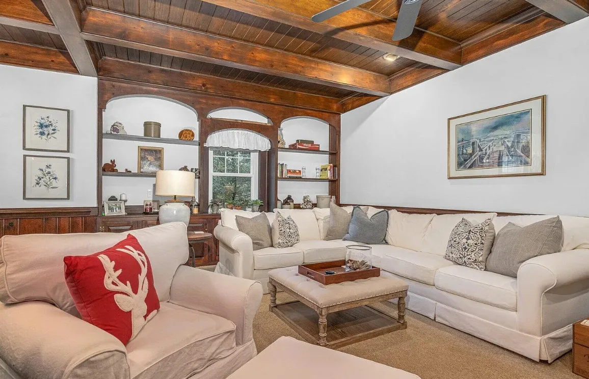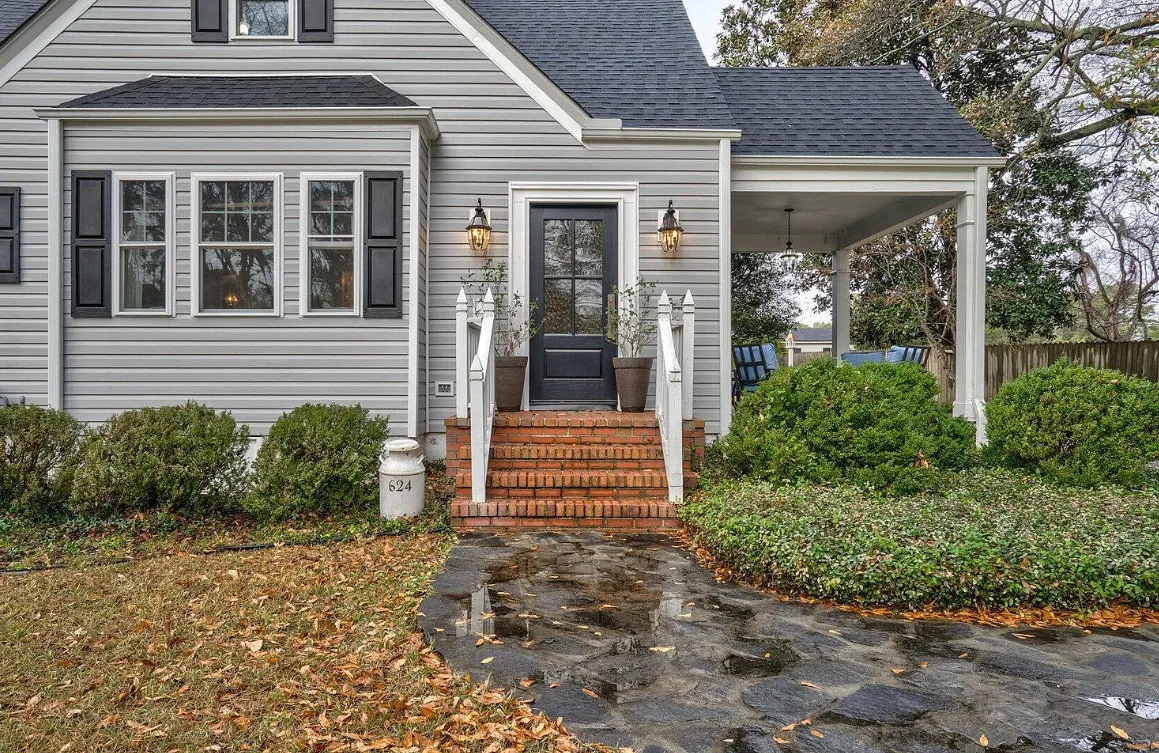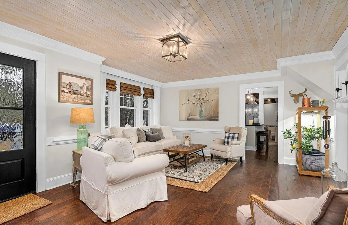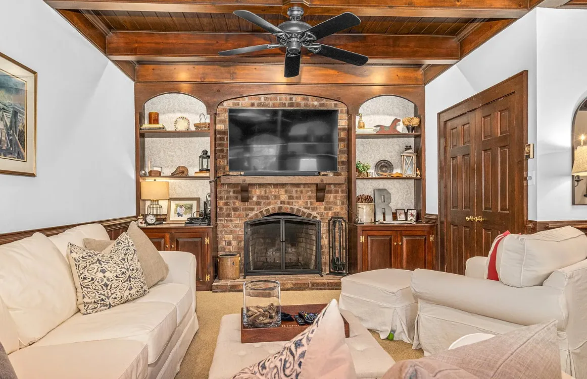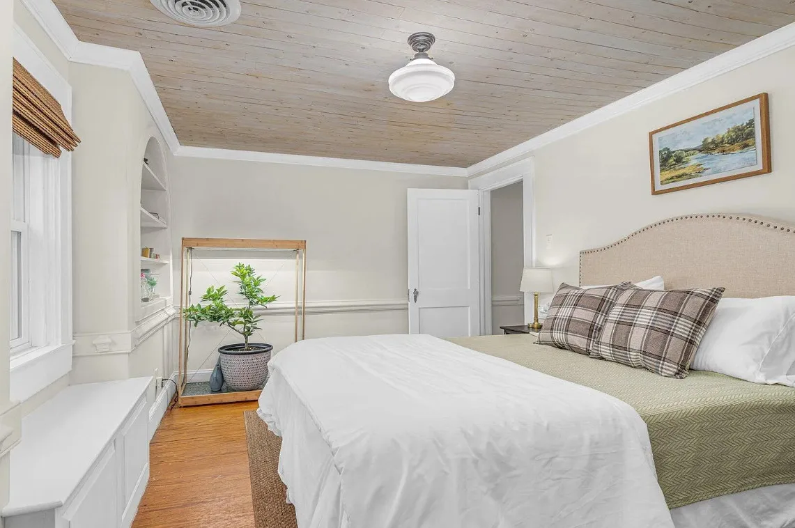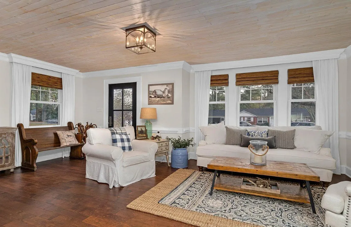 This house has a pretty interior! The home was built in 1948. It is located on .38 acre in Enfield, North Carolina. The house features a covered side porch, chair rails, crown moulding, paneled wainscoting, crystal chandelier, updated kitchen, coffered ceiling, built-in bookshelves, bead board and a brick fireplace. There is a fenced in backyard with a patio area and a detached storage shed. Four bedrooms, two bathrooms and 2,294 square feet. $278,000