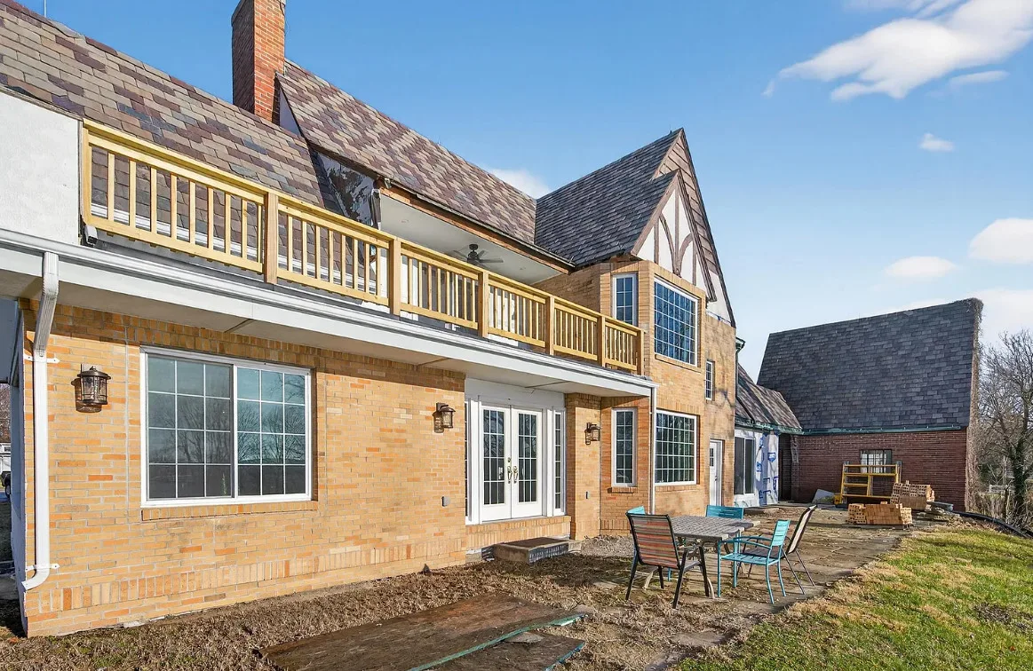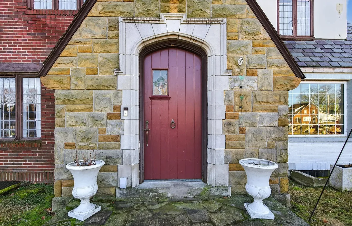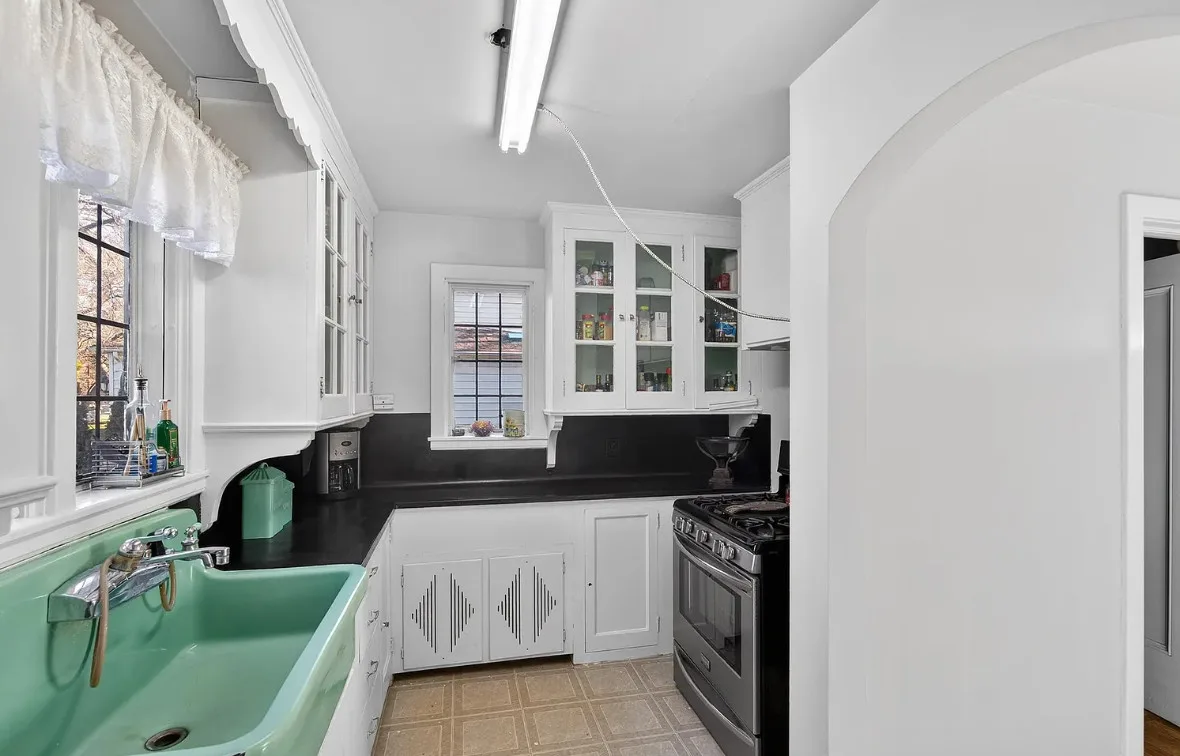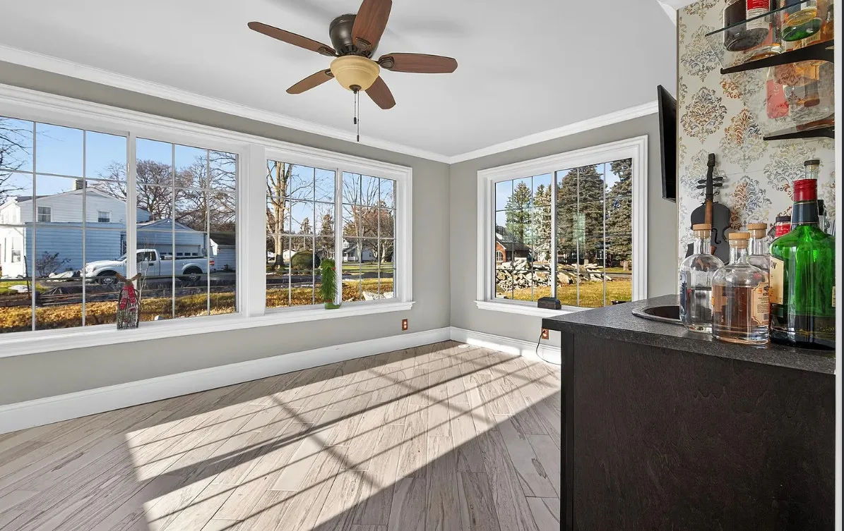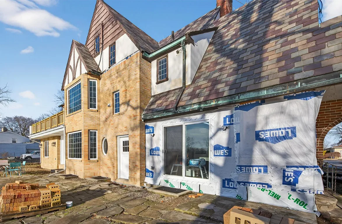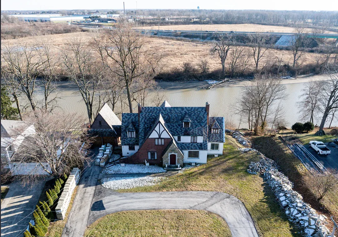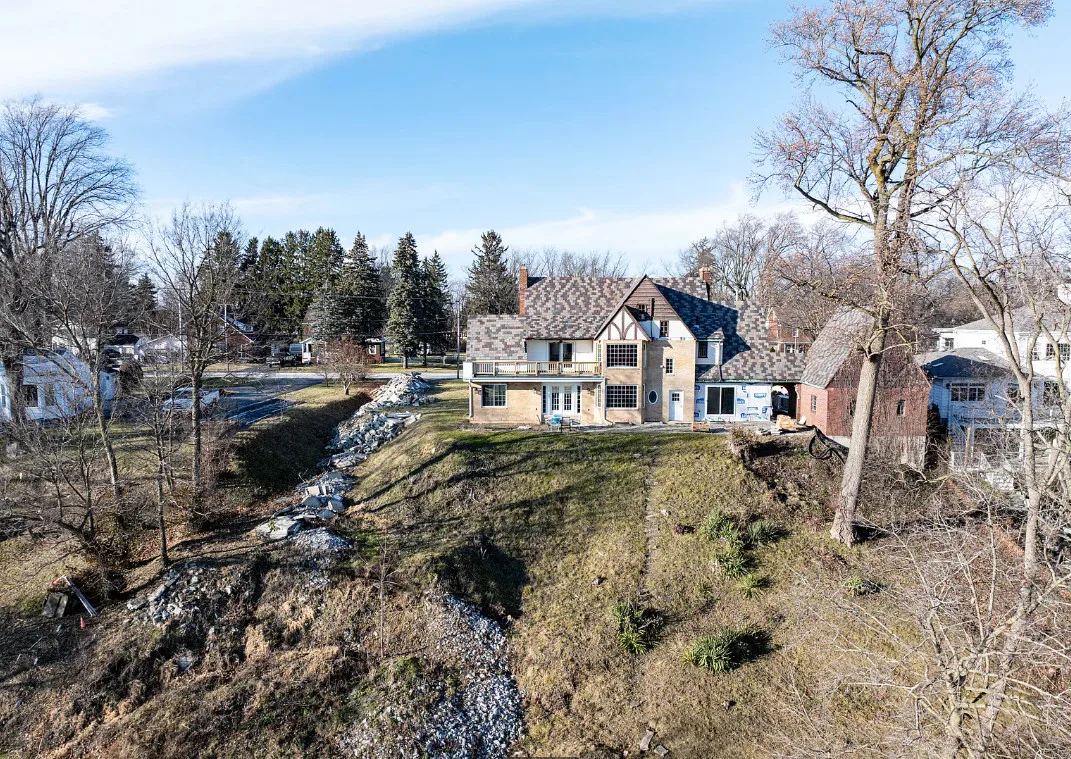 I want that kitchen sink! Curious what is going on with the backyard. I am suspecting that river can be an issue. The house was built in 1930. It is located on .77 acres in Fremont, Ohio. The house features wood floors, built-in bookshelves, a lot of natural light, pretty sunroom, crown moulding, large fireplace, arched entryway, large back patio, finished basement and a back upper porch. A lot of work has been done on this house. Construction supplies will convey. Three bedrooms, three bathrooms and 3,149 square feet. $347,500