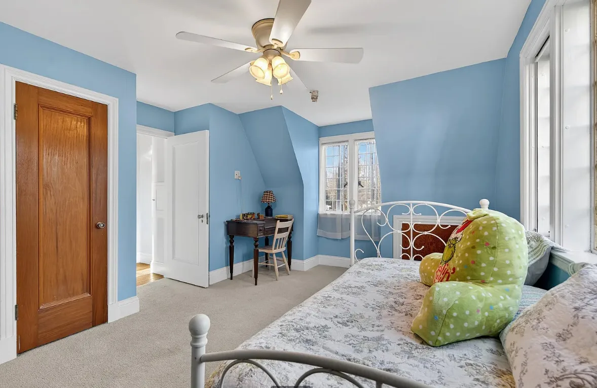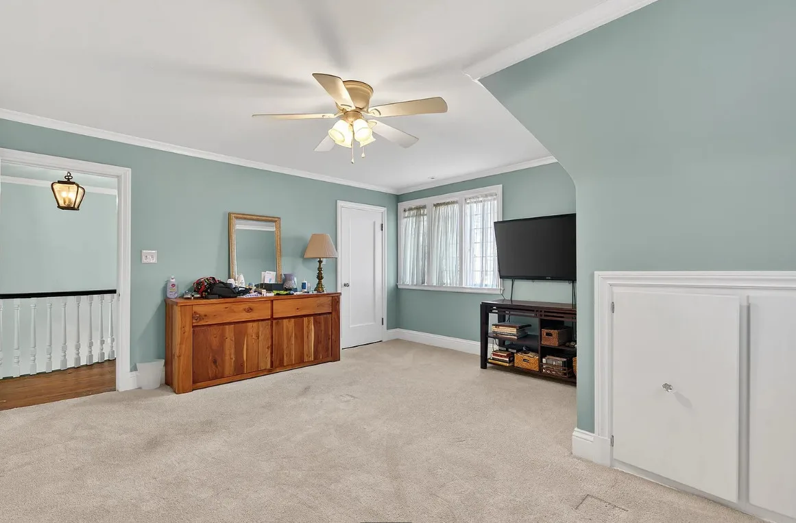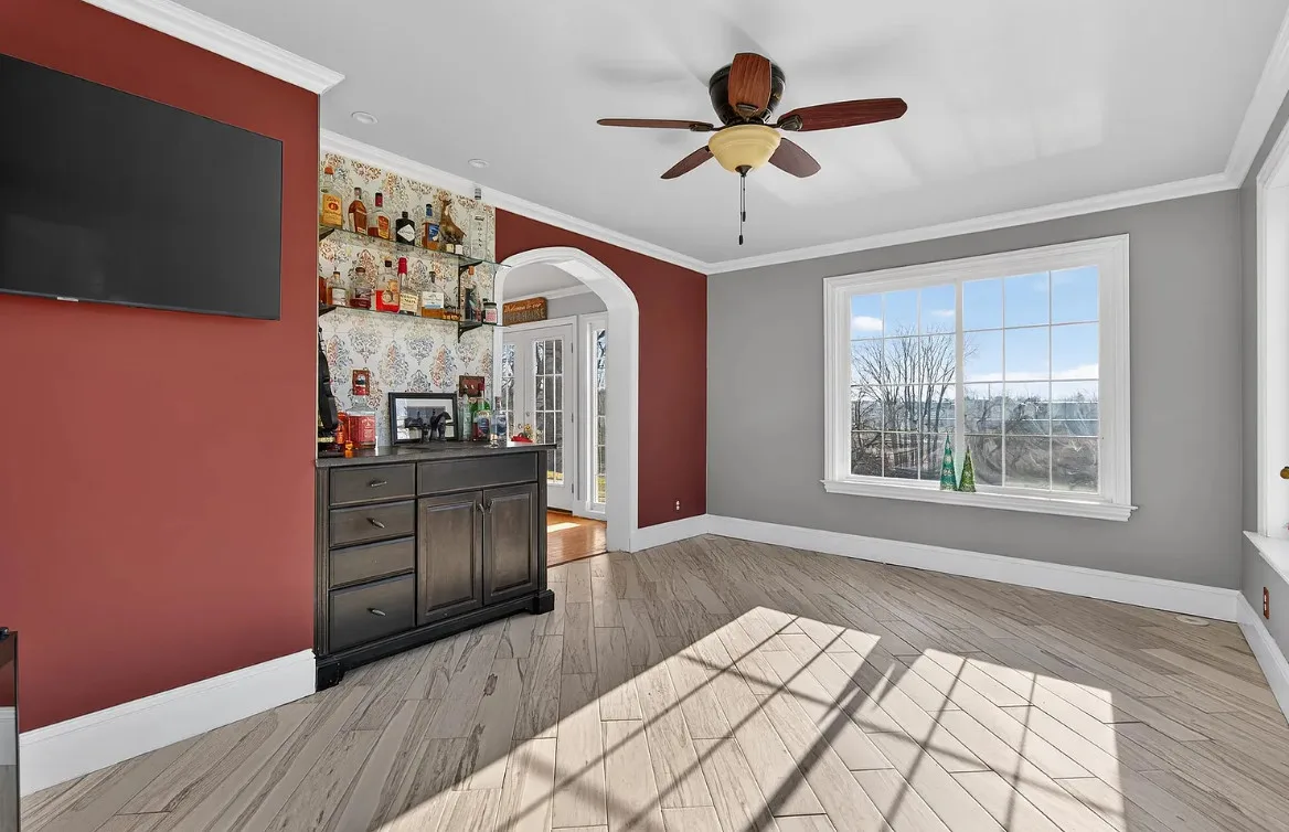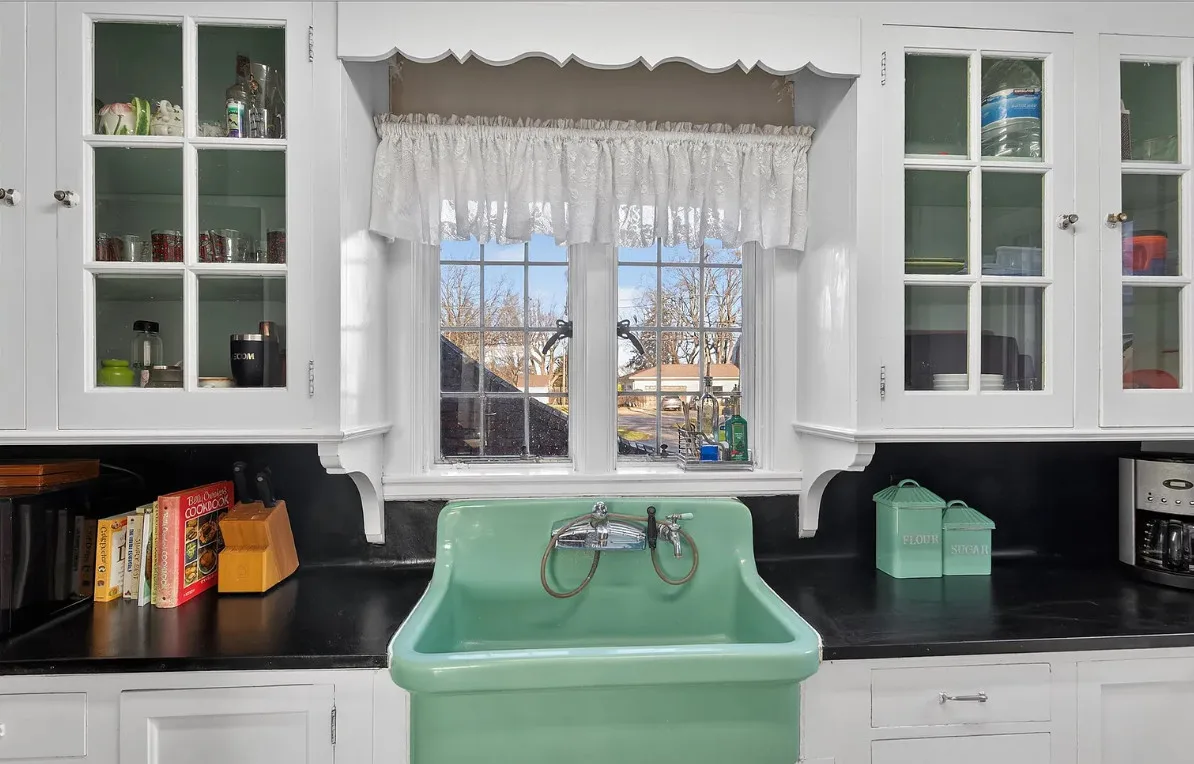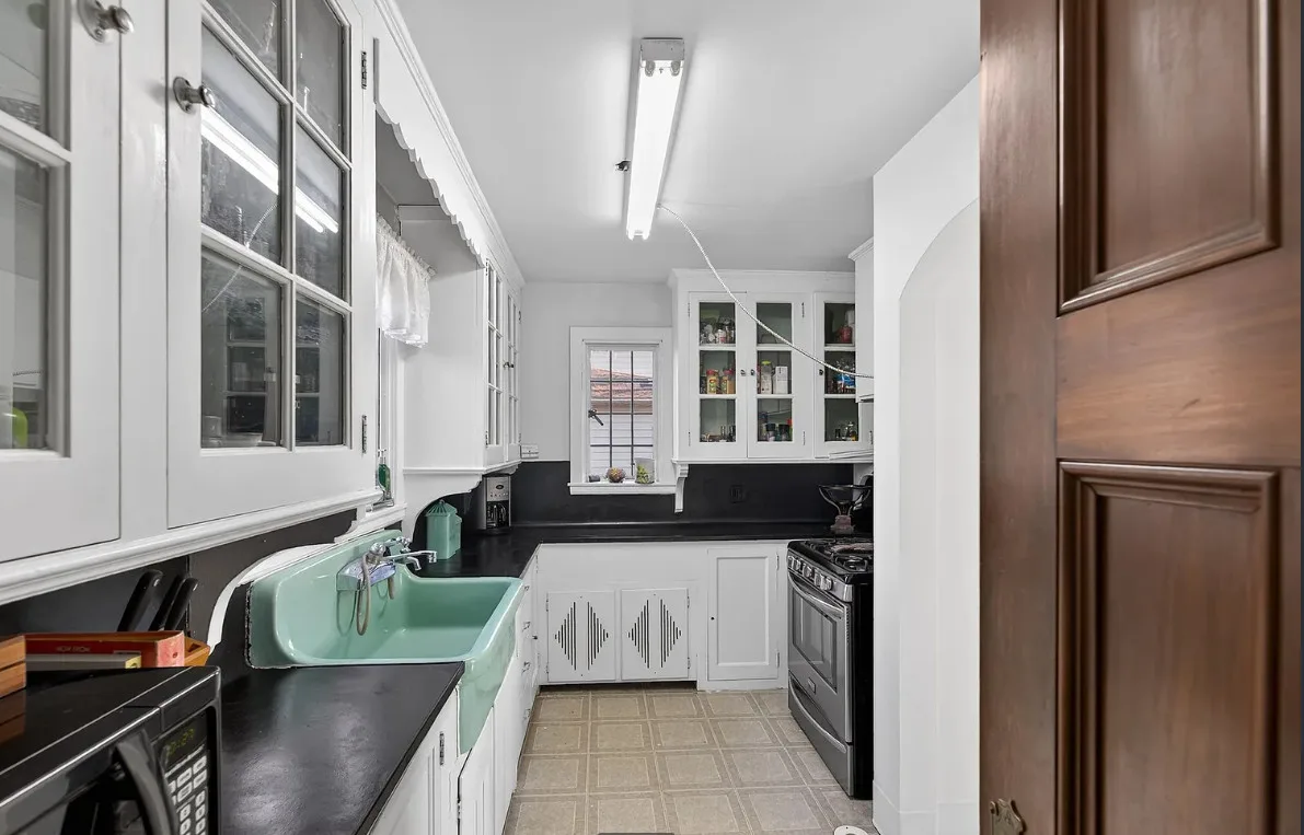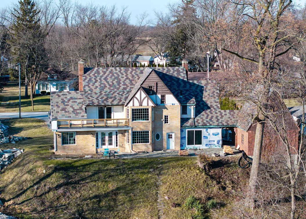 I want that kitchen sink! Curious what is going on with the backyard. I am suspecting that river can be an issue. The house was built in 1930. It is located on .77 acres in Fremont, Ohio. The house features wood floors, built-in bookshelves, a lot of natural light, pretty sunroom, crown moulding, large fireplace, arched entryway, large back patio, finished basement and a back upper porch. A lot of work has been done on this house. Construction supplies will convey. Three bedrooms, three bathrooms and 3,149 square feet. $347,500