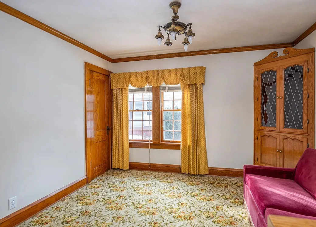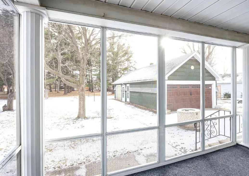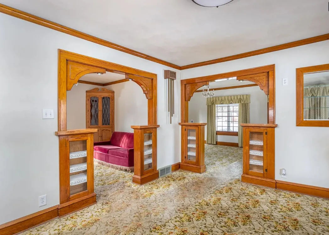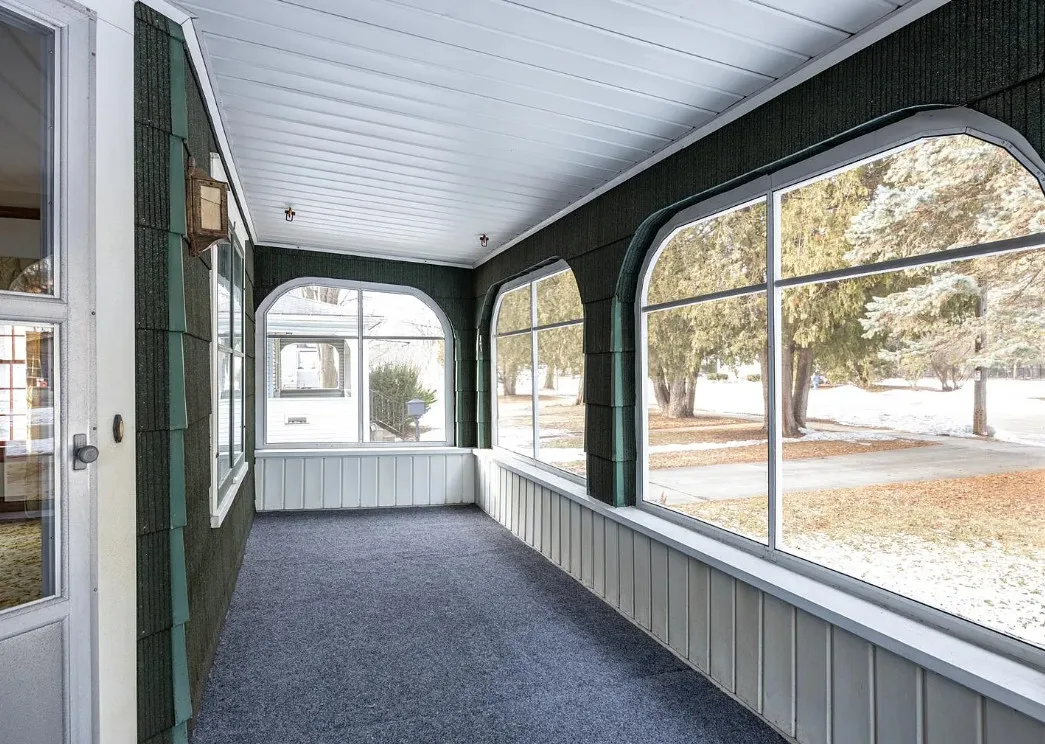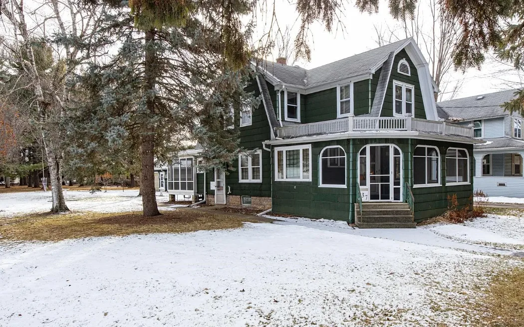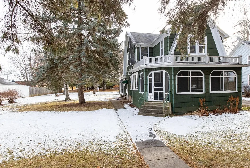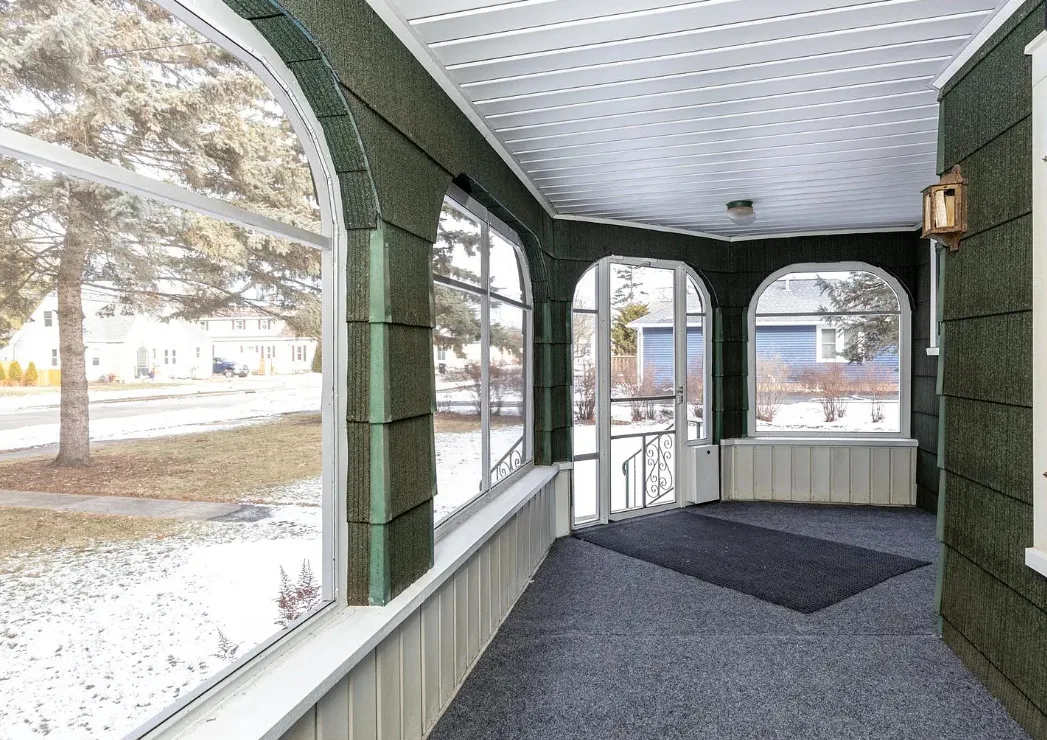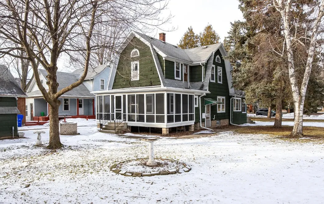 This house has a unique porch! The interior is nice! The house was built in 1900. It is located on .84 acre in Appleton, Wisconsin. The house features an enclosed wrap around front porch, butler’s pantry, crown moulding, wood floors, baseboards, updated kitchen and built-ins. The house has a basement, large backyard and a detached garage. Four bedrooms, two bathrooms and 1,864 square feet. $319,900