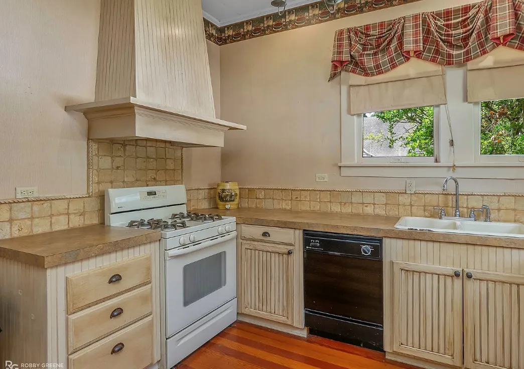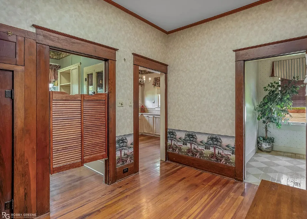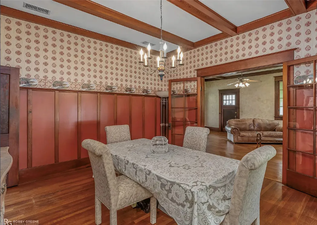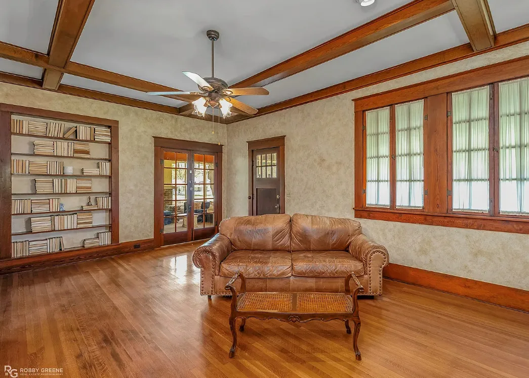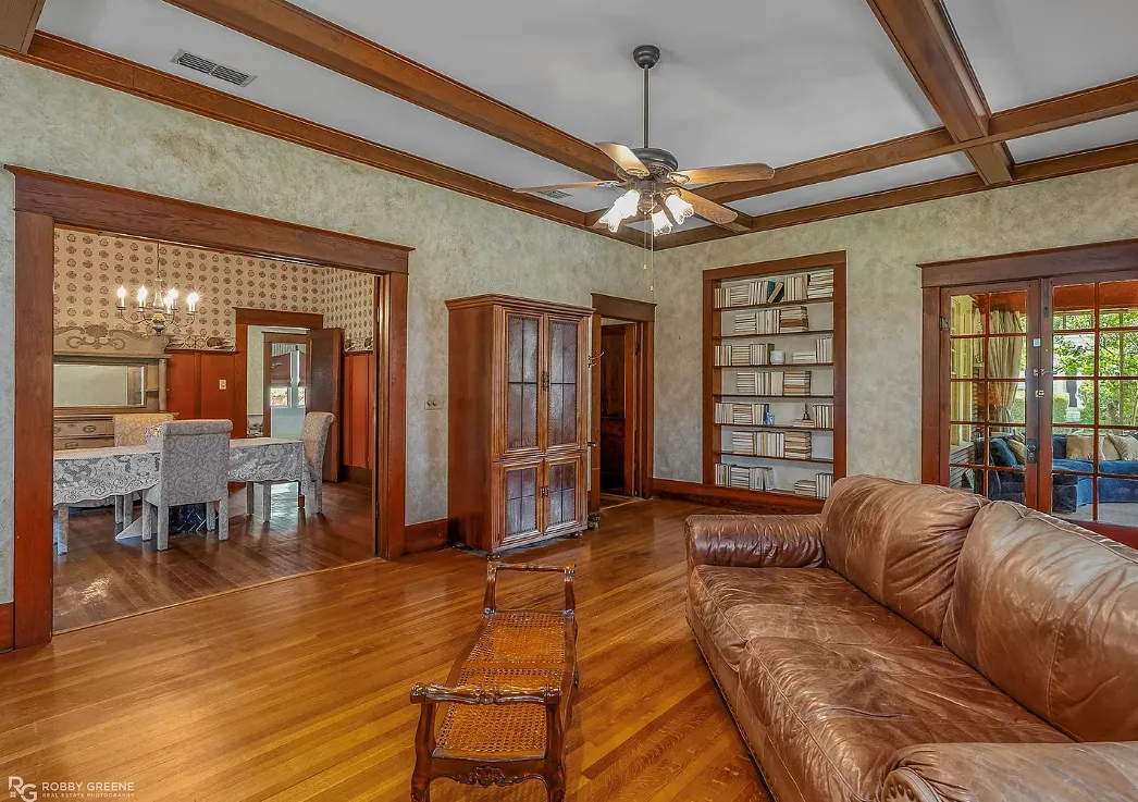 I love the screened in porch! This is a Sears Craftsman Bungalow. The house was built in 1918. It is located on .43 acre in Minden, Louisiana. The house could use some updating and undoing of previous renovations. The house features a covered front porch, a screened in porch, wood floors, coffered ceiling, built-in bookshelves, pocket doors, french doors, wainscoting, baseboards and vintage tiled bathrooms. There is a detached garage on the property. Three bedrooms, two bathrooms and 1,837 square feet. $199,500
