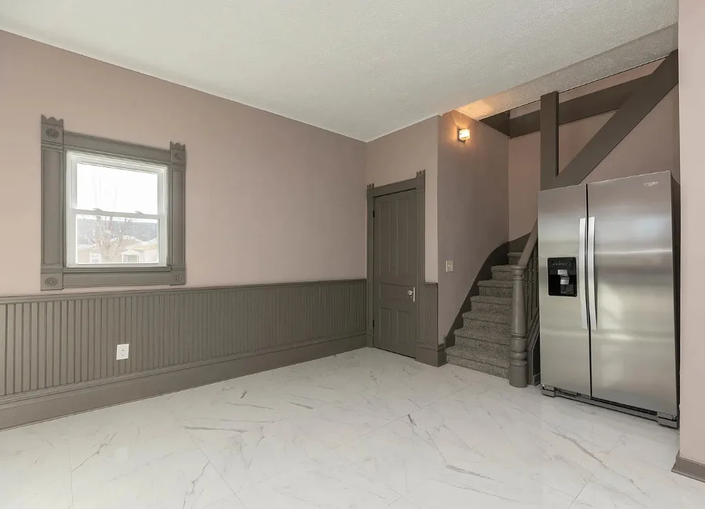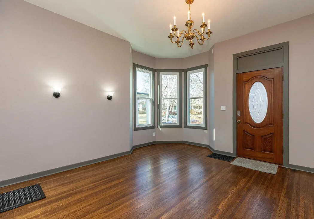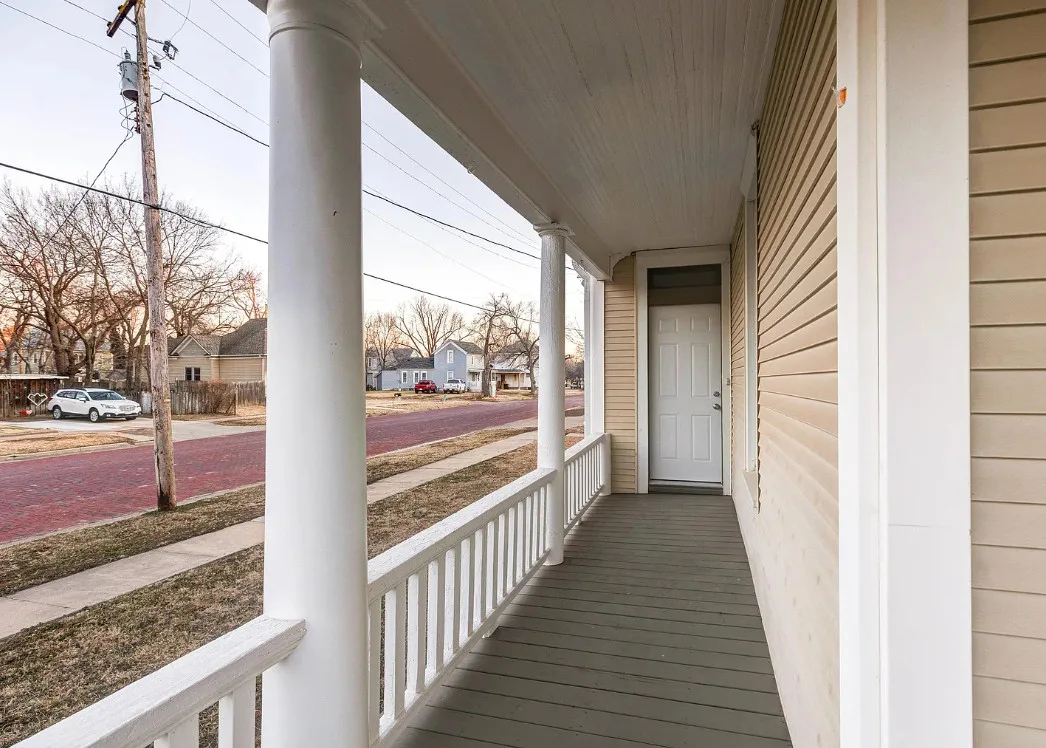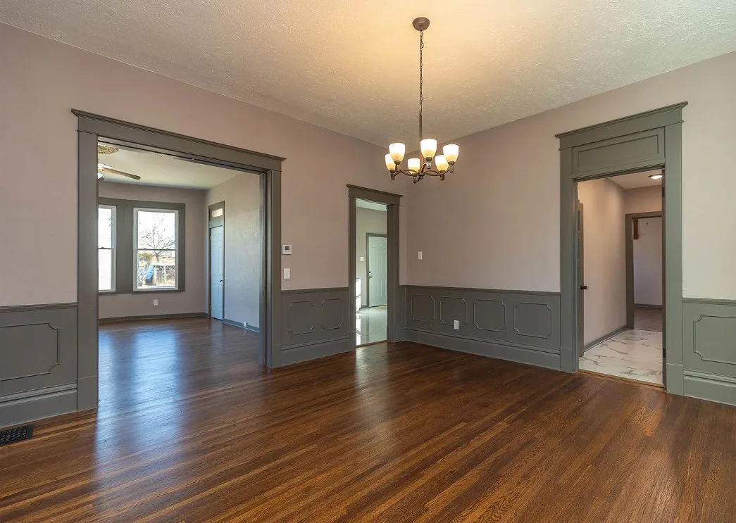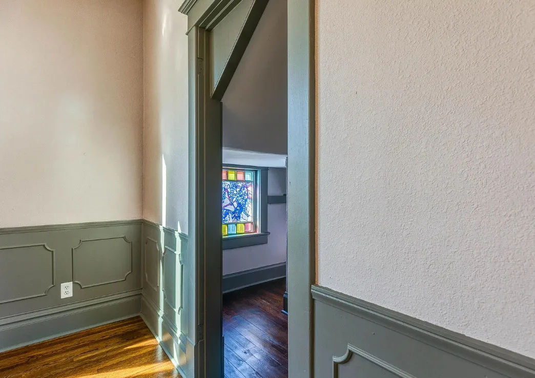 This house has pretty wood floors and wainscoting! I love a house that has a second staircase in the kitchen! The house was built in 1920. It is located in Salina, Kansas. The house features a large covered front porch, beautiful wood floors, pretty wainscoting, baseboards, pocket doors, bay windows, stained glass and a spacious kitchen. The interior could use some color, but paint is an easy fix. There is a large basement and a garage. I like the brick street! Five bedrooms, two bathrooms and 3,683 square feet. $249,000
