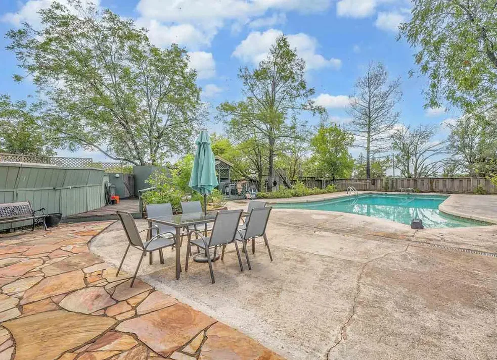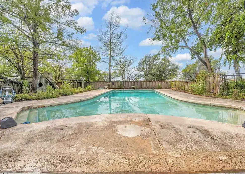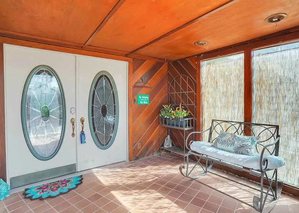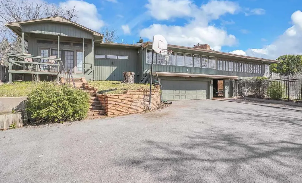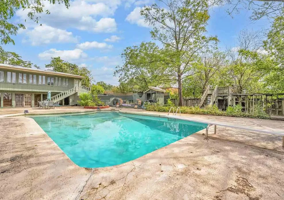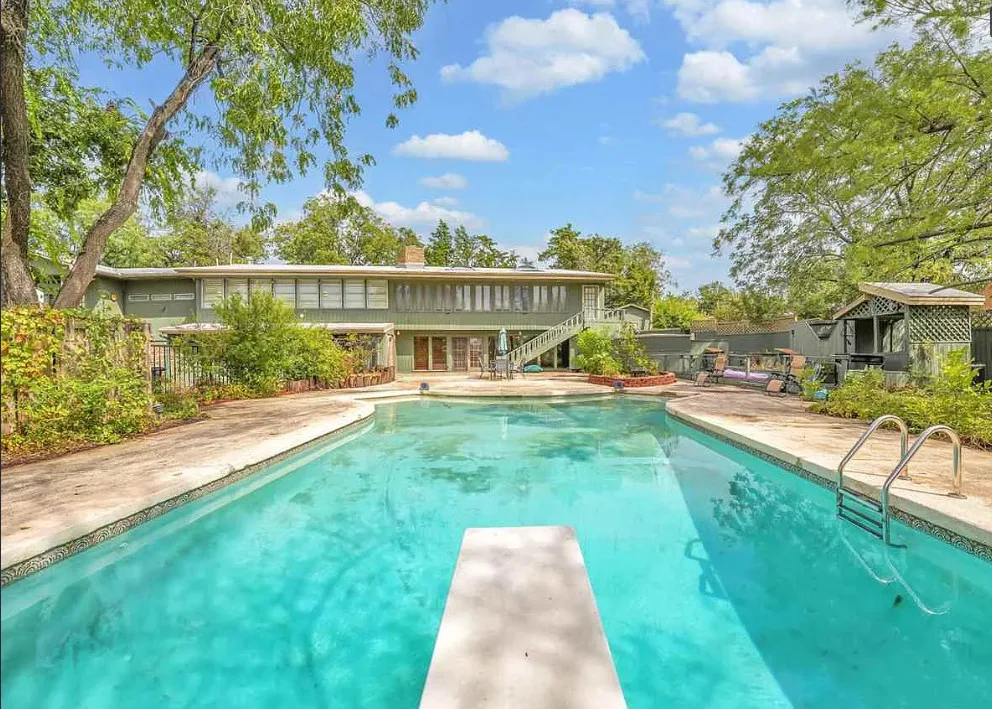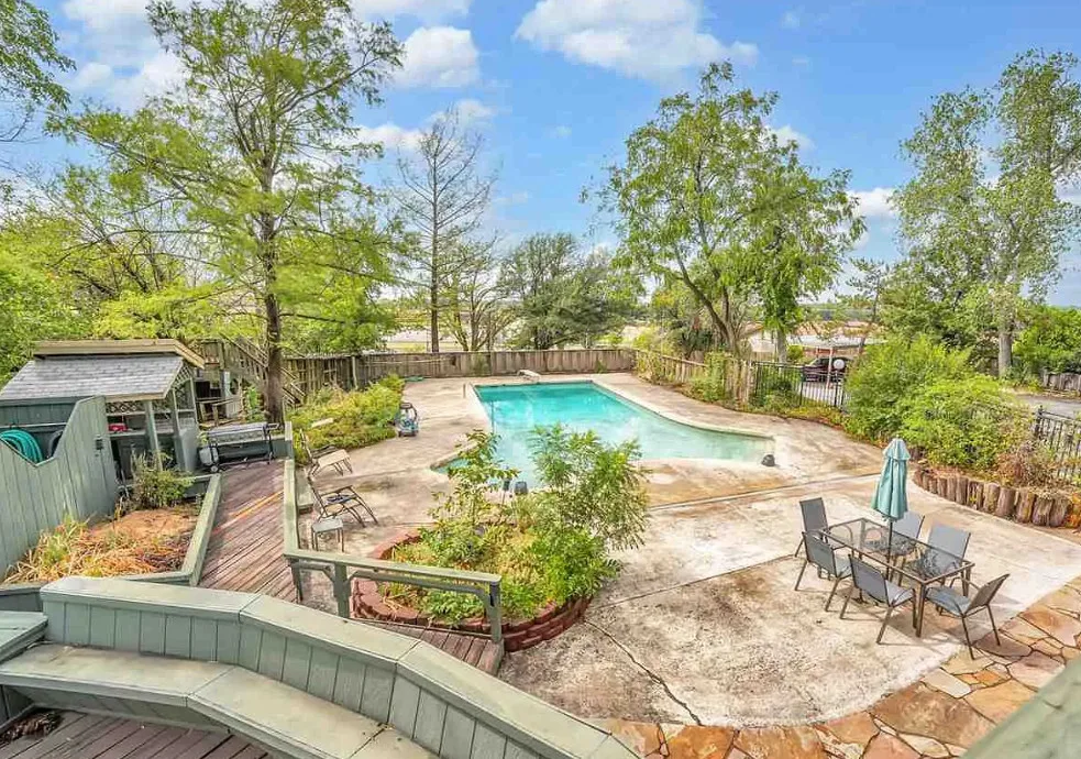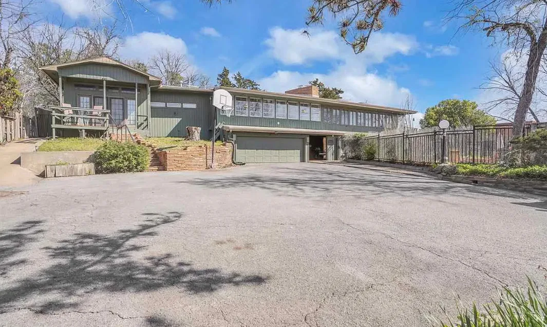 The pool looks nice! This mid-century has nice details! The house was built in 1953. It is located on 1.12 acres in Lawton, Oklahoma. The house features a covered porch, an attached garage, pretty entryway, double front doors, large family room with a wall of windows, brick fireplace, french doors, pretty chandelier, built-in bookshelves, spacious kitchen and a large sunroom. There is a large backyard with an in-ground pool and a hot tub. This is a large house. Four bedrooms, four bathrooms and 5,000 square feet. $299,500