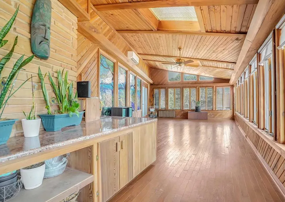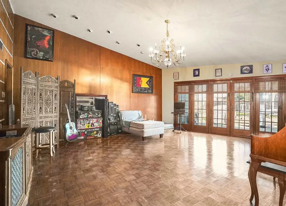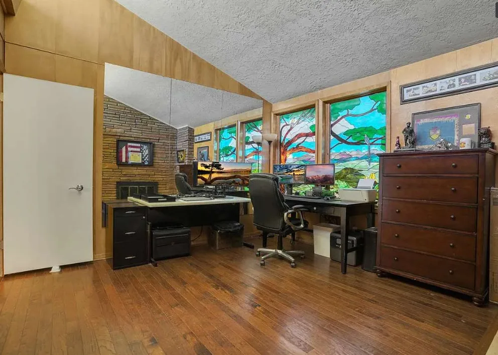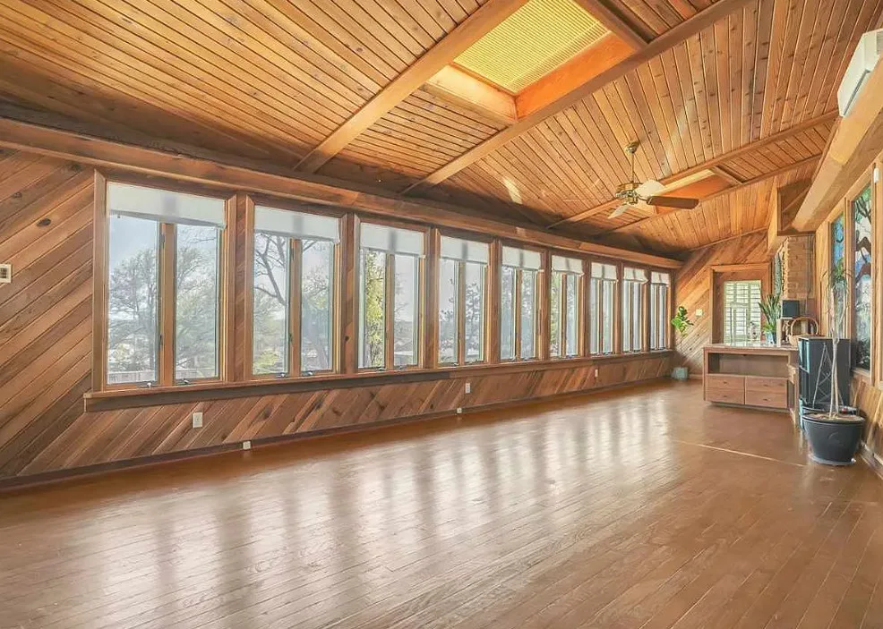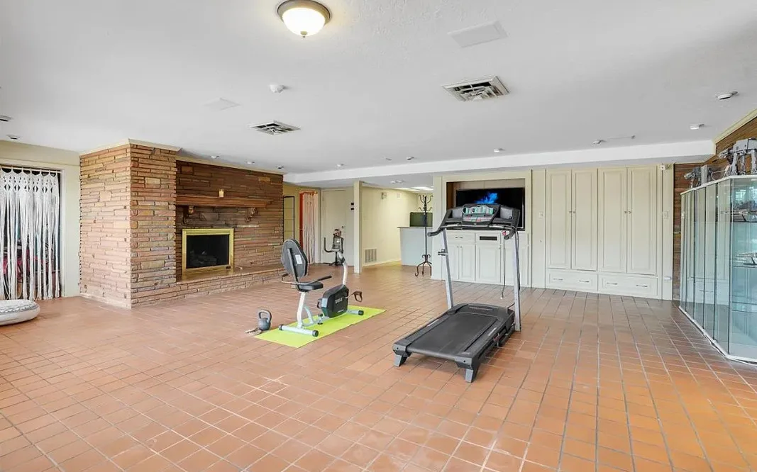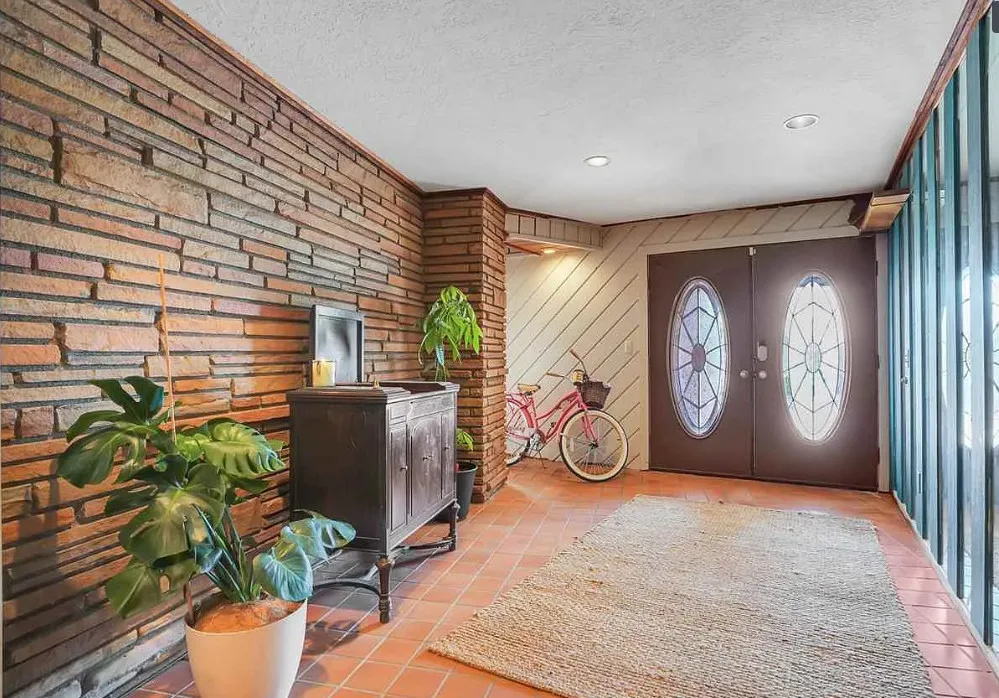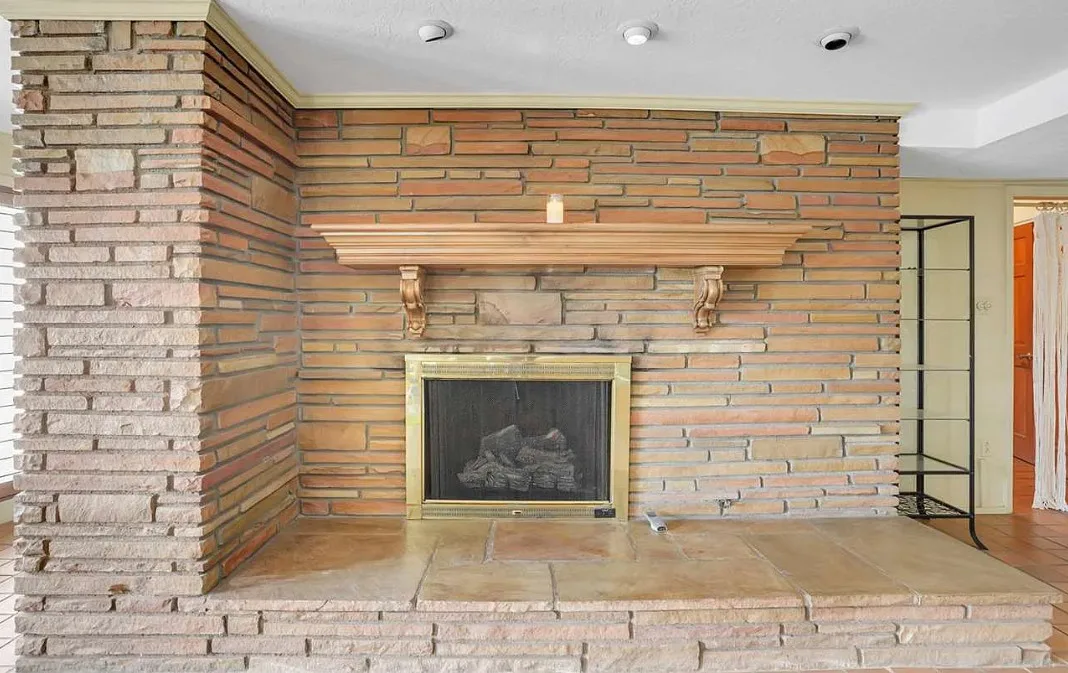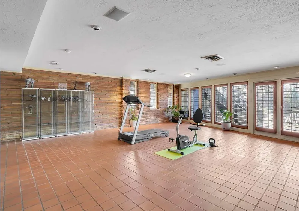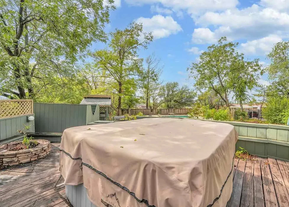 The pool looks nice! This mid-century has nice details! The house was built in 1953. It is located on 1.12 acres in Lawton, Oklahoma. The house features a covered porch, an attached garage, pretty entryway, double front doors, large family room with a wall of windows, brick fireplace, french doors, pretty chandelier, built-in bookshelves, spacious kitchen and a large sunroom. There is a large backyard with an in-ground pool and a hot tub. This is a large house. Four bedrooms, four bathrooms and 5,000 square feet. $299,500