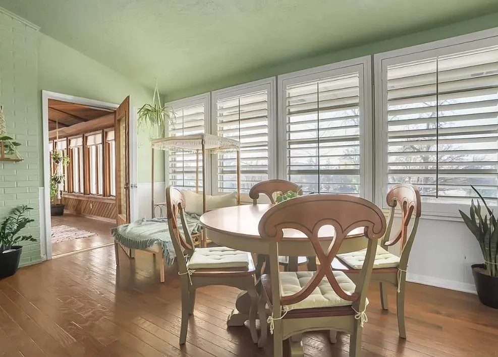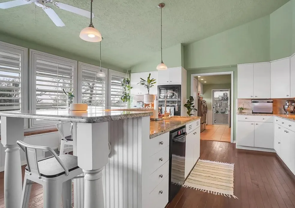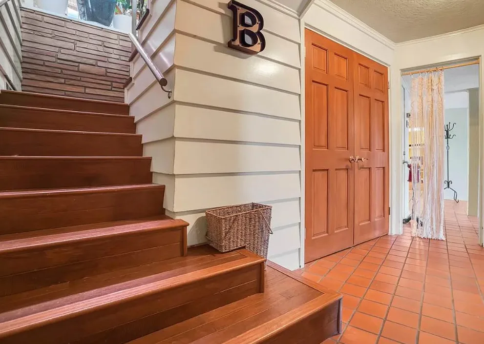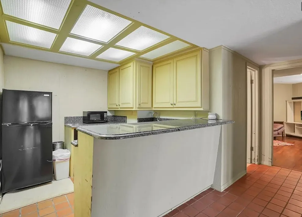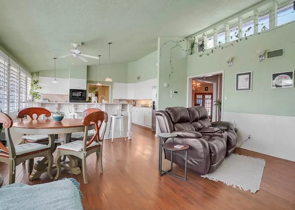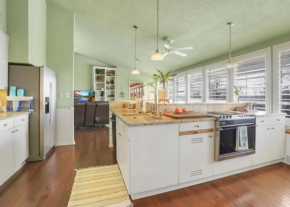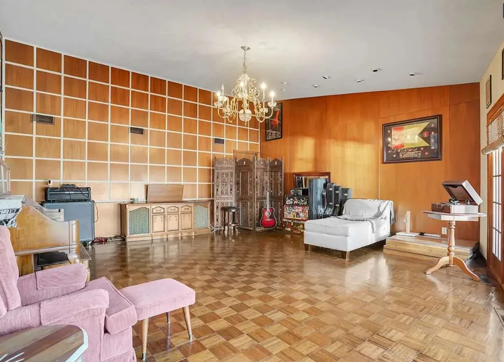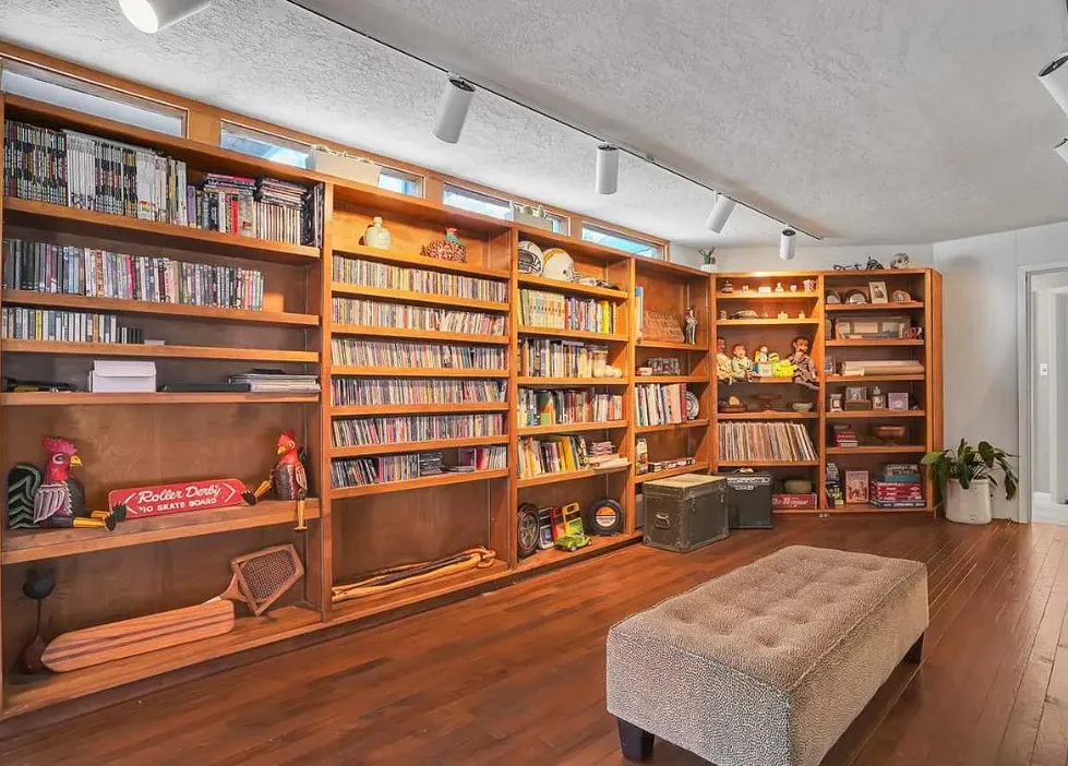 The pool looks nice! This mid-century has nice details! The house was built in 1953. It is located on 1.12 acres in Lawton, Oklahoma. The house features a covered porch, an attached garage, pretty entryway, double front doors, large family room with a wall of windows, brick fireplace, french doors, pretty chandelier, built-in bookshelves, spacious kitchen and a large sunroom. There is a large backyard with an in-ground pool and a hot tub. This is a large house. Four bedrooms, four bathrooms and 5,000 square feet. $299,500