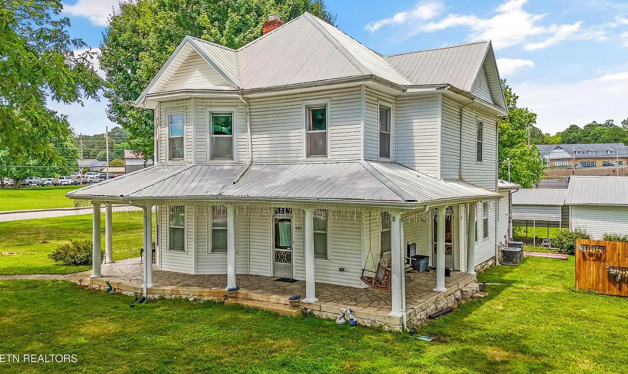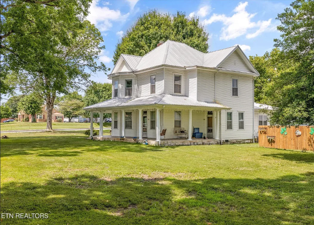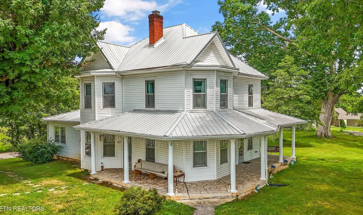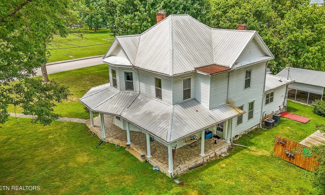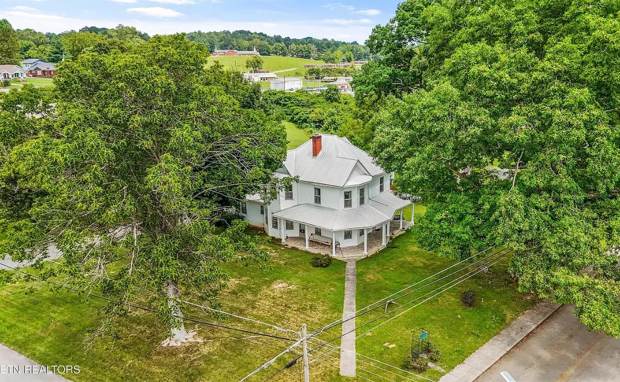 Porch goals! There are original details inside! The house was built in 1907. It is located on one acre in New Tazewell, Tennessee. The price seems a bit high to me. The house features a large wrap around front porch, wood floors, picture rails, spacious kitchen and transom windows. Four bedrooms, two bathrooms and 3,038 square feet. $390,000
