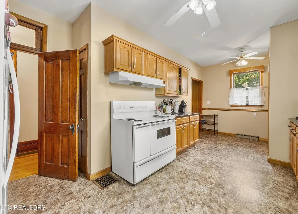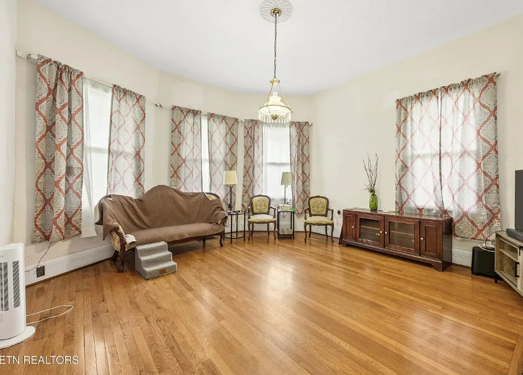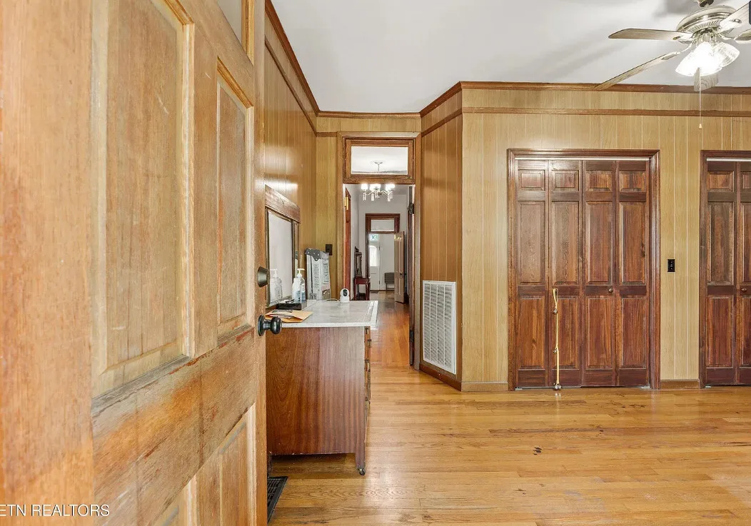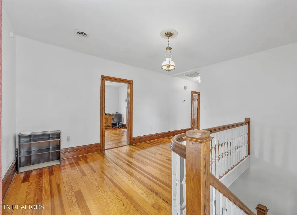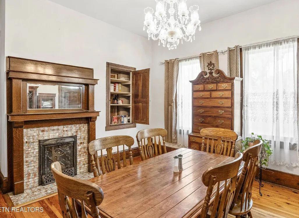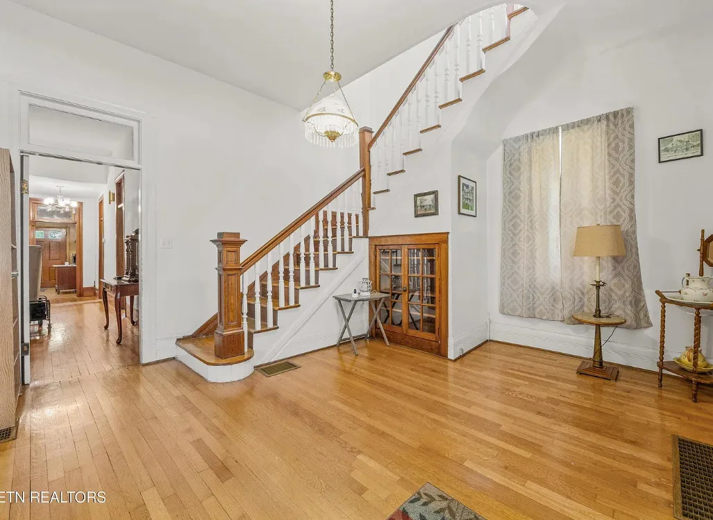 Porch goals! There are original details inside! The house was built in 1907. It is located on one acre in New Tazewell, Tennessee. The price seems a bit high to me. The house features a large wrap around front porch, wood floors, picture rails, spacious kitchen and transom windows. Four bedrooms, two bathrooms and 3,038 square feet. $390,000