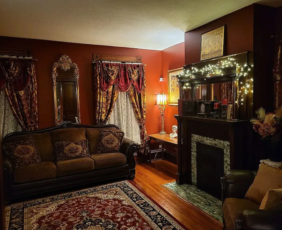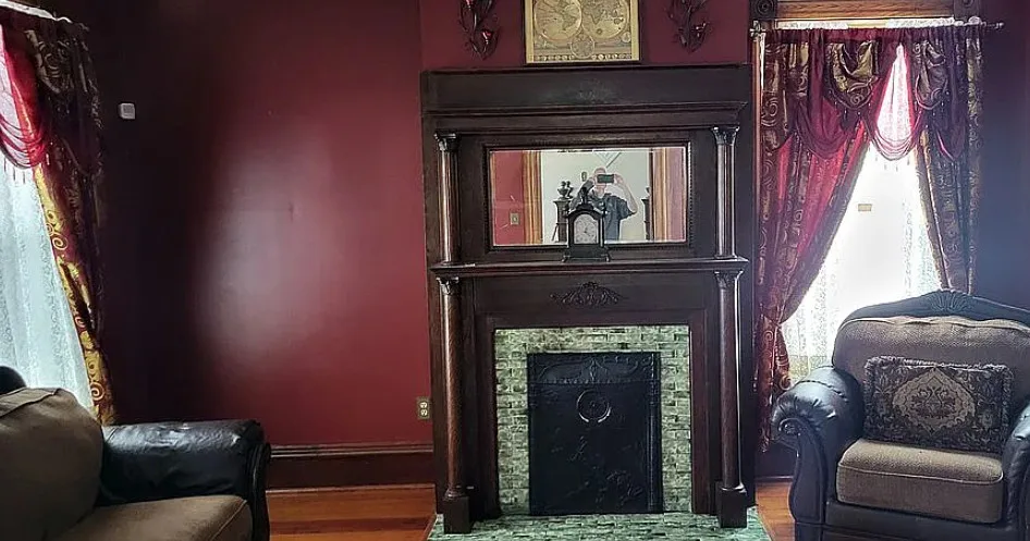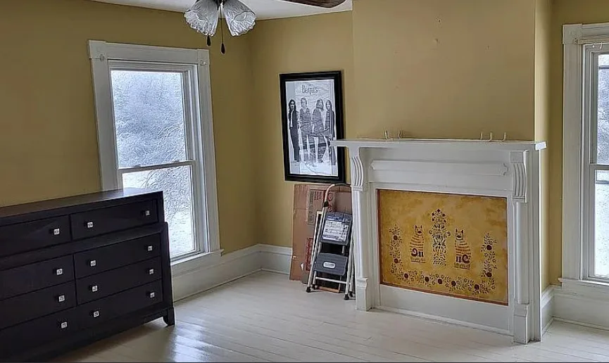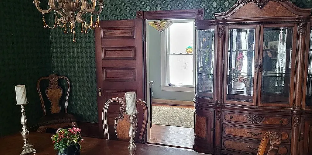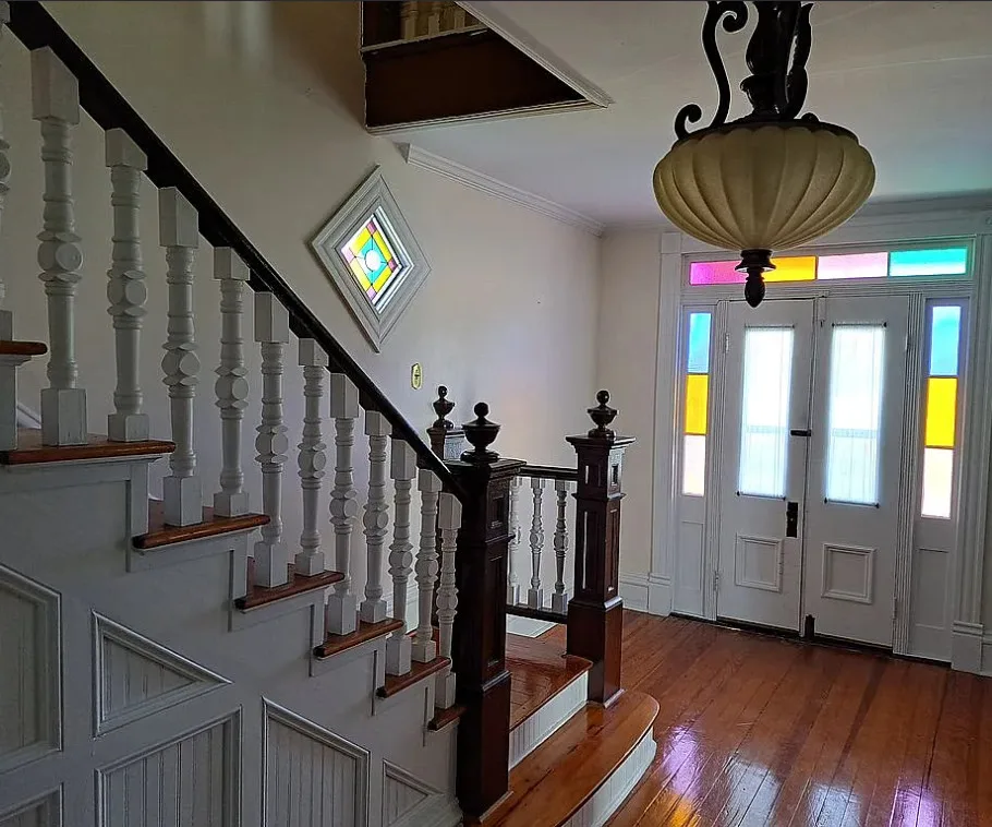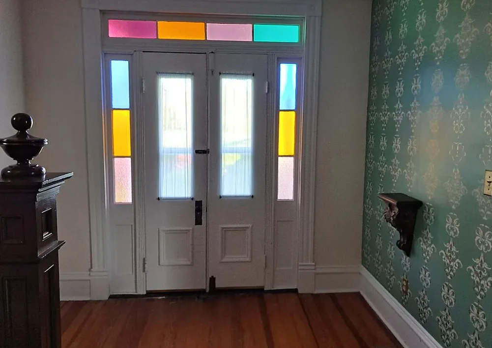 Love the pocket doors! This house has original details! The house was built in 1904. It is located on five acres in South Hill, Virginia. The house features a covered front porch, wood floors, pretty mamtels, wide baseboards, pocket doors, stained glass and vintage light fixtures. Three bedrooms, three bathrooms and 2,726 square feet. $300,000