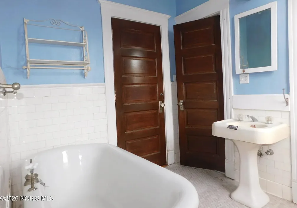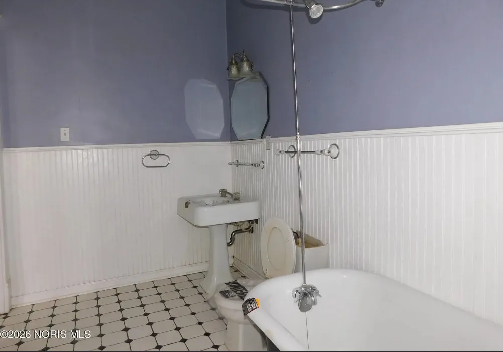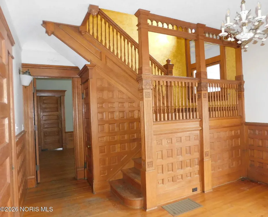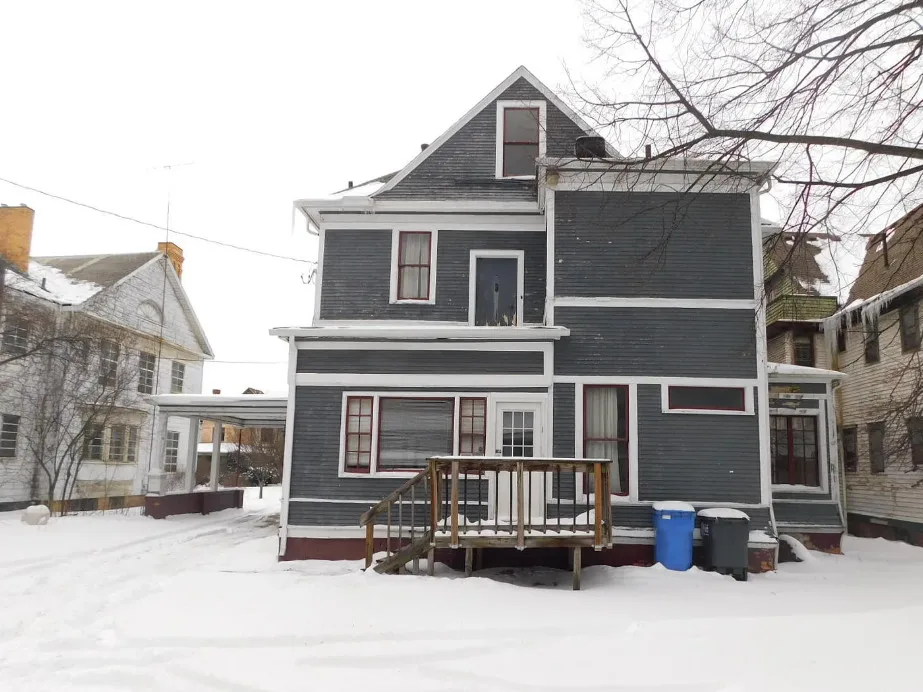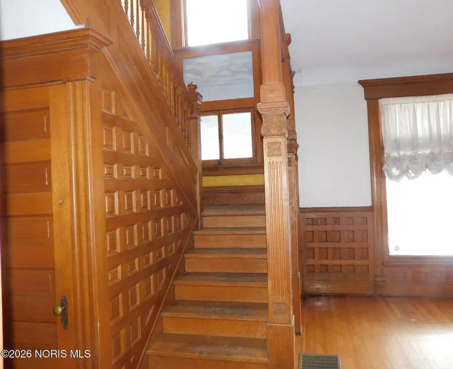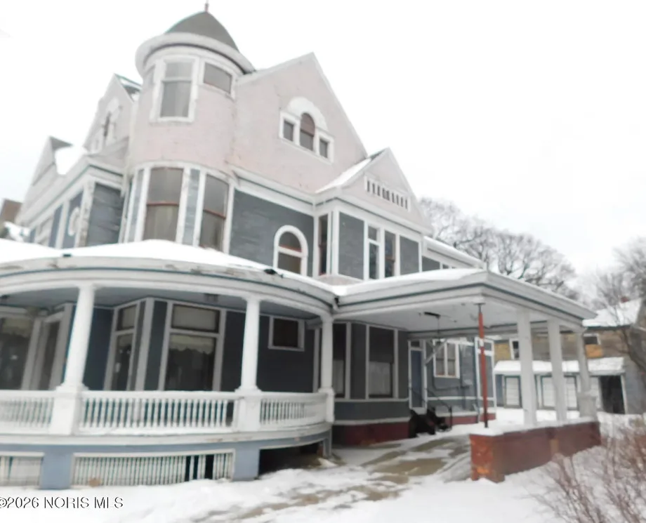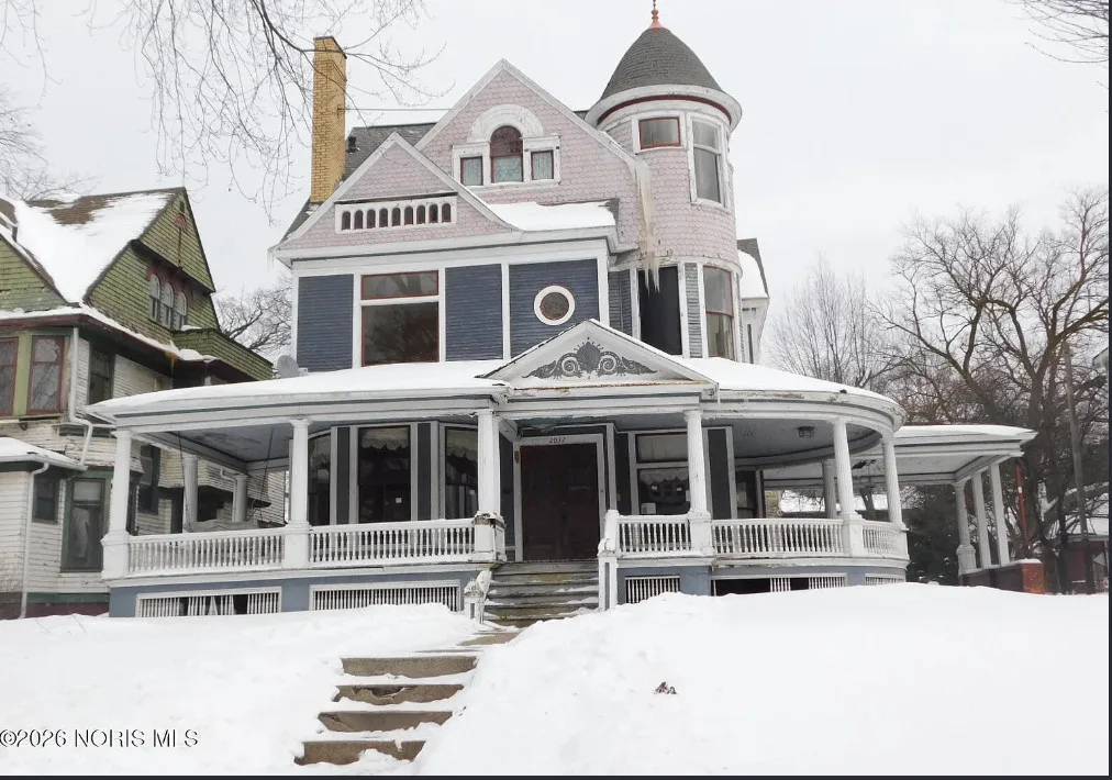 Porch goals! Pretty staircase! The house was built in 1900. It is located on .28 acre in Toledo, Ohio. The house features a large wrap around front porch, a porte cochere, grand staircase, wainscoting, wide baseboards, pocket doors, original mantels and a claw foot tub. The roof clearly needs to be looked at. There is a detached garage on the property. Five bedrooms, four bathrooms and 3,624 square feet. $140,000 New price: $135,000