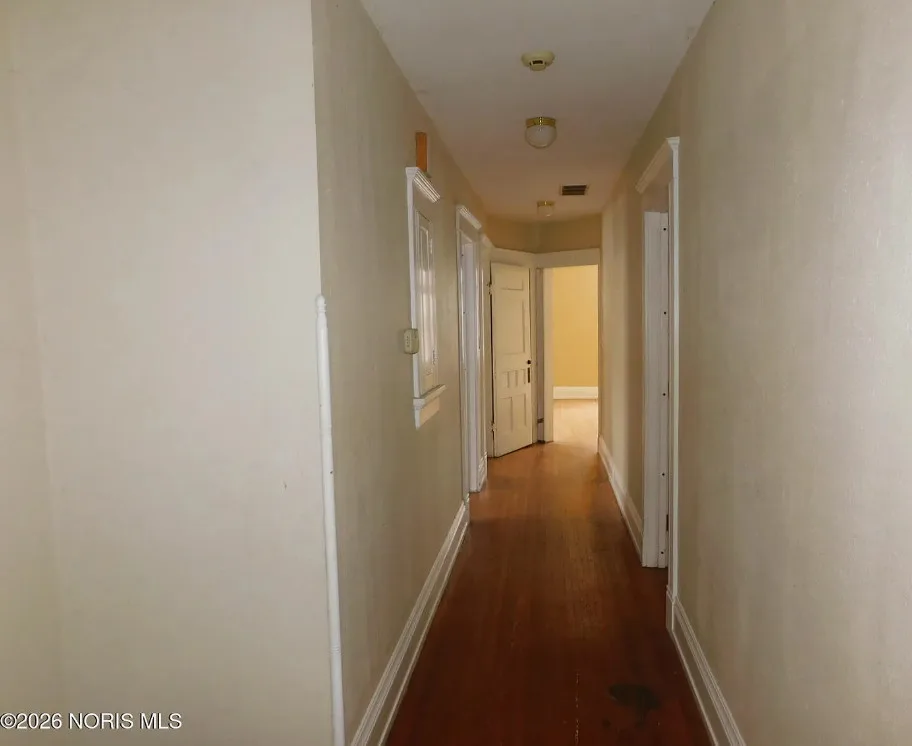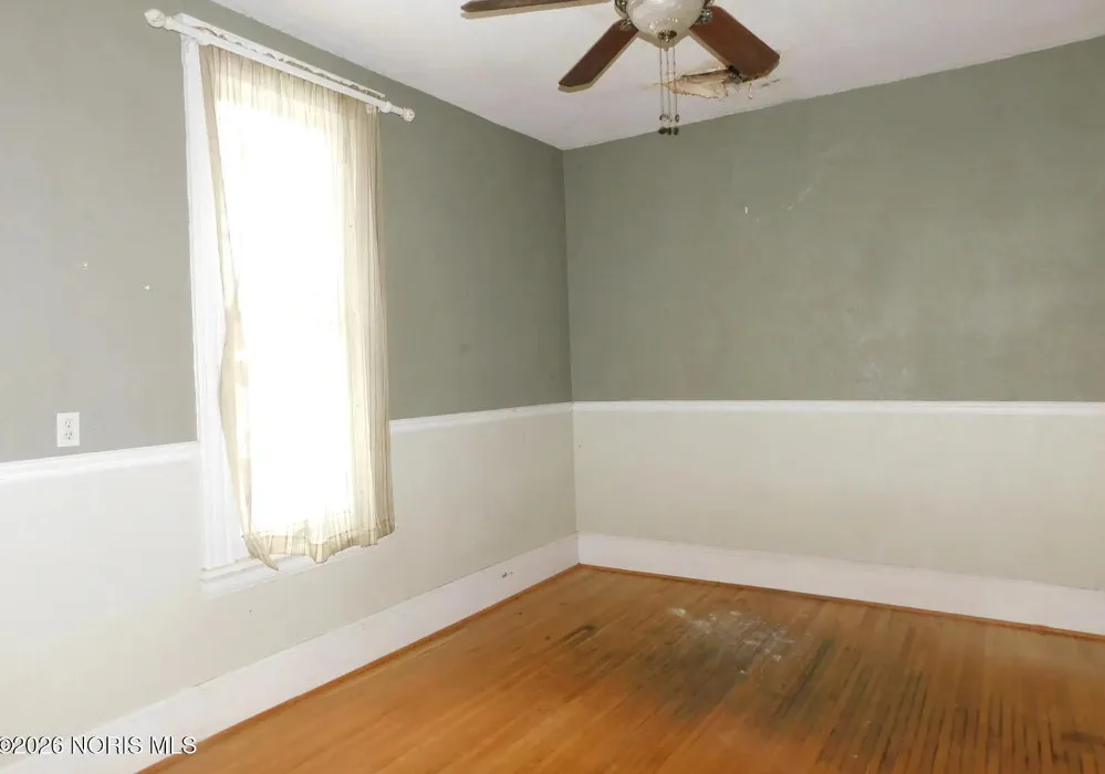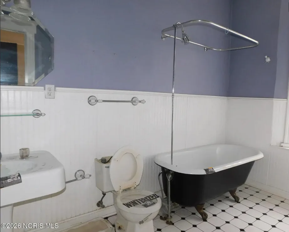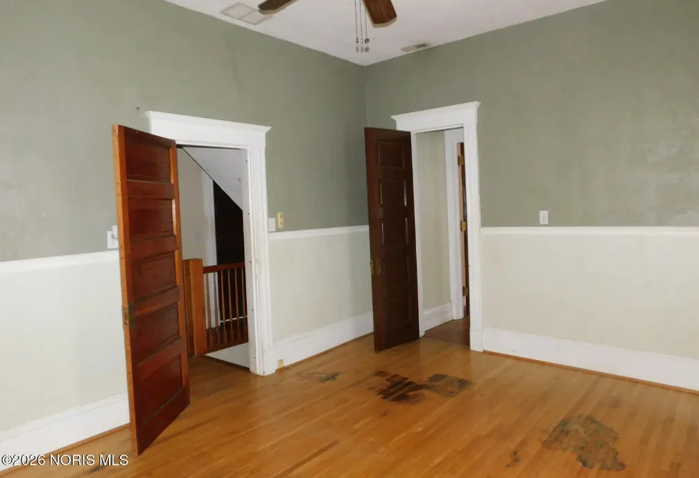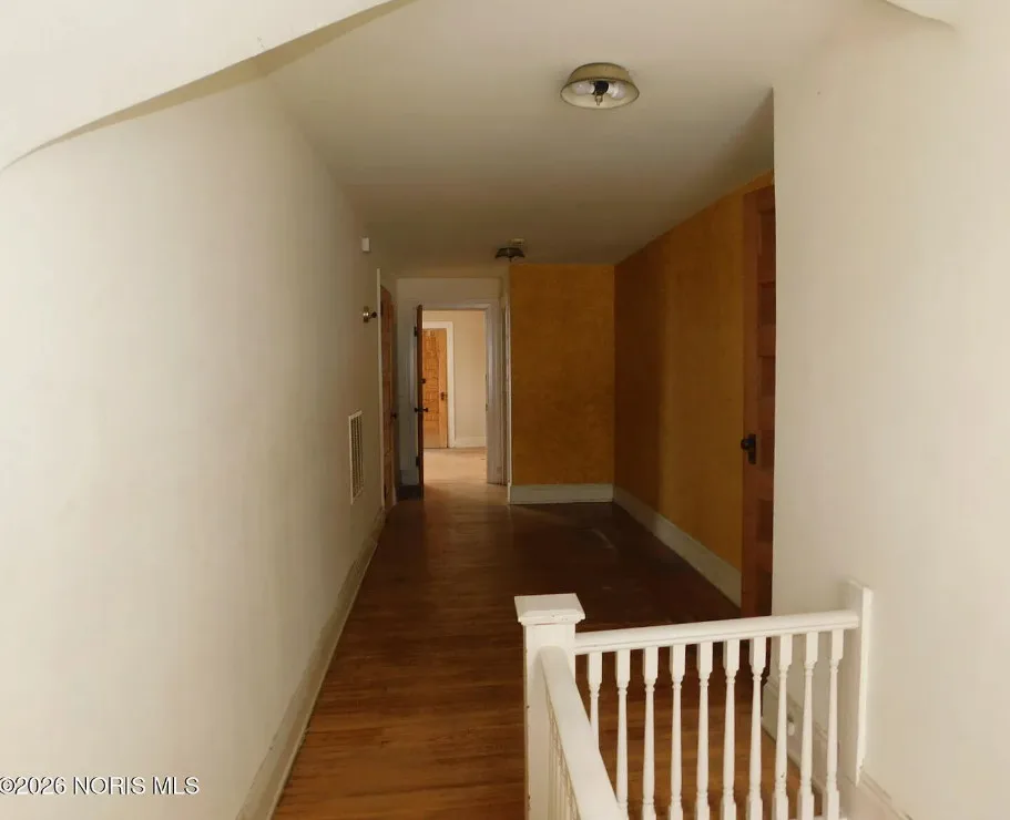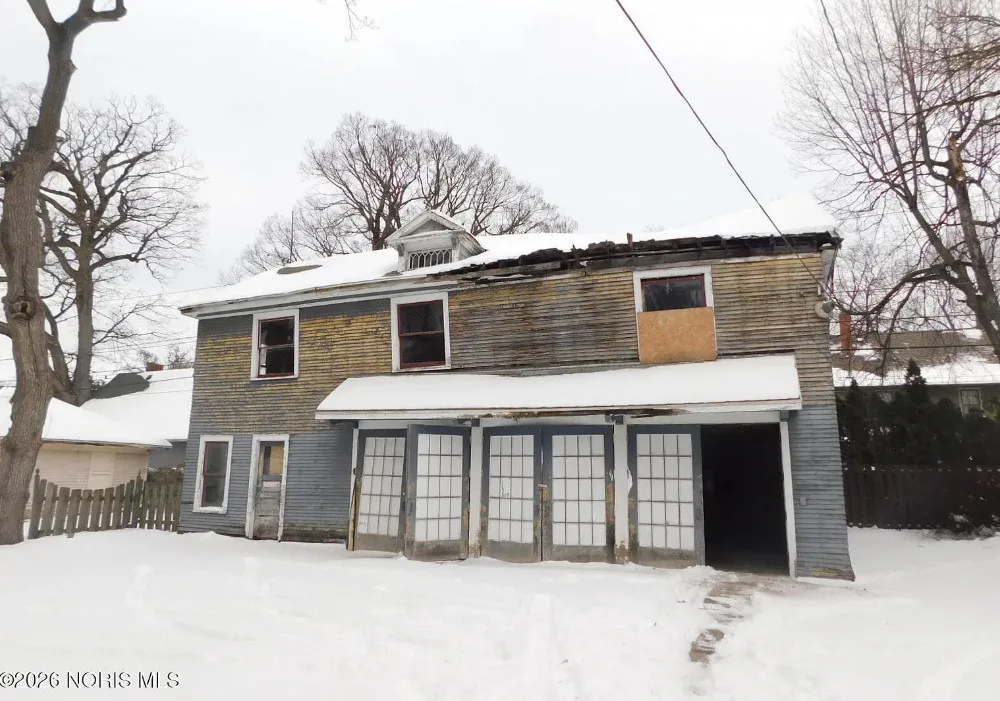 Porch goals! Pretty staircase! The house was built in 1900. It is located on .28 acre in Toledo, Ohio. The house features a large wrap around front porch, a porte cochere, grand staircase, wainscoting, wide baseboards, pocket doors, original mantels and a claw foot tub. The roof clearly needs to be looked at. There is a detached garage on the property. Five bedrooms, four bathrooms and 3,624 square feet. $140,000 New price: $135,000