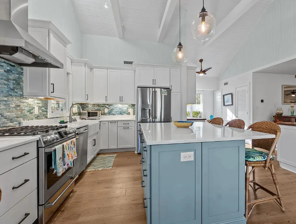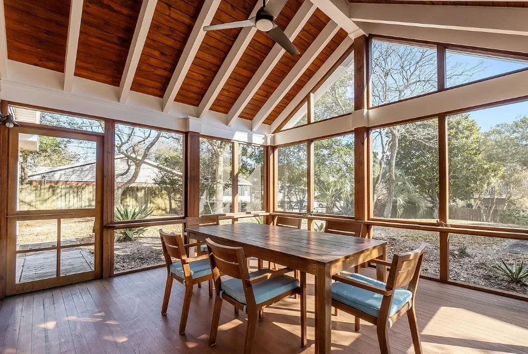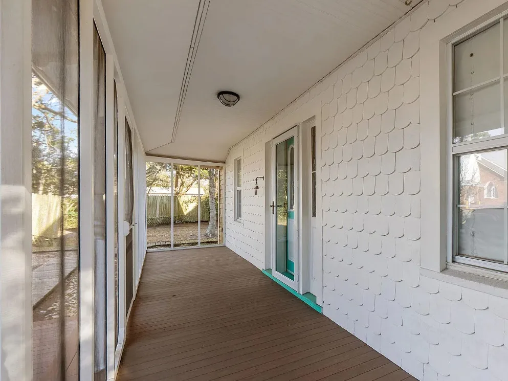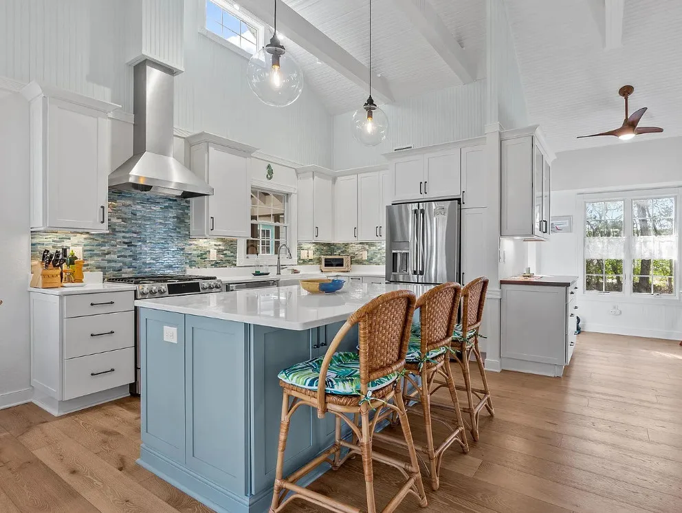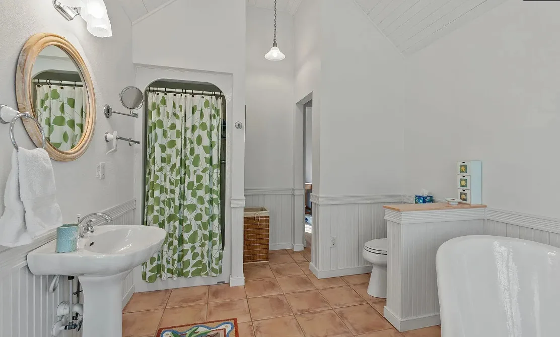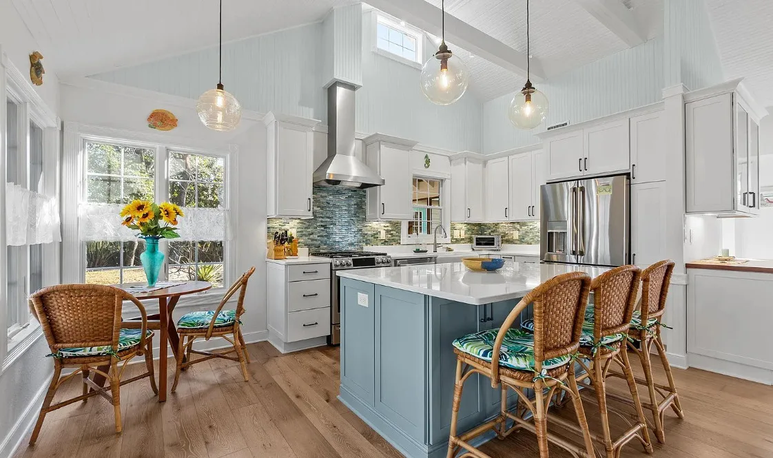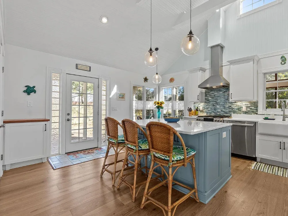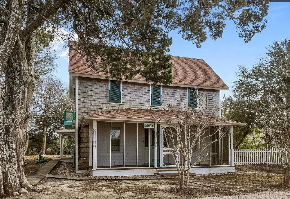 In the Outer Banks! How about that kitchen! So much natural light! The house was built in 1930. It is located on .3 acre in Buxton, North Carolina. The house features a screened in front porch, a screened in back porch, covered side porch, updated kitchen with soaring ceilings, wood floors, wainscoting and a great bathroom with claw foot tub and balcony. There is a detached garage with a full bathroom on the property. Three bedrooms, two bathrooms and 1,866 square feet. $539,000