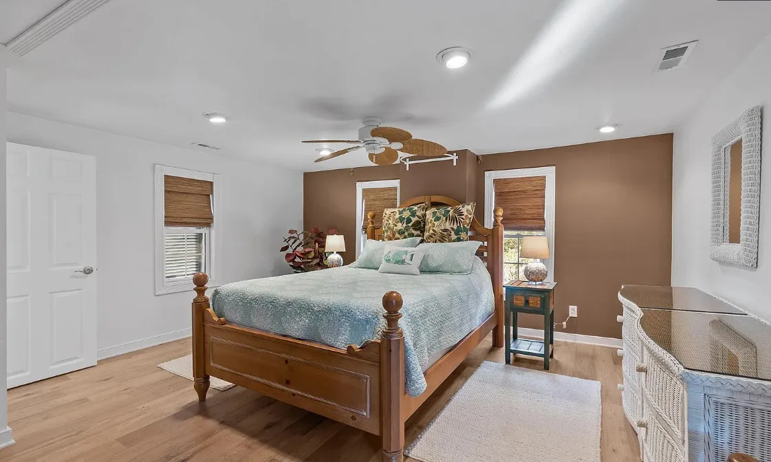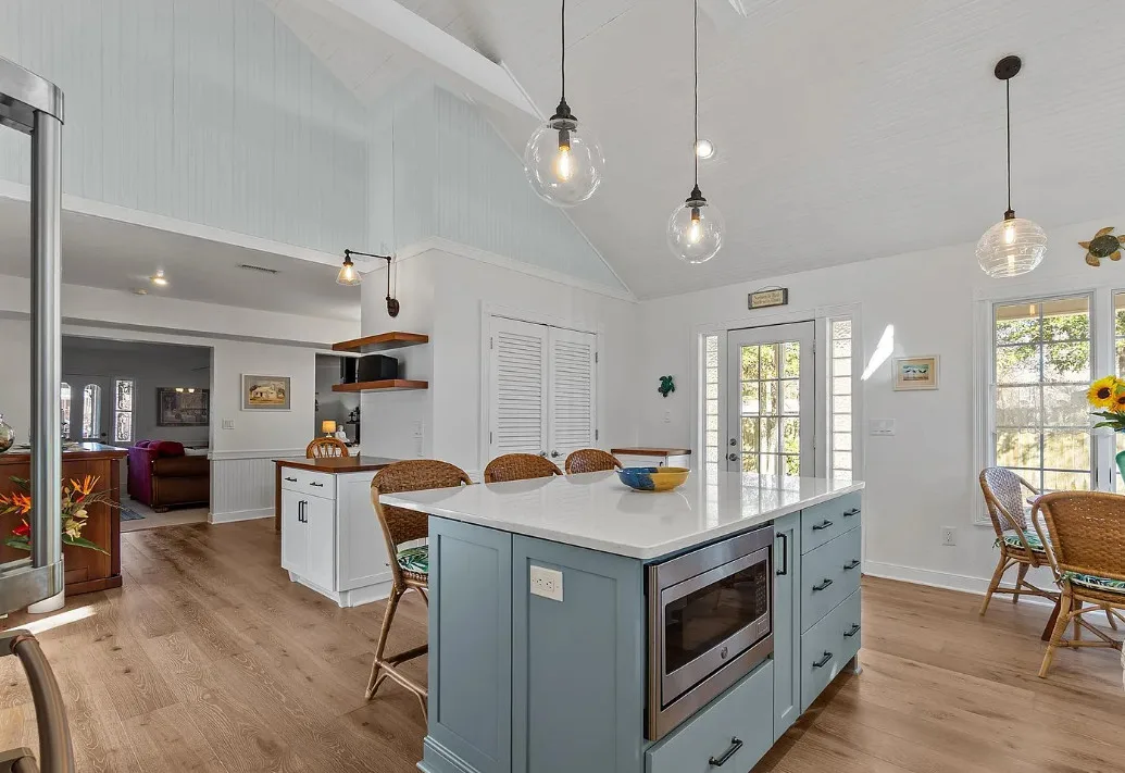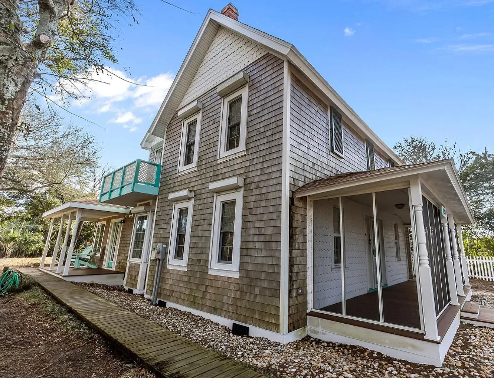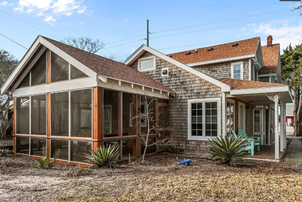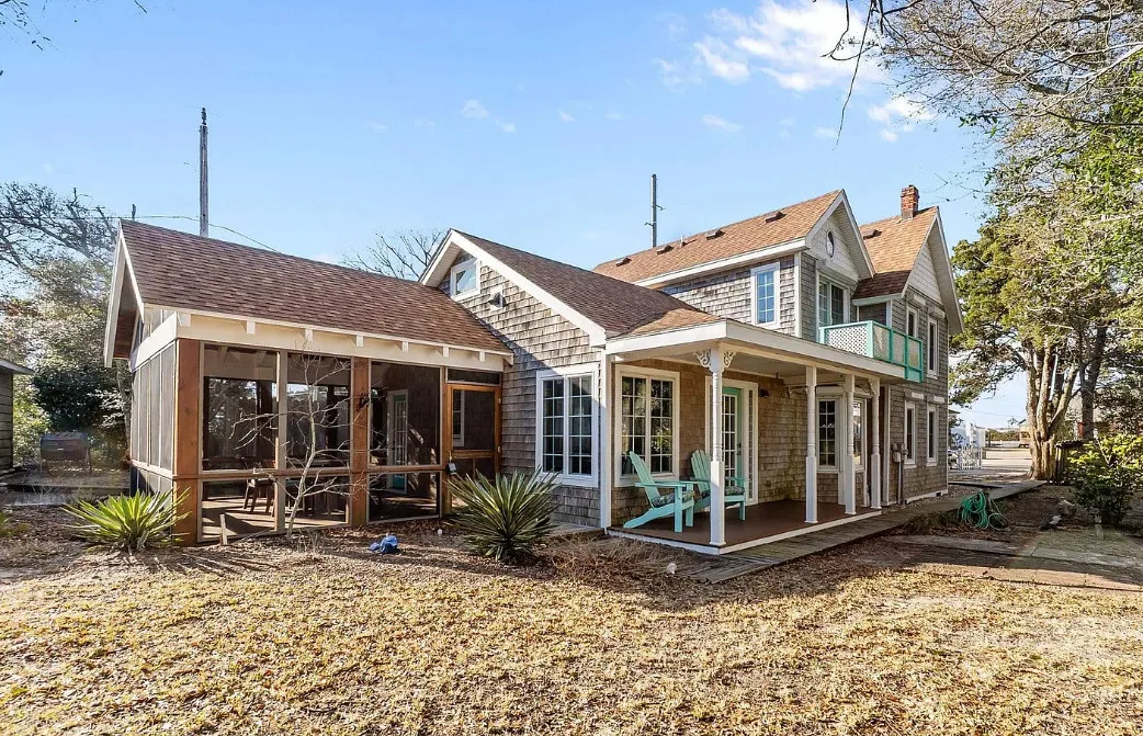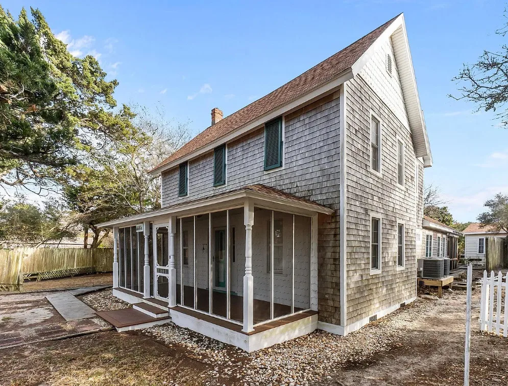 It’s easy to see why this home is one that first bought HGTV to Hatteras Island in 2008! Originally built in 1930, this classic coastal cottage has undergone amazing transformations over the years with the most notable renovation transforming the kitchen into anyone’s dream in 2022. Accessed by the front circular driveway or side entrance to the detached garage/workshop, you’ll be welcomed by the front screened porch, covered side entry, or recent grand screened porch in the rear leading to the back foyer entrance. The kitchen’s cathedral ceilings and open space are flooded with natural light and the island bar will be your favorite gathering space. GE Profile appliances, a farmhouse sink, shaker style cabinetry, and quartz countertops elevate the space. Additional storage cabinets are topped by butcher block tops that lend warmth to the kitchen and the LeCache Mission Credenza wine fridge in the dining area awaits your expansive wine collection. The comfortable and cozy living area includes a gas stove, and a first floor bedroom and bath round off this level. Upstairs is a primary suite with adjoining bath featuring a claw foot tub and separate shower, private balcony, and small room that may be used as a substantial closet or office space. The third bedroom is on this top level as well. Ask for the detailed list of features and updates and be sure to visit this unique and special home as soon as possible. It is ready for immediate occupancy with no obligations to a property manager for vacation rentals.