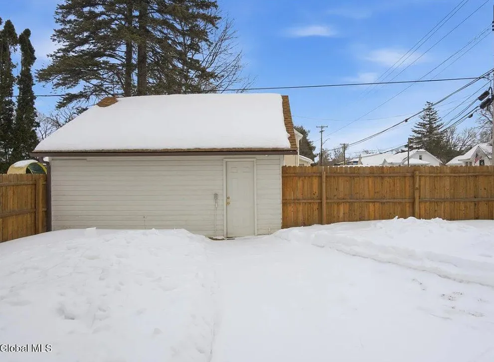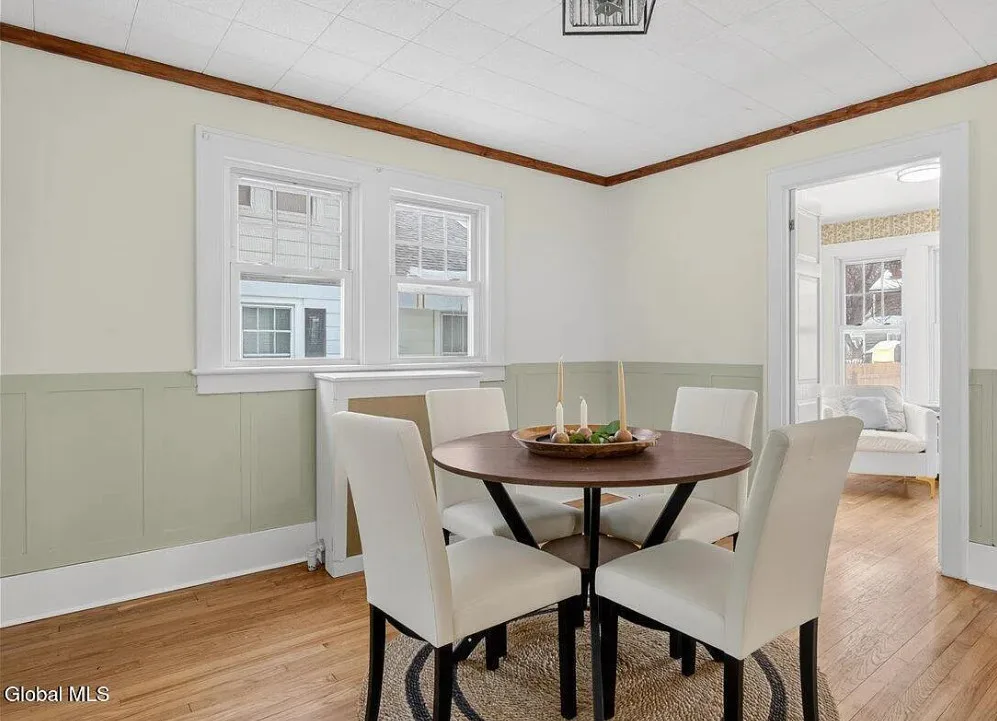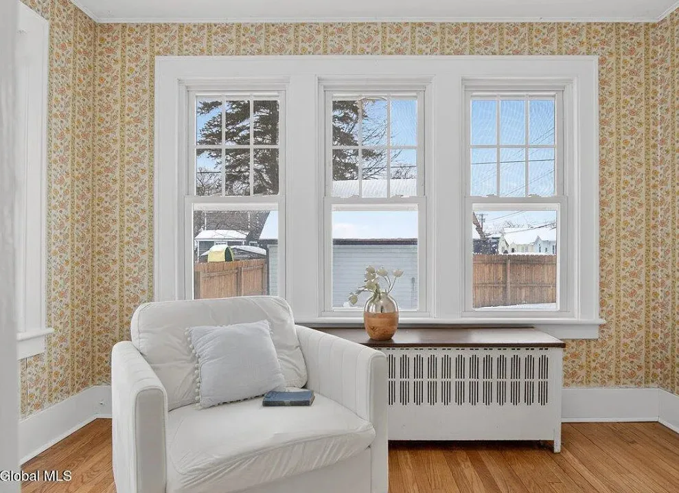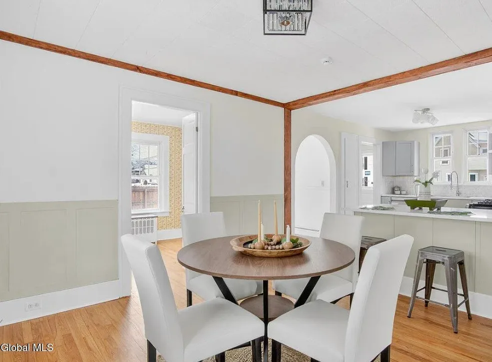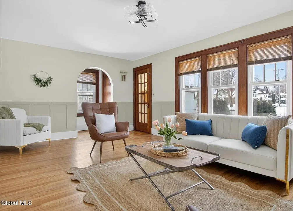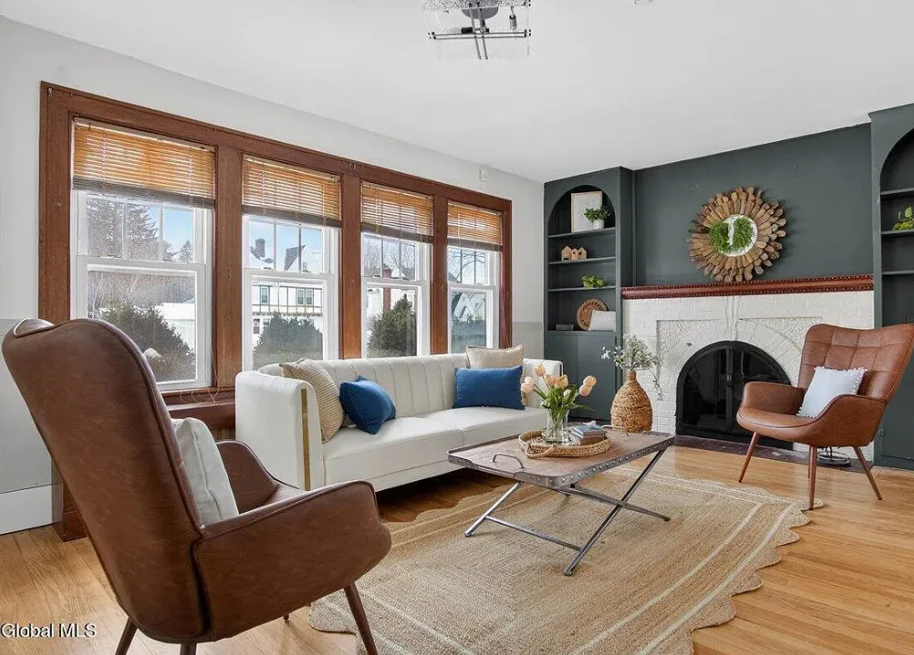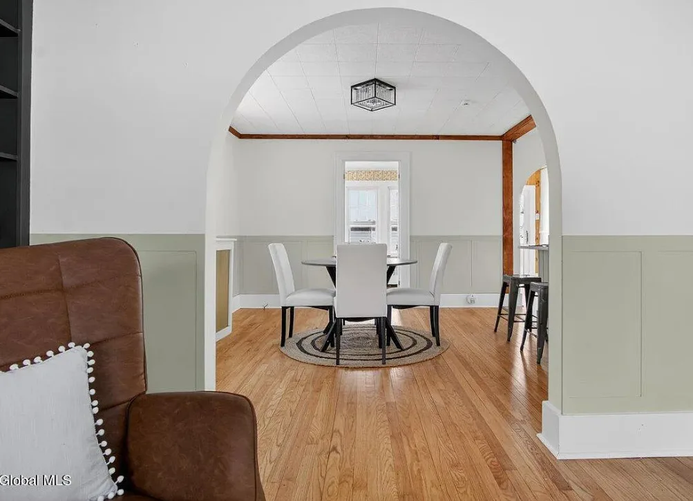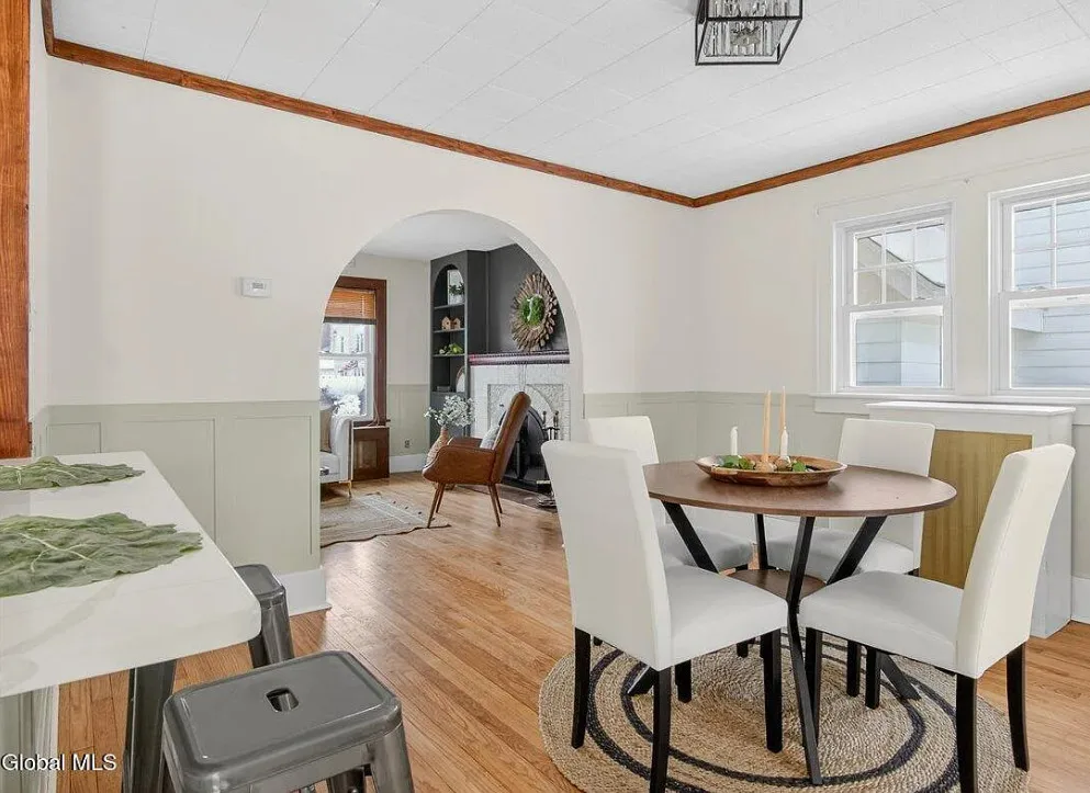 This house has a pretty interior! A lot of natural light. The house was built in 1945. It is located in Gloversville, New York. The house features wood floors, pretty fireplace, built-in bookshelves, baseboards, wainscoting, arched entryways, crown moulding and an updated kitchen. There is a fenced in backyard and a detached garage. Four bedrooms, two bathrooms and 1,450 square feet. $229,000