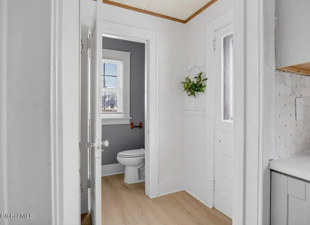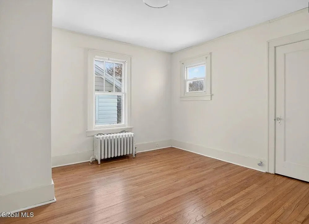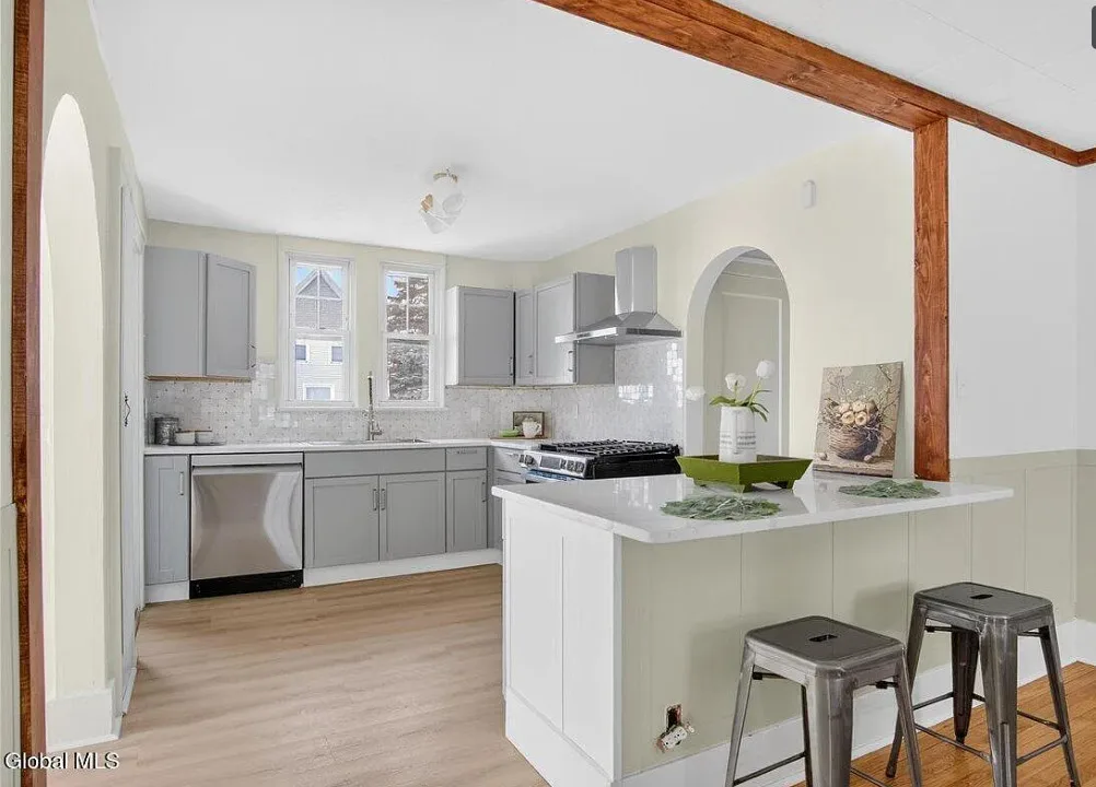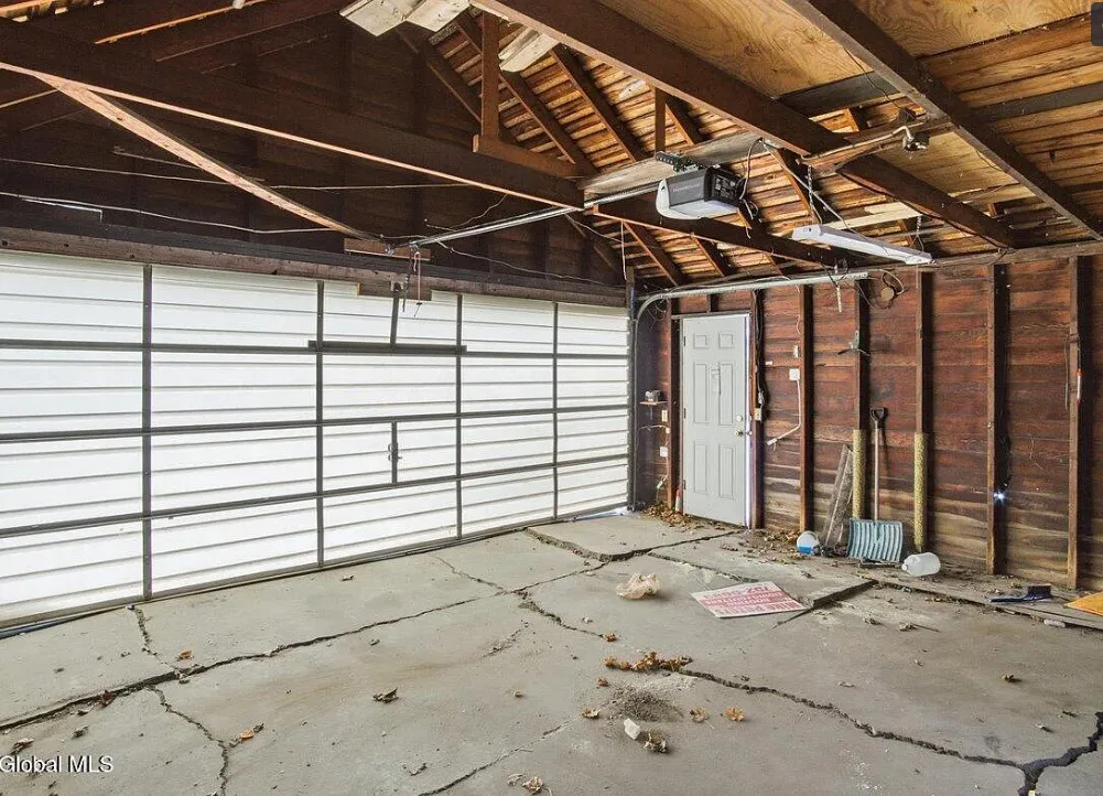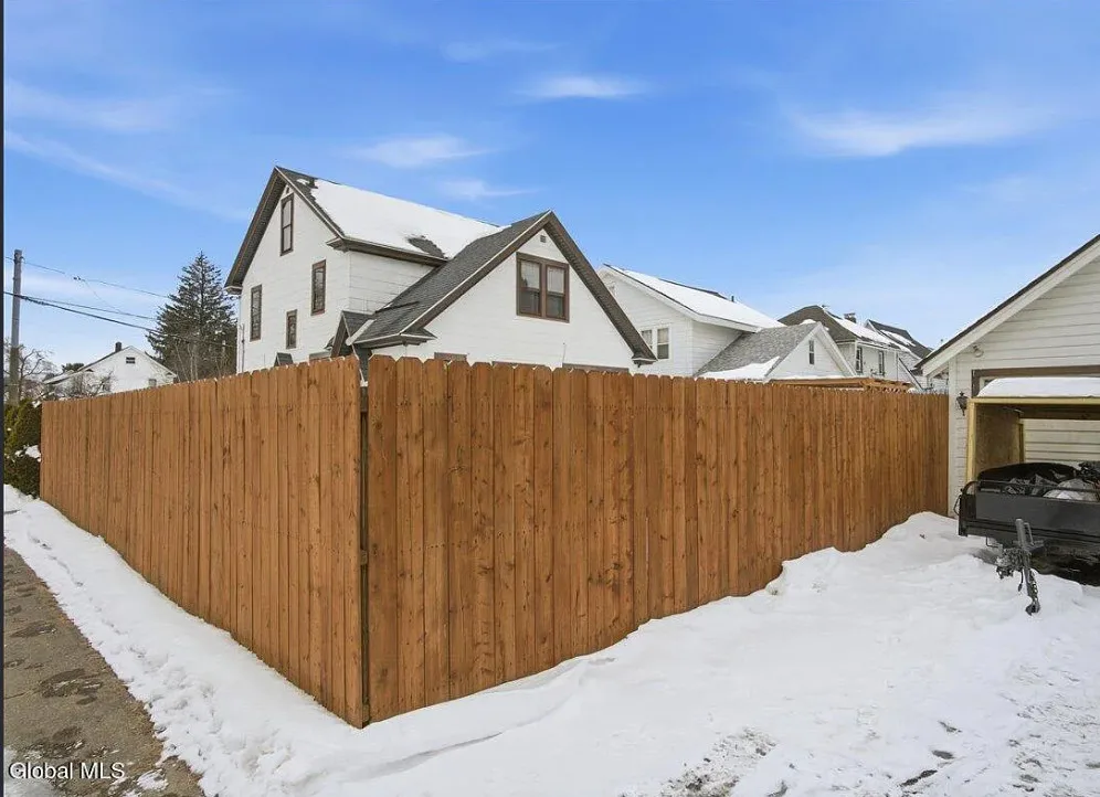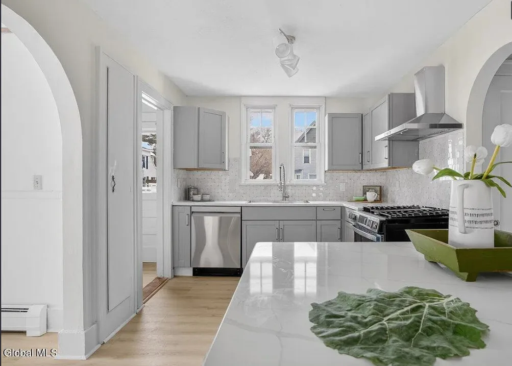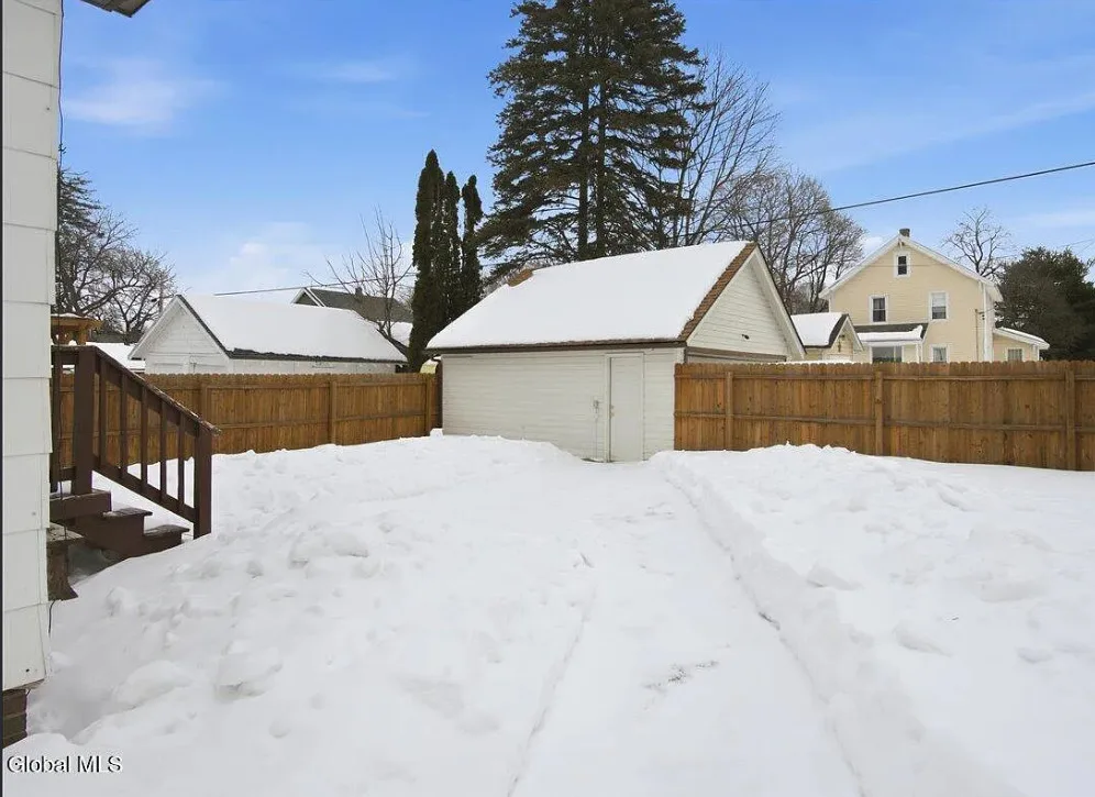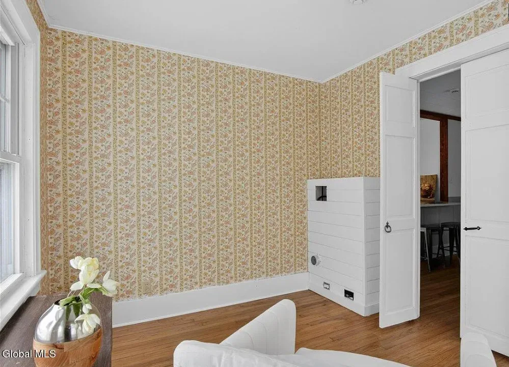 This house has a pretty interior! A lot of natural light. The house was built in 1945. It is located in Gloversville, New York. The house features wood floors, pretty fireplace, built-in bookshelves, baseboards, wainscoting, arched entryways, crown moulding and an updated kitchen. There is a fenced in backyard and a detached garage. Four bedrooms, two bathrooms and 1,450 square feet. $229,000