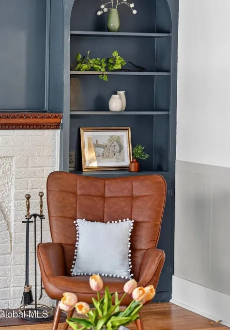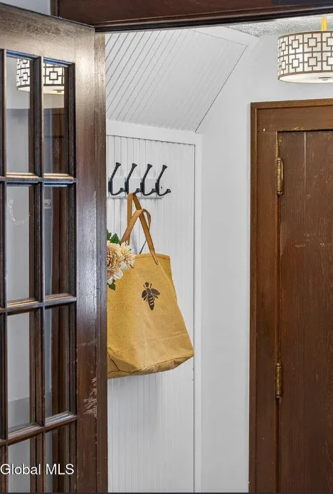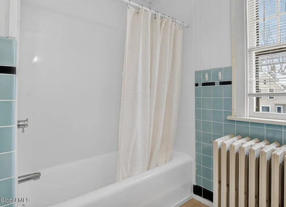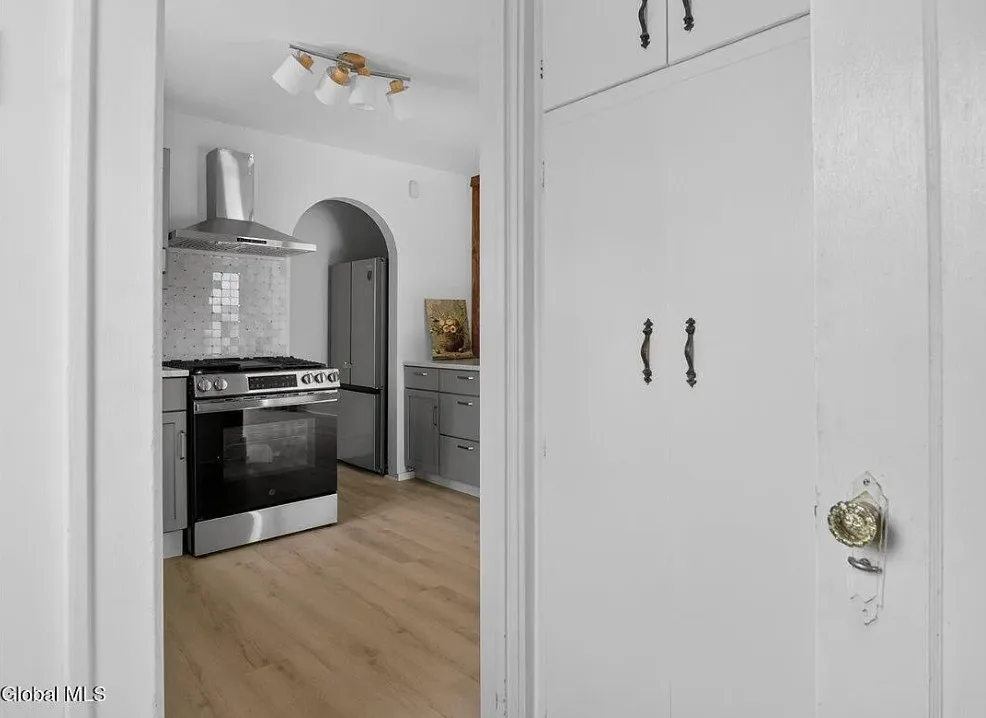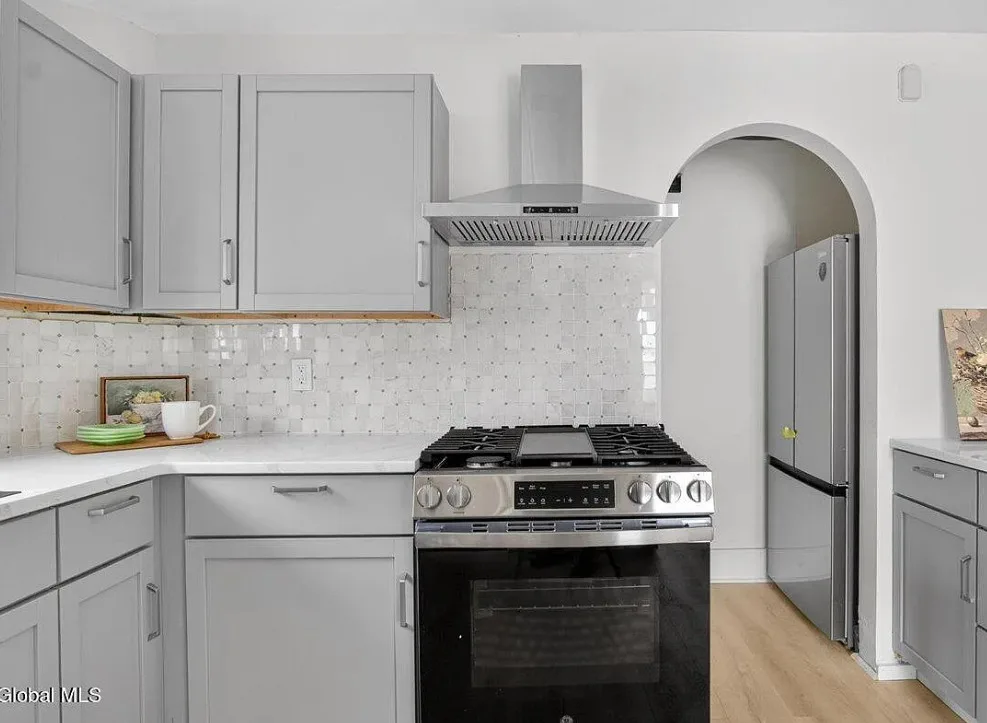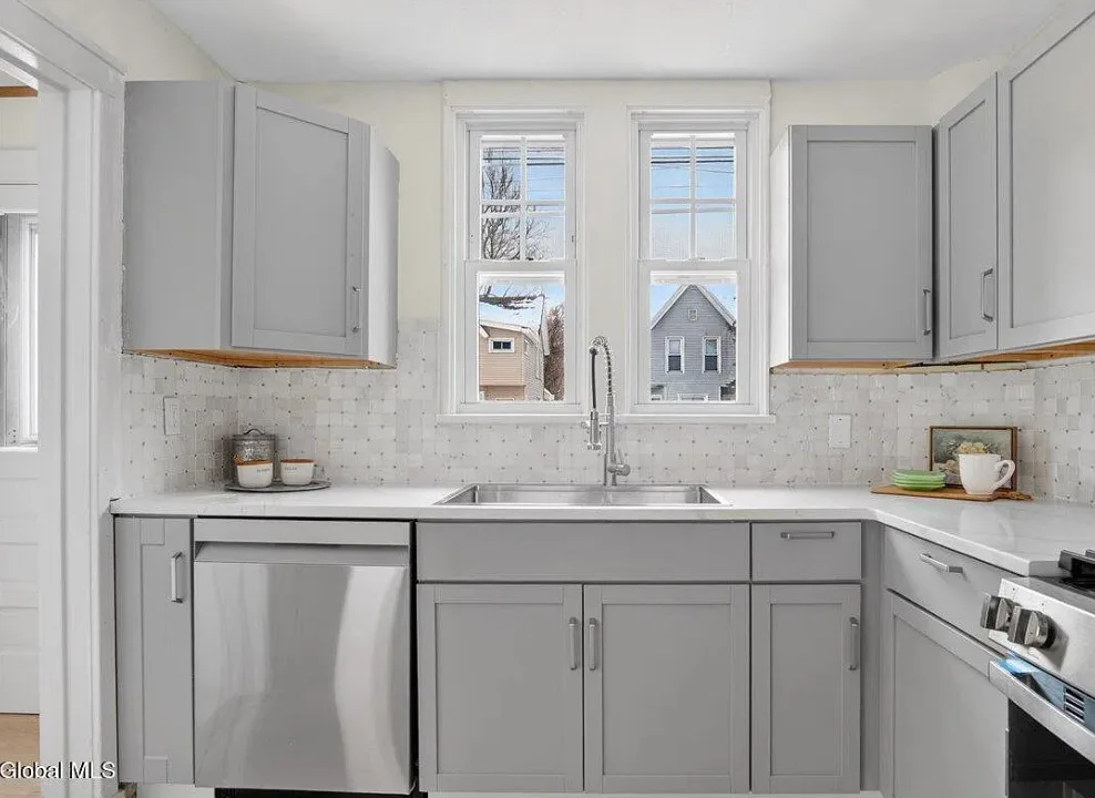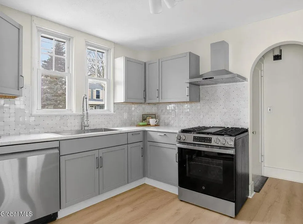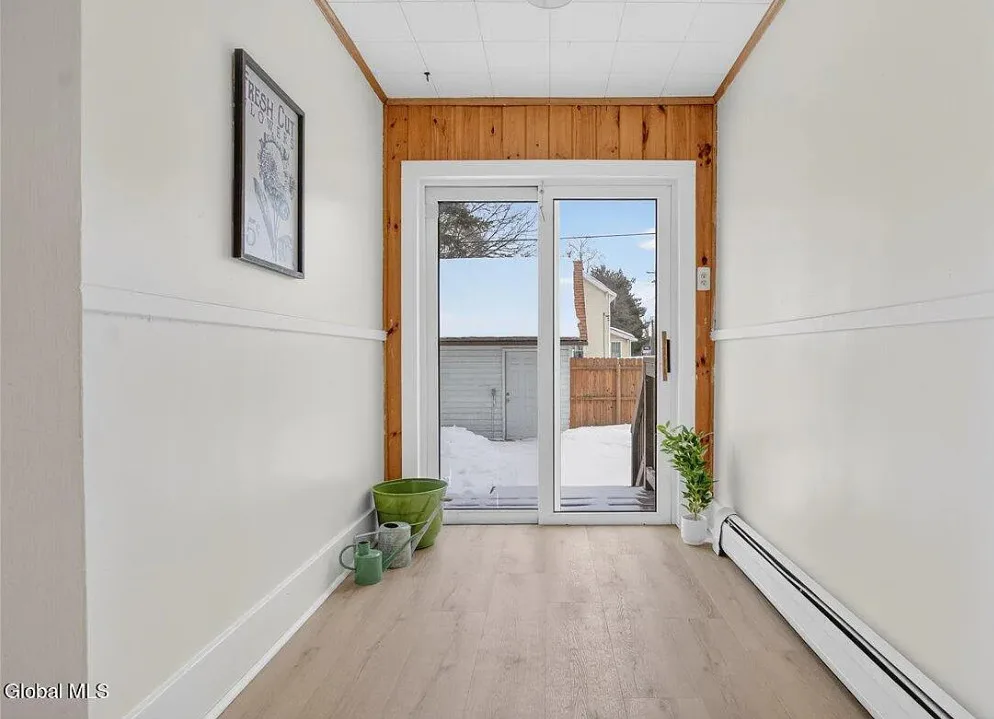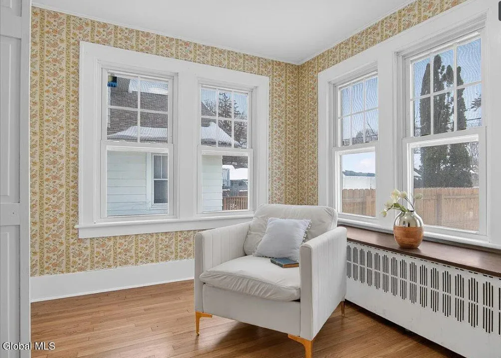 This house has a pretty interior! A lot of natural light. The house was built in 1945. It is located in Gloversville, New York. The house features wood floors, pretty fireplace, built-in bookshelves, baseboards, wainscoting, arched entryways, crown moulding and an updated kitchen. There is a fenced in backyard and a detached garage. Four bedrooms, two bathrooms and 1,450 square feet. $229,000