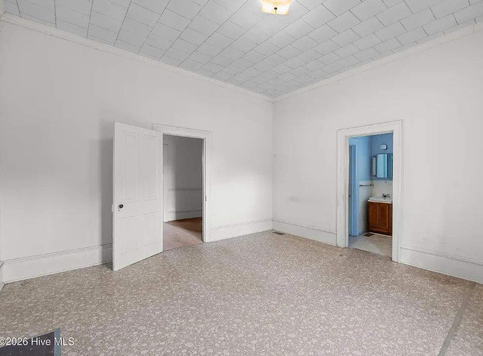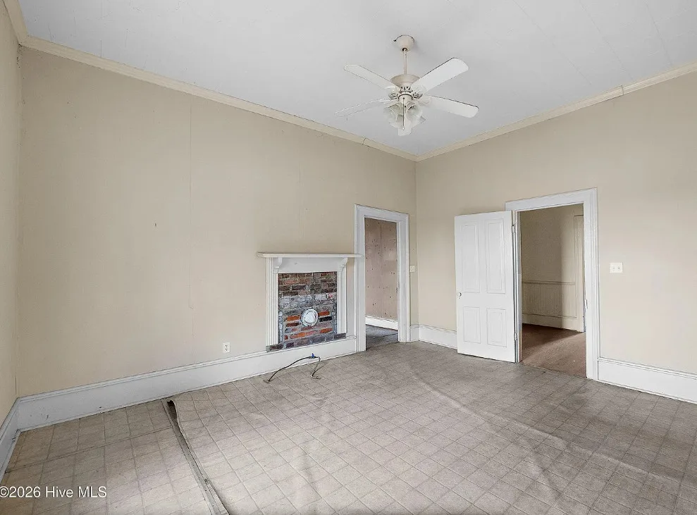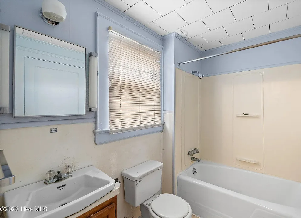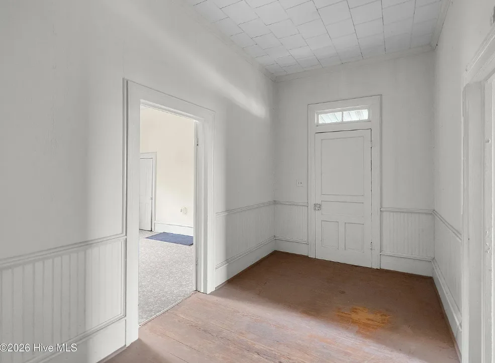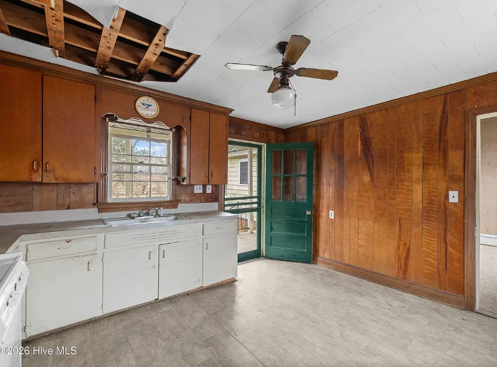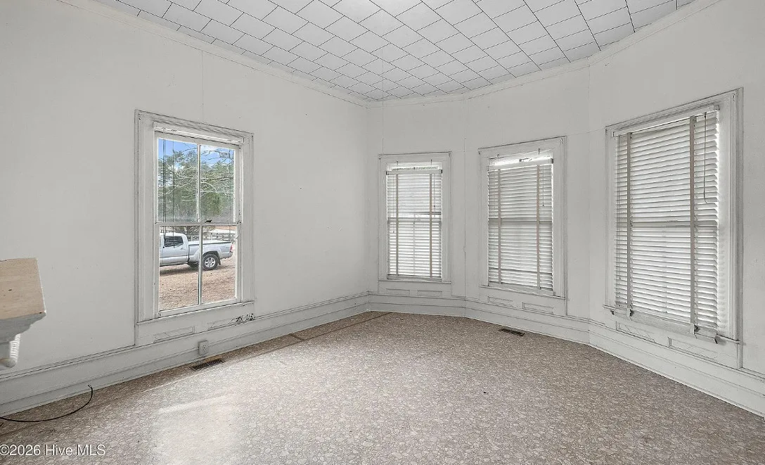 This is a pretty setting! Love the old trees and that old barn! Wish they showed the inside of that. This is known as the Charlie W. Joyner homeplace. It was built in 1902. It is located on 1.64 acres in Rocky Mount, North Carolina. The house could use some updating and undoing of past renovations, but the price is right. I bet there are wood floors underneath the flooring. There are multiple outbuildings on the property. Three bedrooms, one bathroom and 1,859 square feet. $125,000