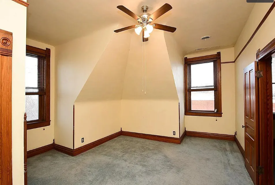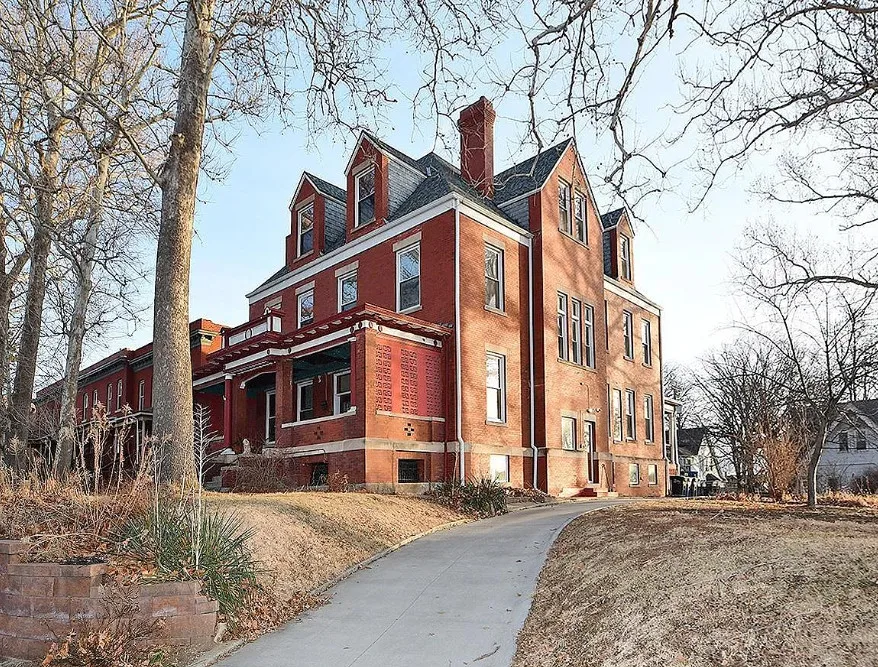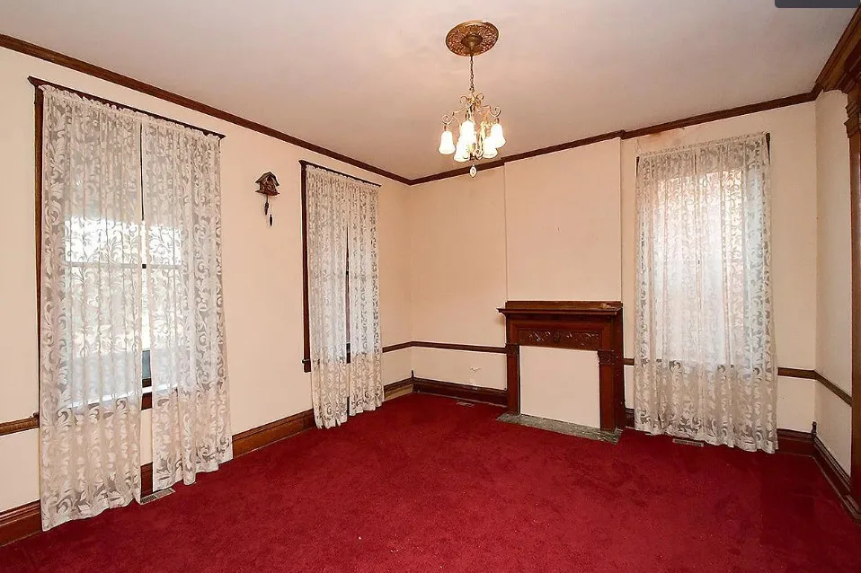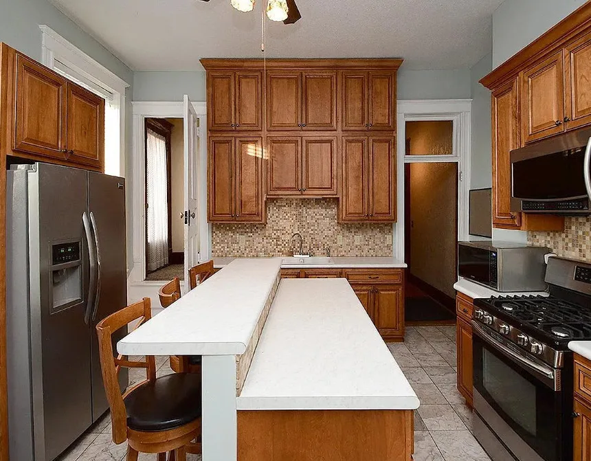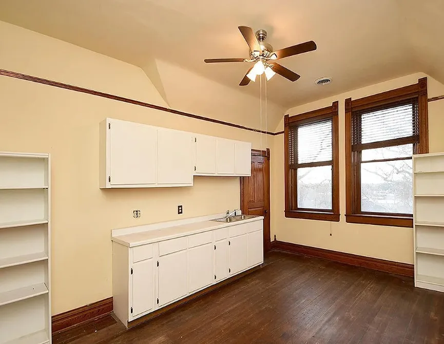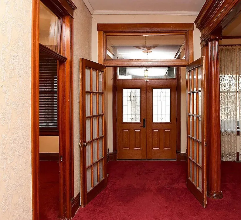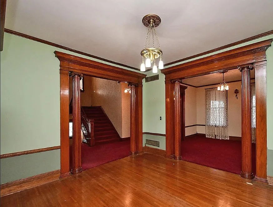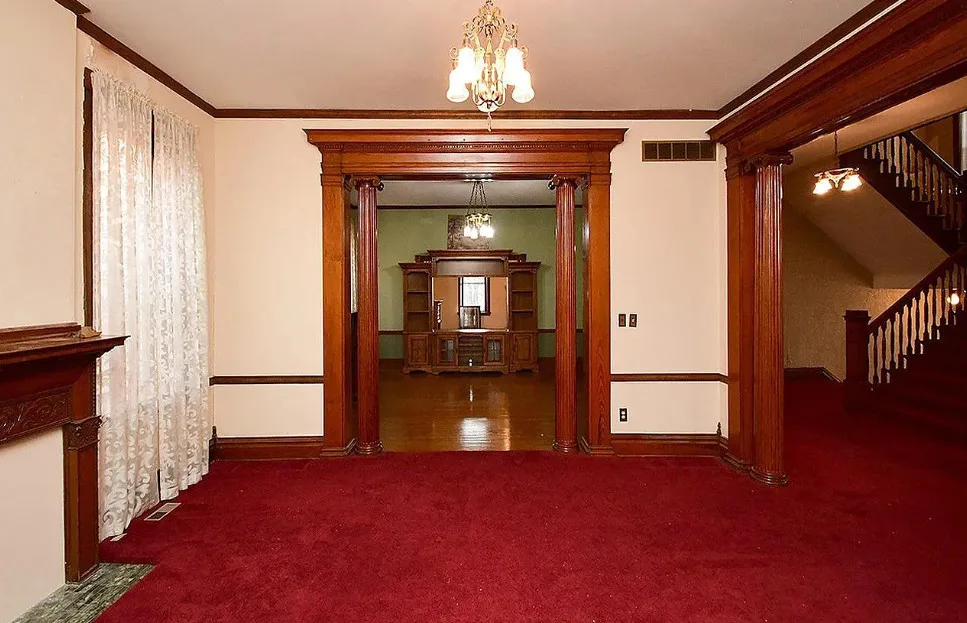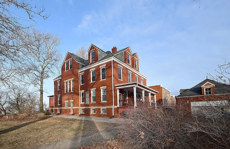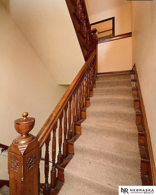 This is a big house with 10 beds/6 bathrooms and over 7,000 square feet! The house was built in 1901. It is located on .41 acre in Omaha, Nebraska. The house features a covered front porch, a covered back porch, wood floors, baseboards, a grand staircase, vintage light fixtures, chair rails, crown moulding, french doors and unpainted woodwork. There is a detached garage on the property. I think the island in the kitchen should be removed. Makes the space too cramped. Ten bedrooms, six bathrooms and 7,444 square feet. $560,000