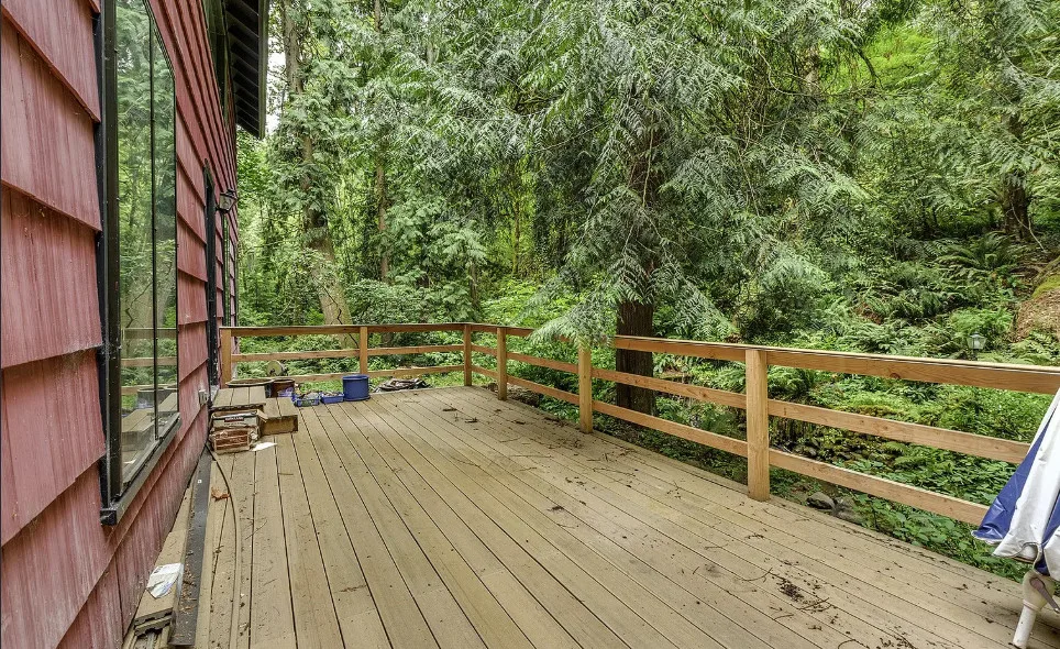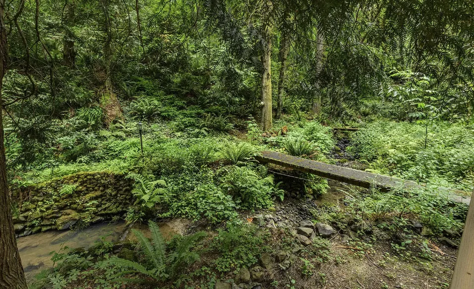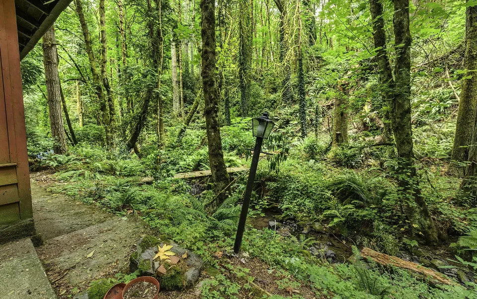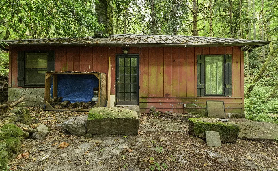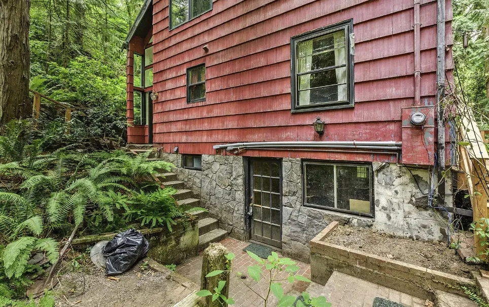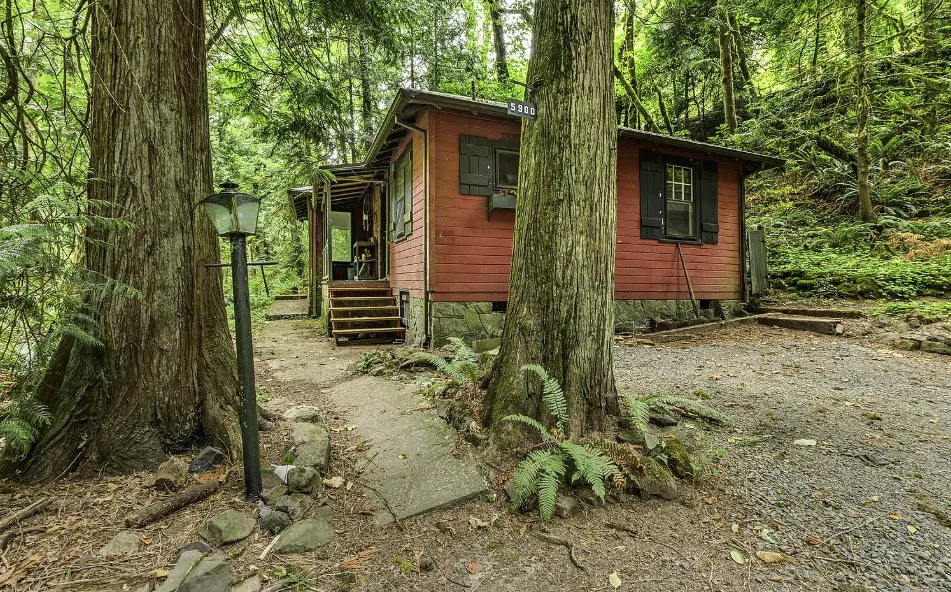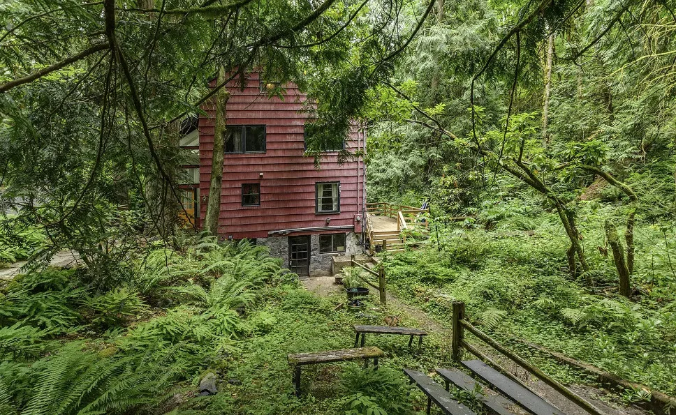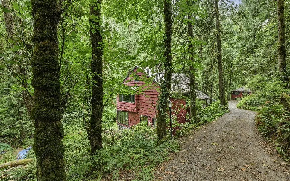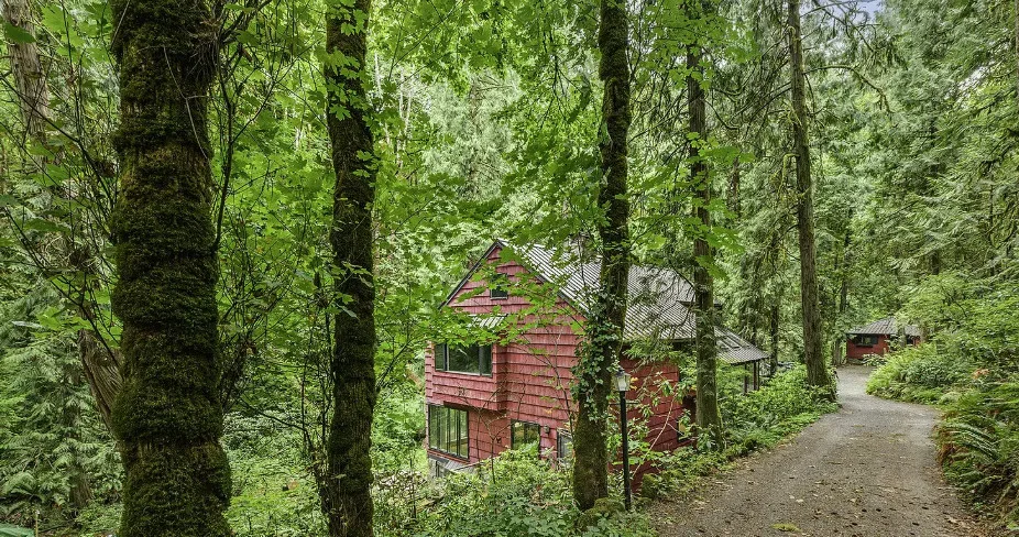 Take a look at that setting! Feel like you might see Bigfoot walking around in there. There is a guesthouse on the property. The house was built in 1940. It is located on 9.39 acres in Portland, Oregon. The house features a great entryway with soaring ceilings and a wall of windows, parquet flooring, built-in bookshelves, stone fireplace and a spacious kitchen. There is a large basement. The guesthouse has two bedrooms and one bathroom. Four bedrooms, two bathrooms and 2,958 square feet. $899,000