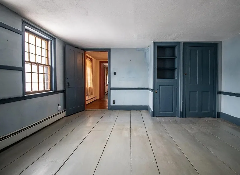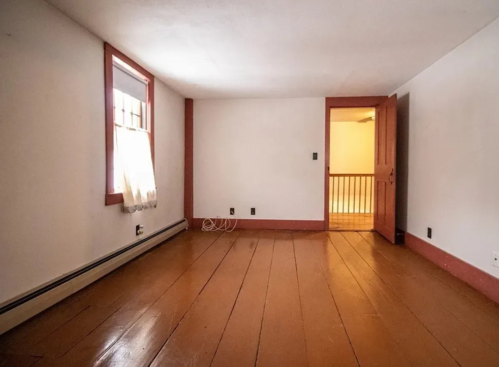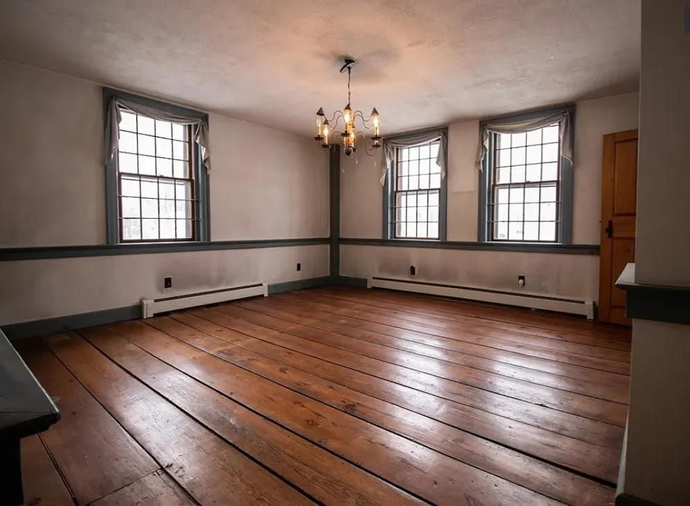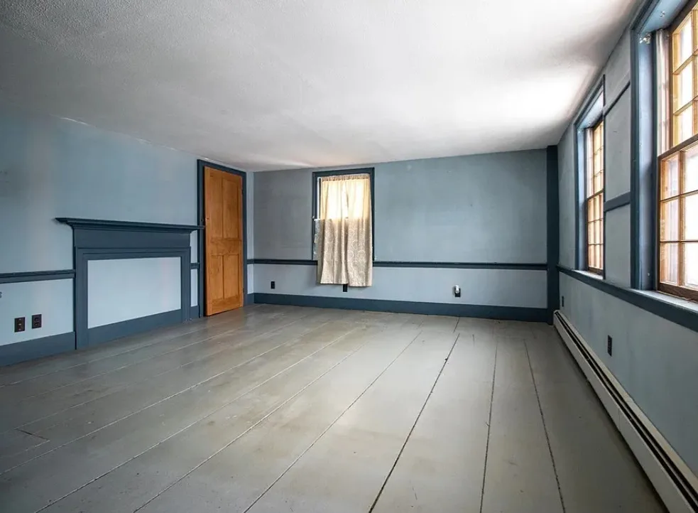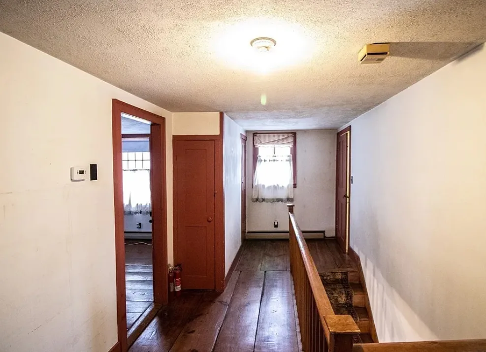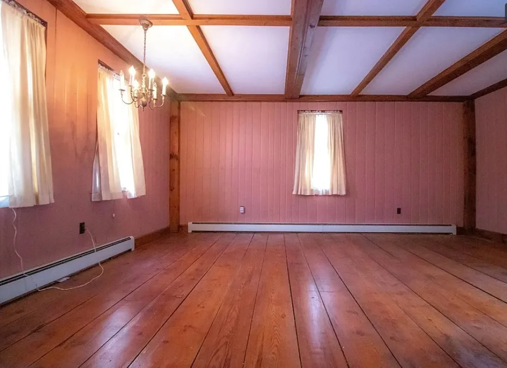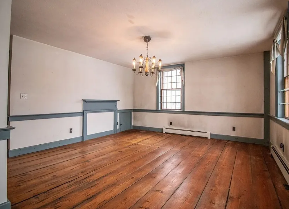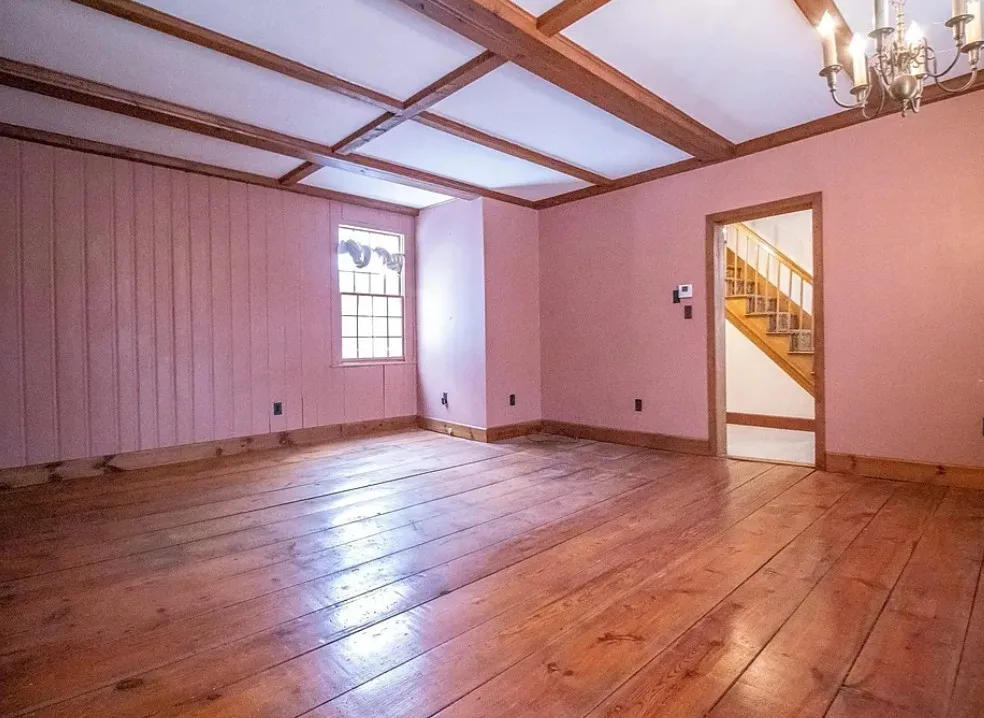 How about those wide floor boards! They are beautiful! This house has a lot of potential! It is known as the Park Holland House. The first owner was the owner of the Belchertown Carriage Manufacturer. The house was built in 1810. It is located on .81 acre in Belchertown, Massachusetts. The house features wide plank wood floors, amazing front door with original hardware, chair rails, spacious kitchen, baseboards and coffered ceiling. Three bedrooms, two bathrooms and 2,172 square feet. $299,900