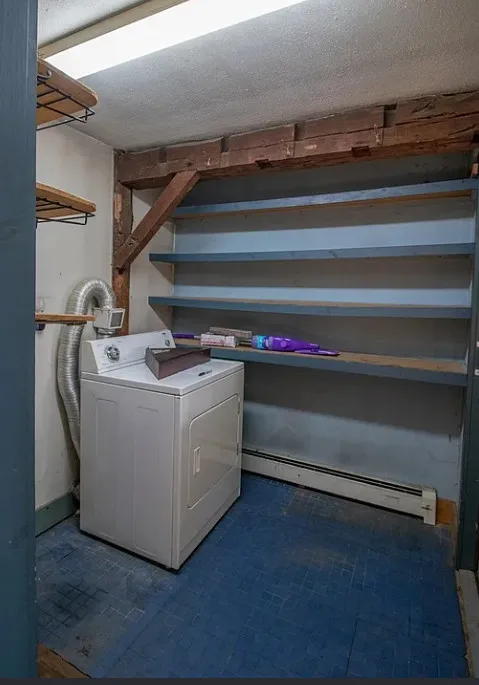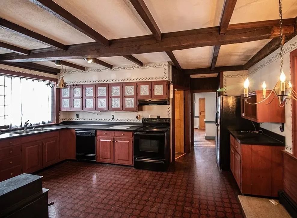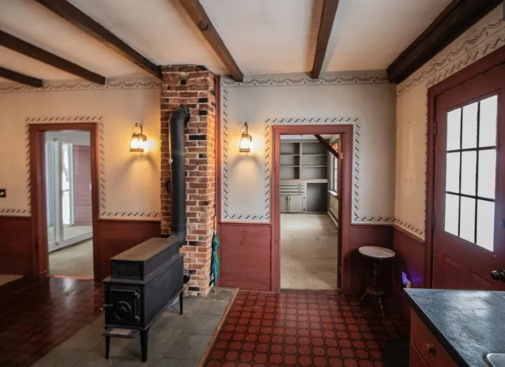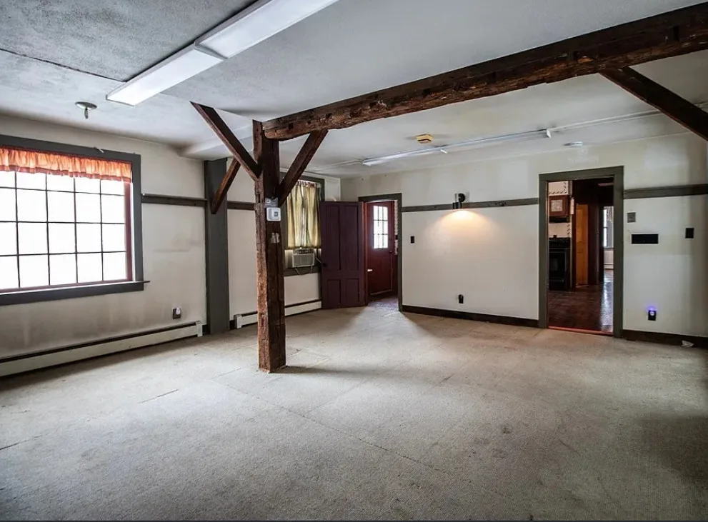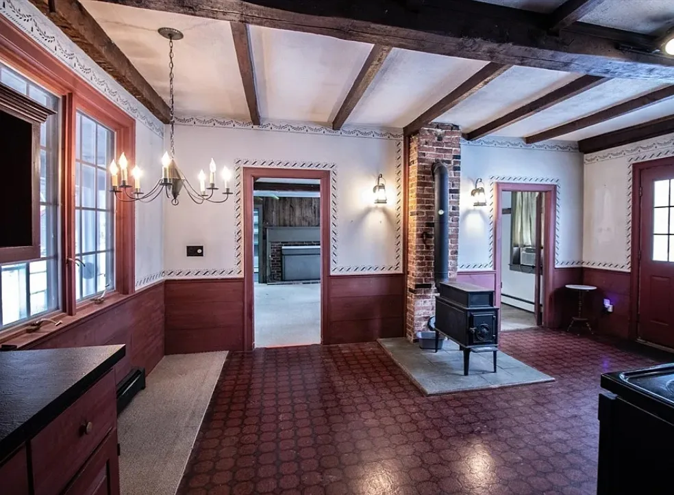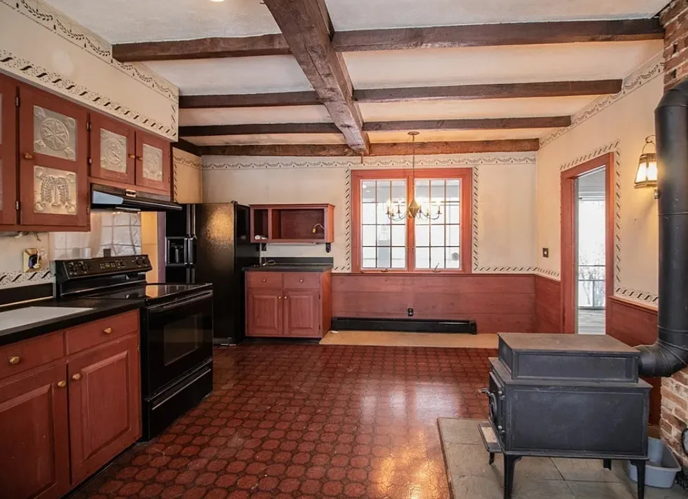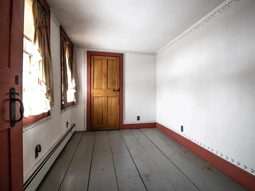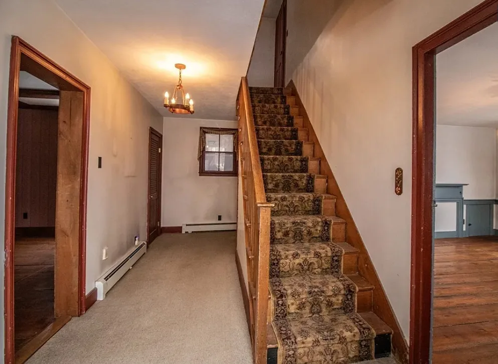 How about those wide floor boards! They are beautiful! This house has a lot of potential! It is known as the Park Holland House. The first owner was the owner of the Belchertown Carriage Manufacturer. The house was built in 1810. It is located on .81 acre in Belchertown, Massachusetts. The house features wide plank wood floors, amazing front door with original hardware, chair rails, spacious kitchen, baseboards and coffered ceiling. Three bedrooms, two bathrooms and 2,172 square feet. $299,900