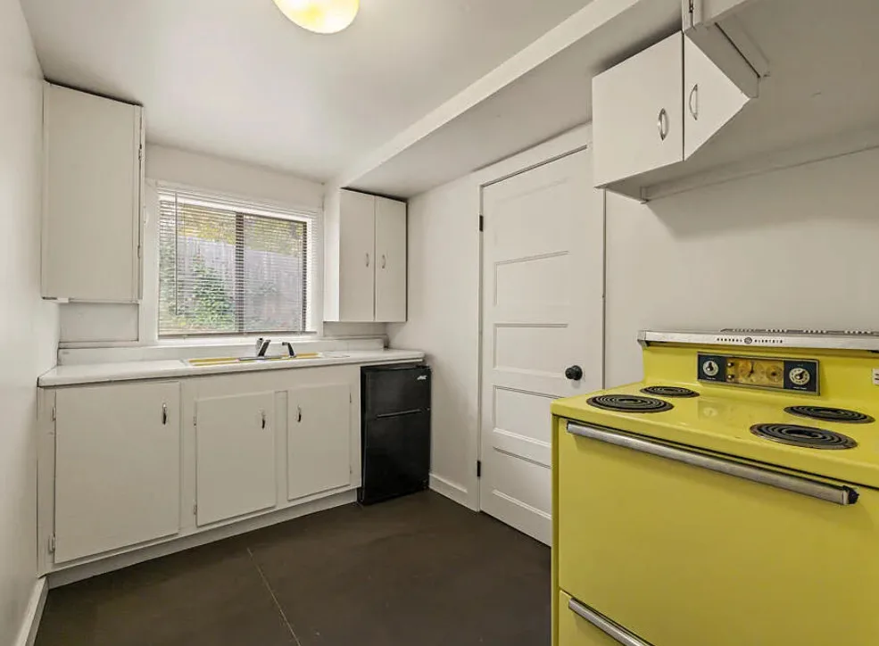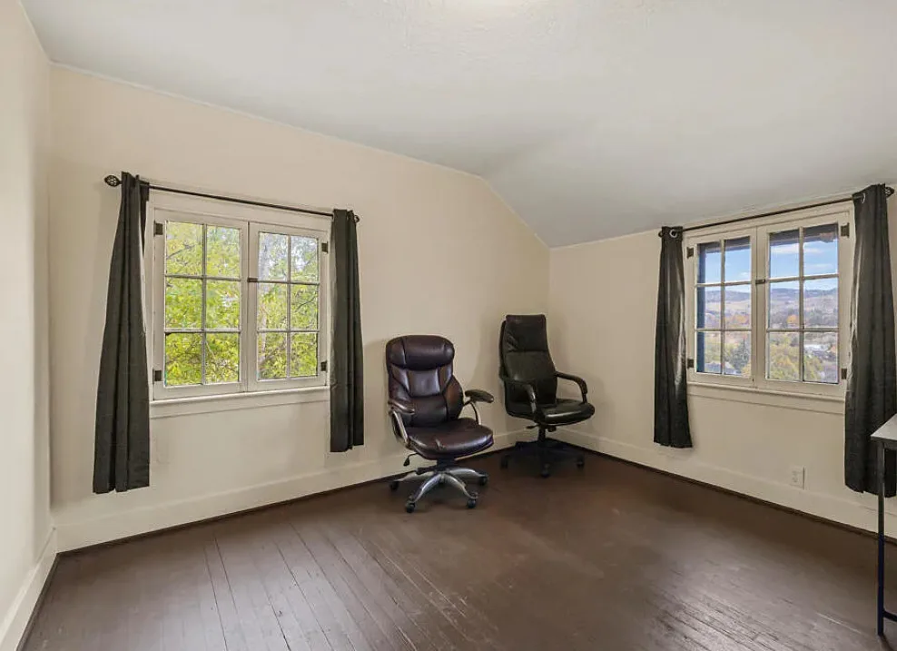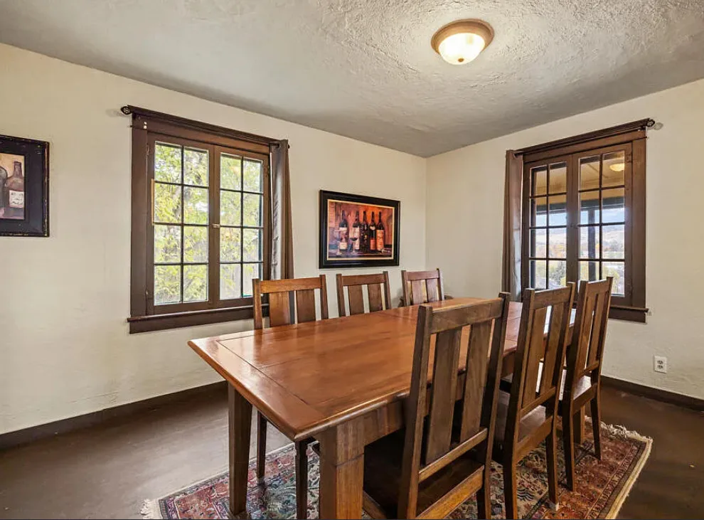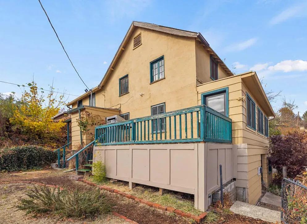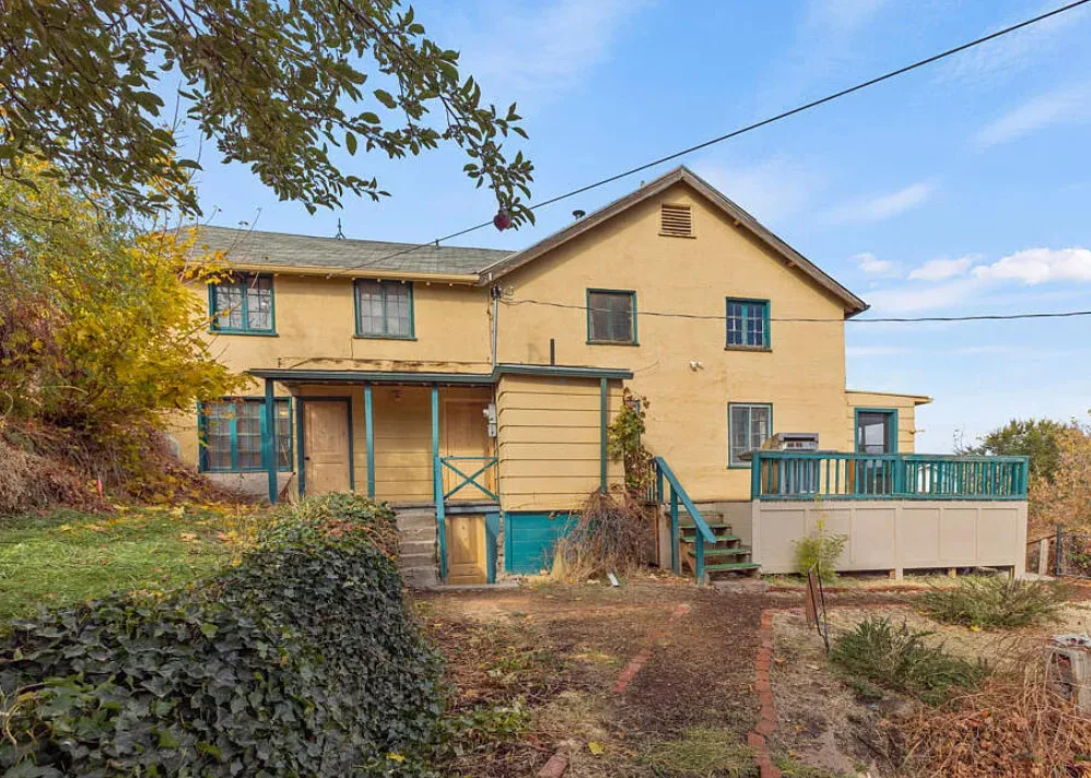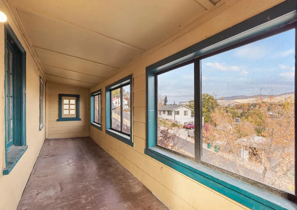 There are some pretty views of the mountains from this Oregon house! The interior has nice potential. How about that yellow stove! The house was built in 1924. It is located Klamath Falls, Oregon. The house features an enclosed front porch, a side porch, wood floors, large wood stove with stone hearth, baseboards and arched entryways. The house could use some work, some updating and some color, but there is great potential. Seven bedrooms, three bathrooms and 2,288 square feet. $239,000