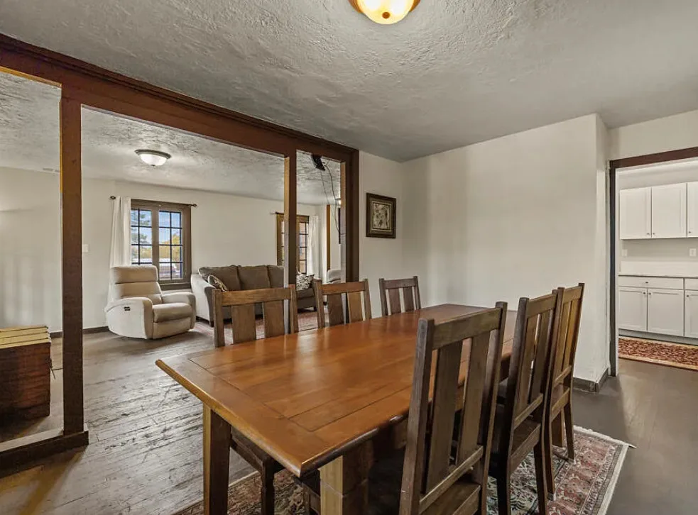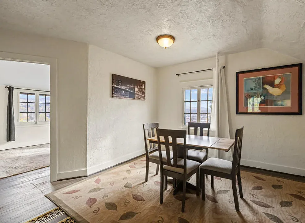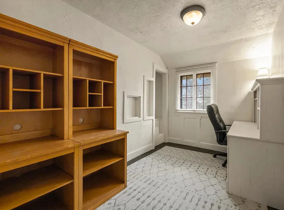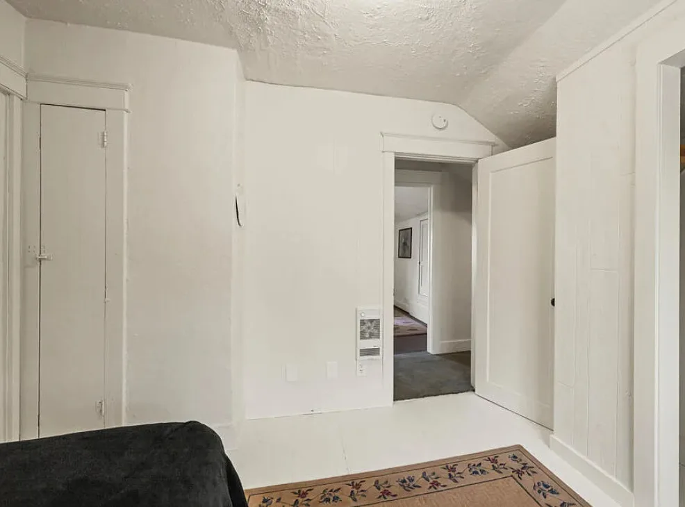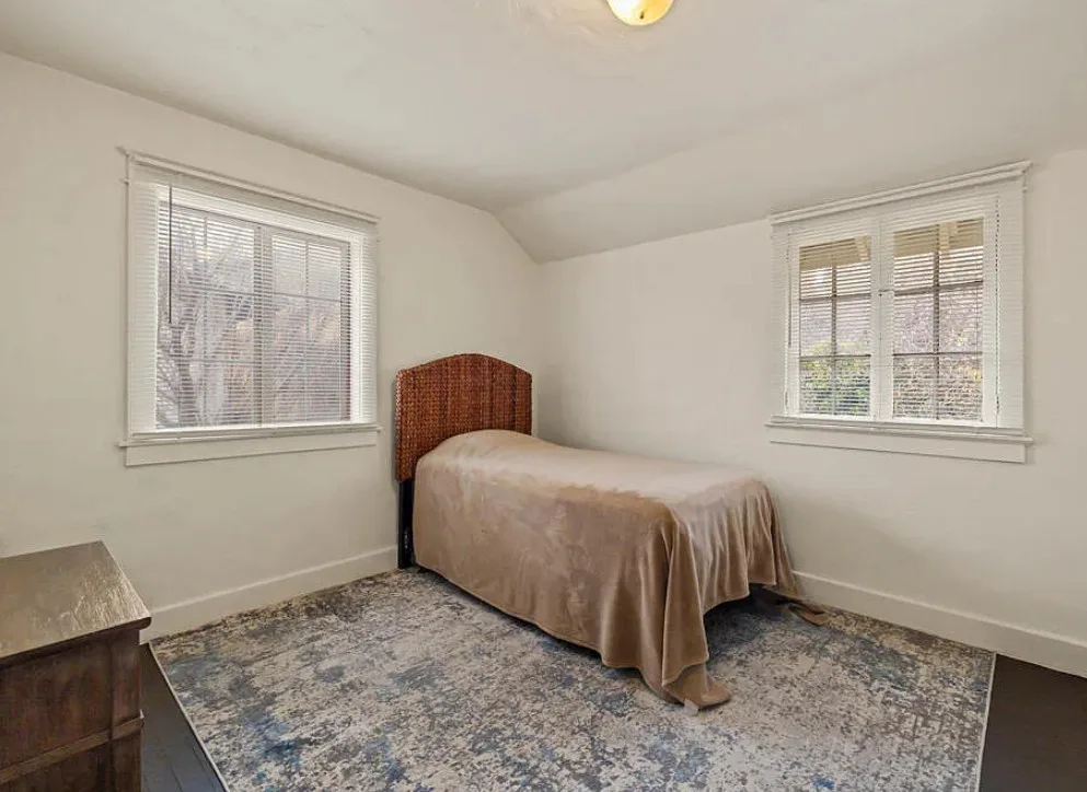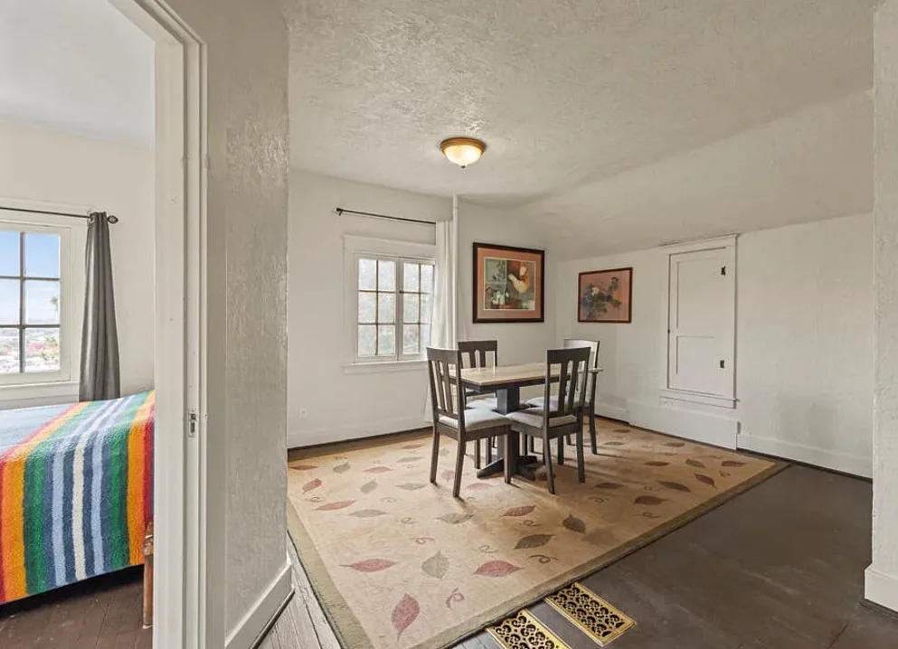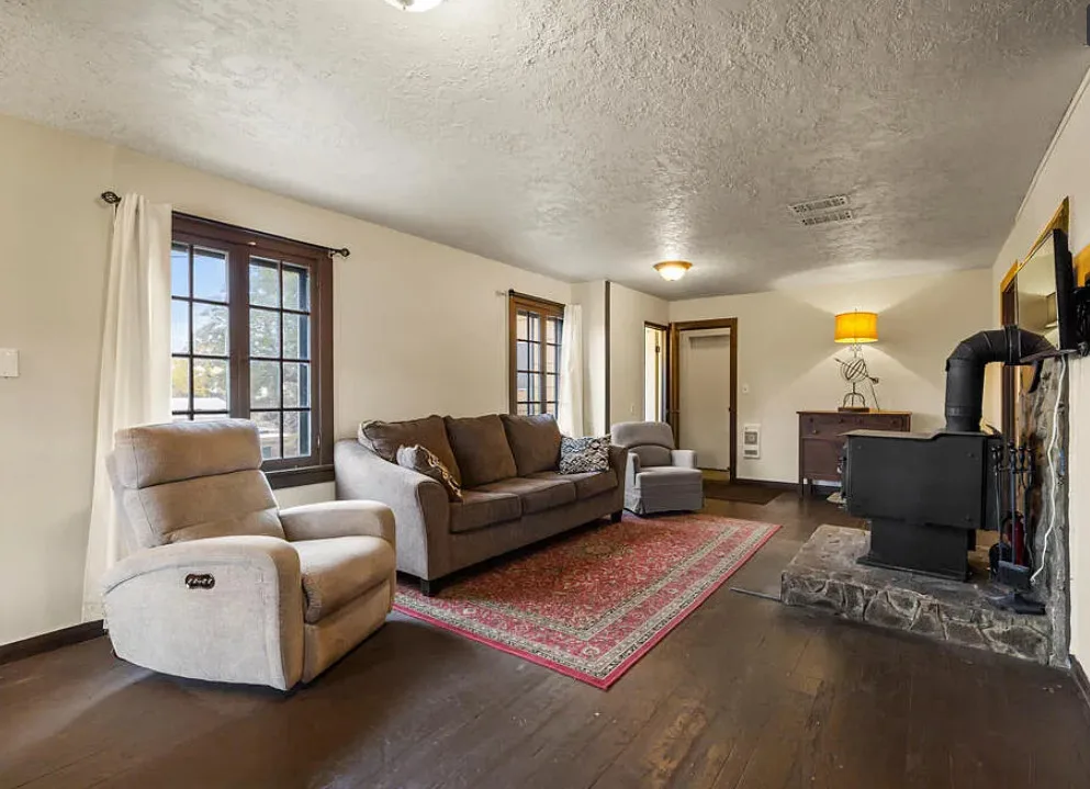 There are some pretty views of the mountains from this Oregon house! The interior has nice potential. How about that yellow stove! The house was built in 1924. It is located Klamath Falls, Oregon. The house features an enclosed front porch, a side porch, wood floors, large wood stove with stone hearth, baseboards and arched entryways. The house could use some work, some updating and some color, but there is great potential. Seven bedrooms, three bathrooms and 2,288 square feet. $239,000