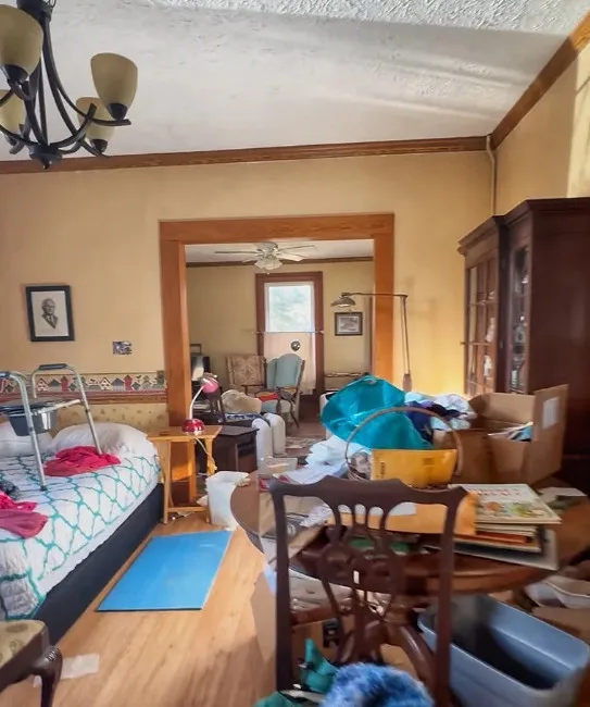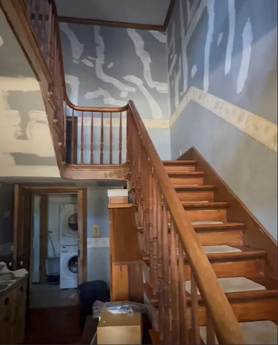 This has a pretty setting and pretty views! Definitely a fixer upper, but it has potential! Wish there were more interior pictures. The house was built in 1881. It is located on 2.63 acres in Sugar Grove, Virginia. The house features a covered front porch, wood floors, stone hearth, crown moulding and a nice staircase. There is a spring-fed pond and a detached garage on the property. Four bedrooms, two bathrooms and 2,200 square feet. $180,000