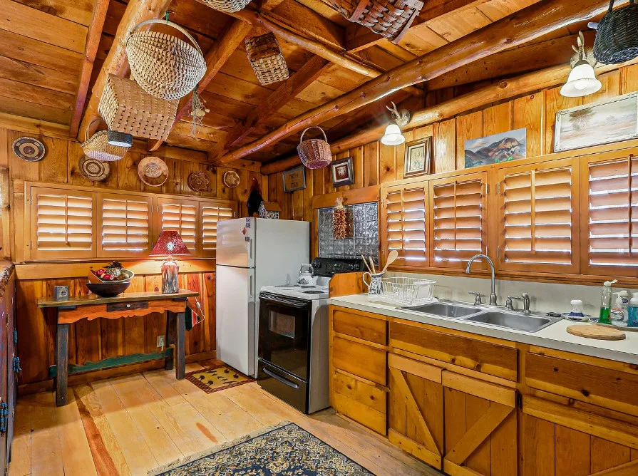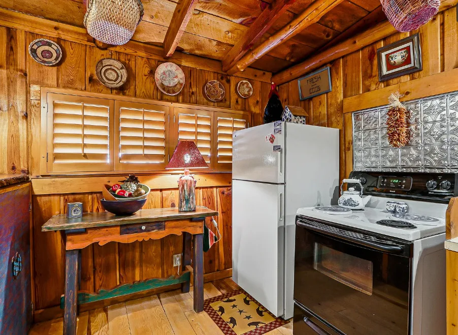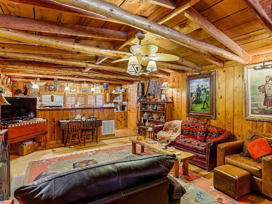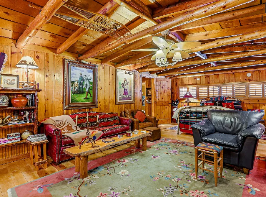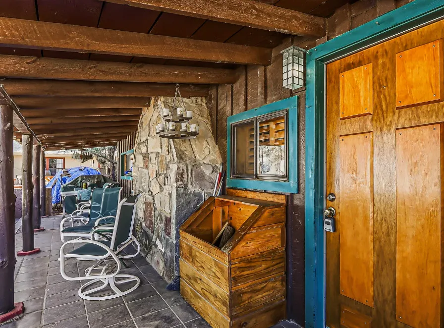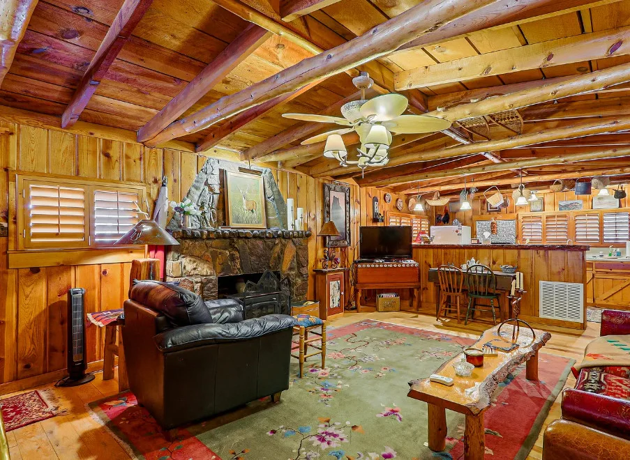 This house is rustic, but it is also nice! There are great details inside. The house was built in 1945. It is located in Ruidoso, New Mexico. The house features The home is situated across the street from a golf course. The house features a covered front porch, a large side patio, knotty pine, exposed beams and a stone fireplace. One bedroom, one bathroom and 800 square feet. $199,950