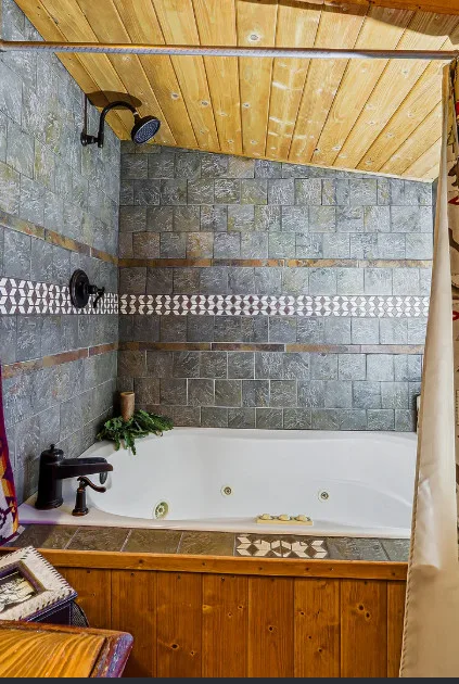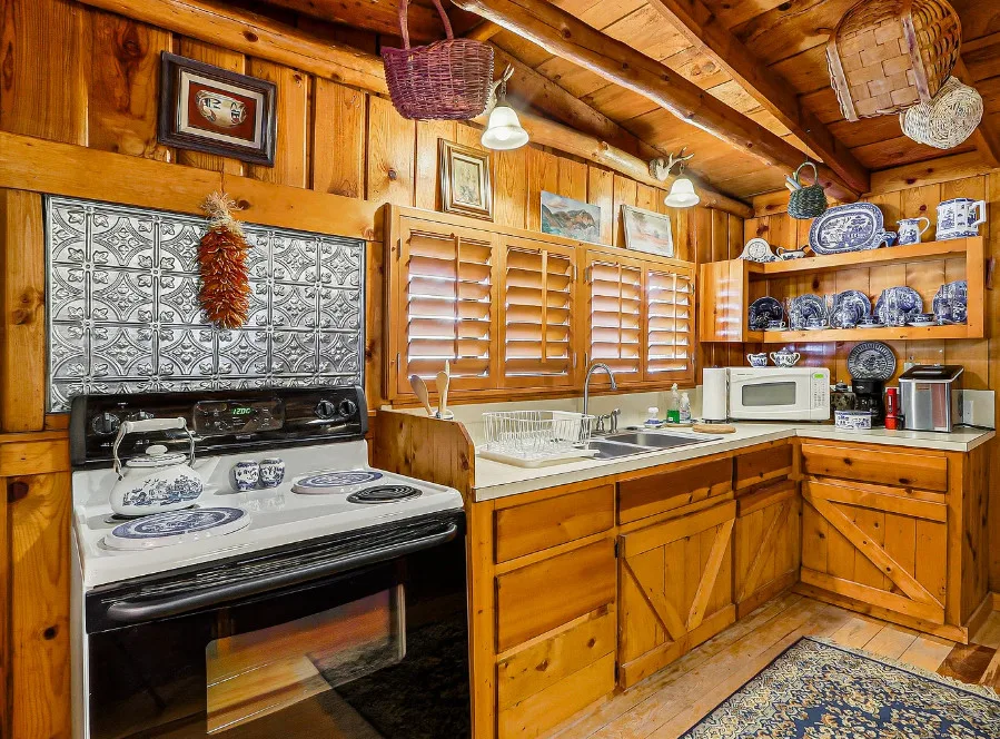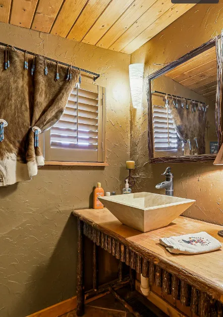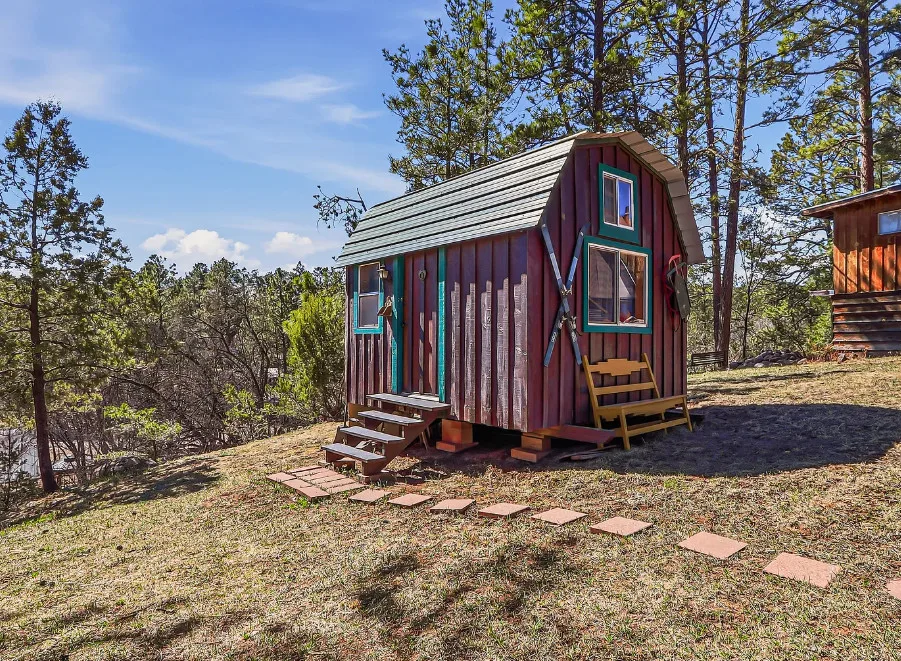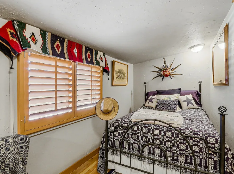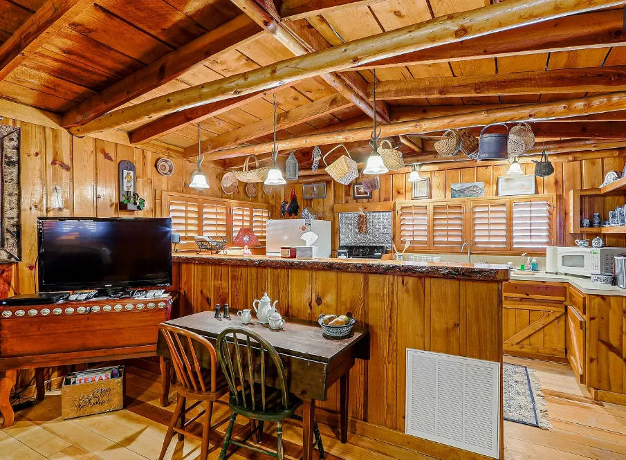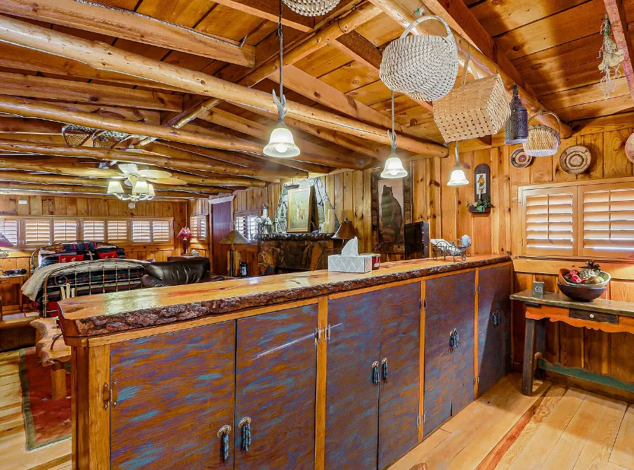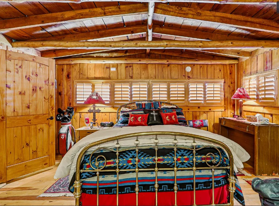 This house is rustic, but it is also nice! There are great details inside. The house was built in 1945. It is located in Ruidoso, New Mexico. The house features The home is situated across the street from a golf course. The house features a covered front porch, a large side patio, knotty pine, exposed beams and a stone fireplace. One bedroom, one bathroom and 800 square feet. $199,950