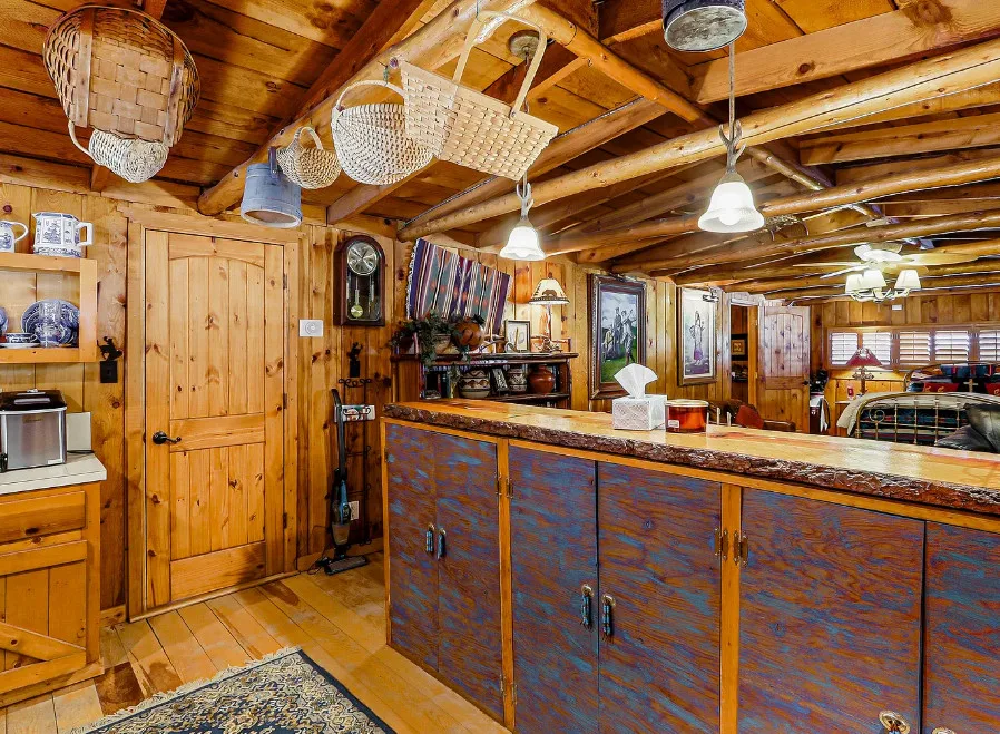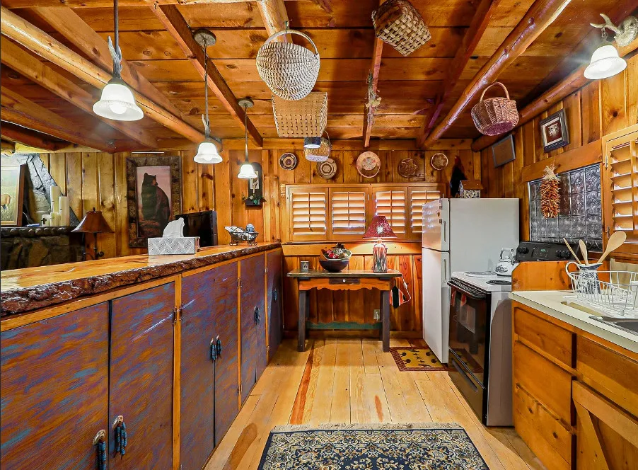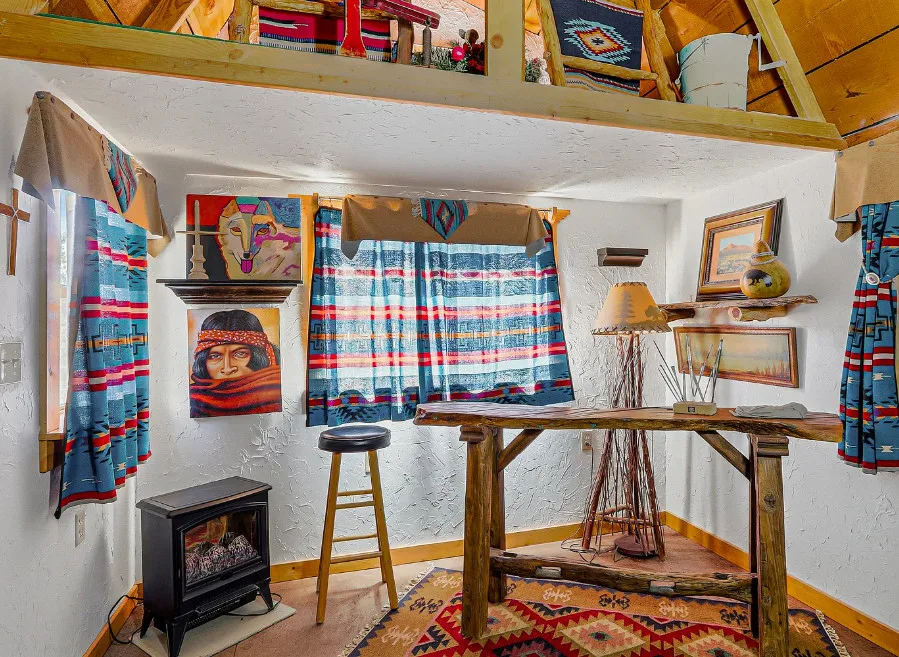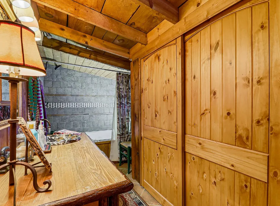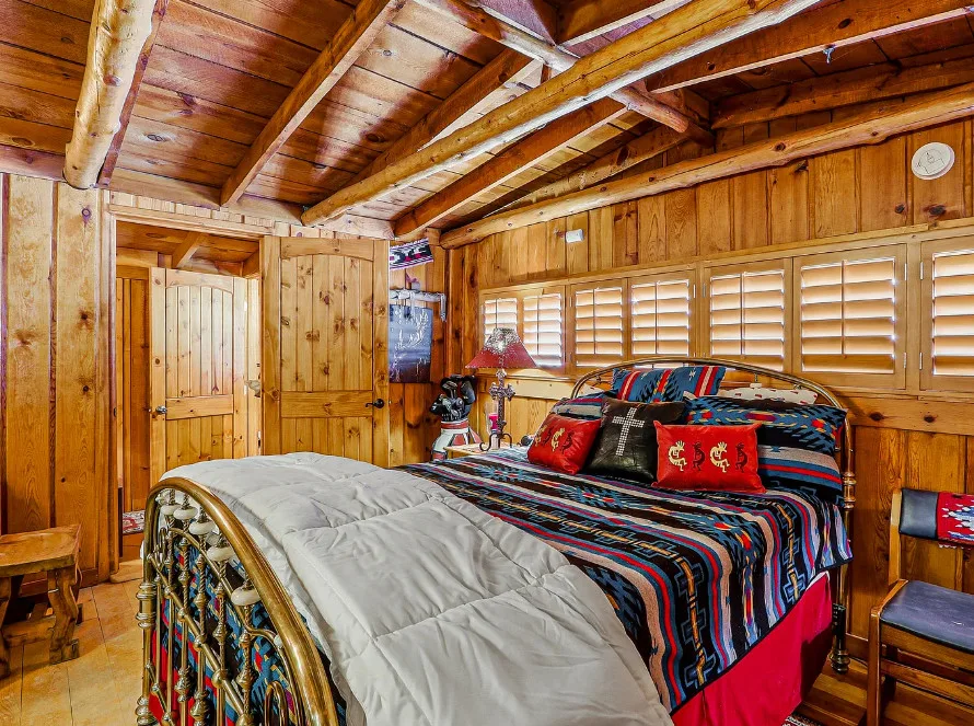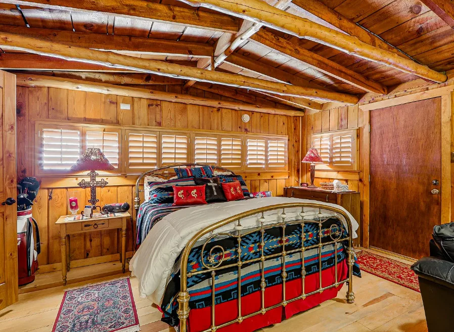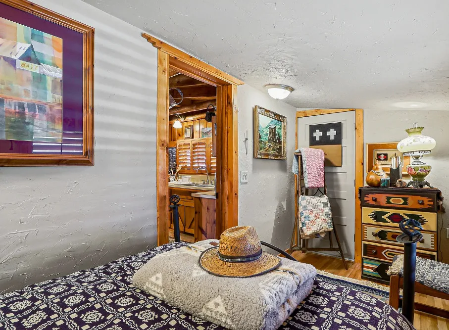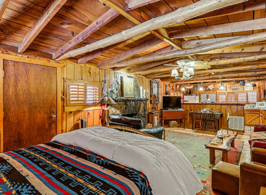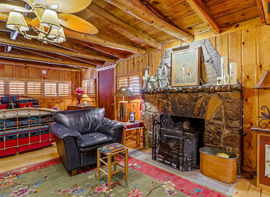 This house is rustic, but it is also nice! There are great details inside. The house was built in 1945. It is located in Ruidoso, New Mexico. The house features The home is situated across the street from a golf course. The house features a covered front porch, a large side patio, knotty pine, exposed beams and a stone fireplace. One bedroom, one bathroom and 800 square feet. $199,950