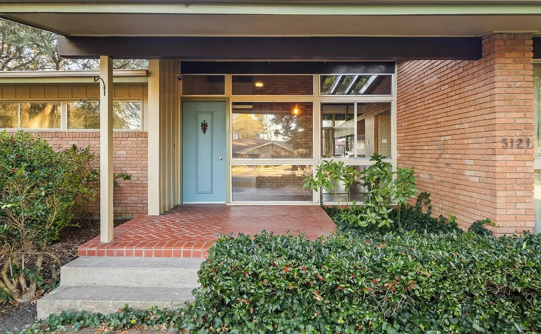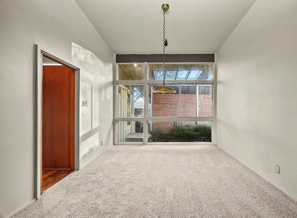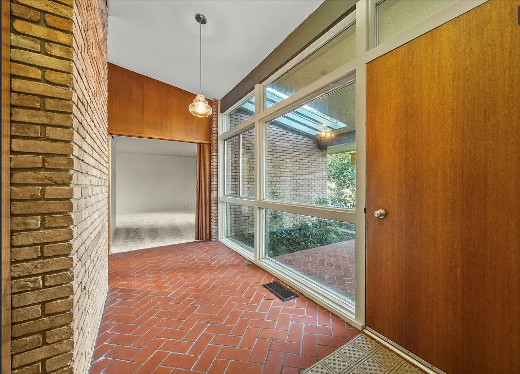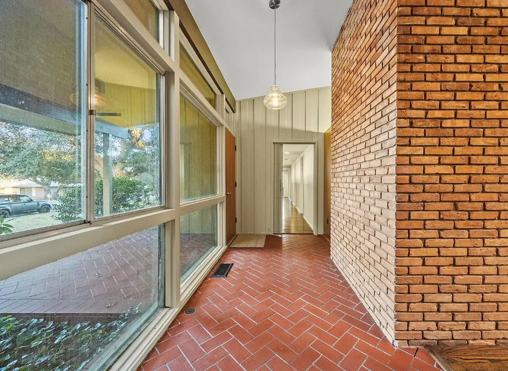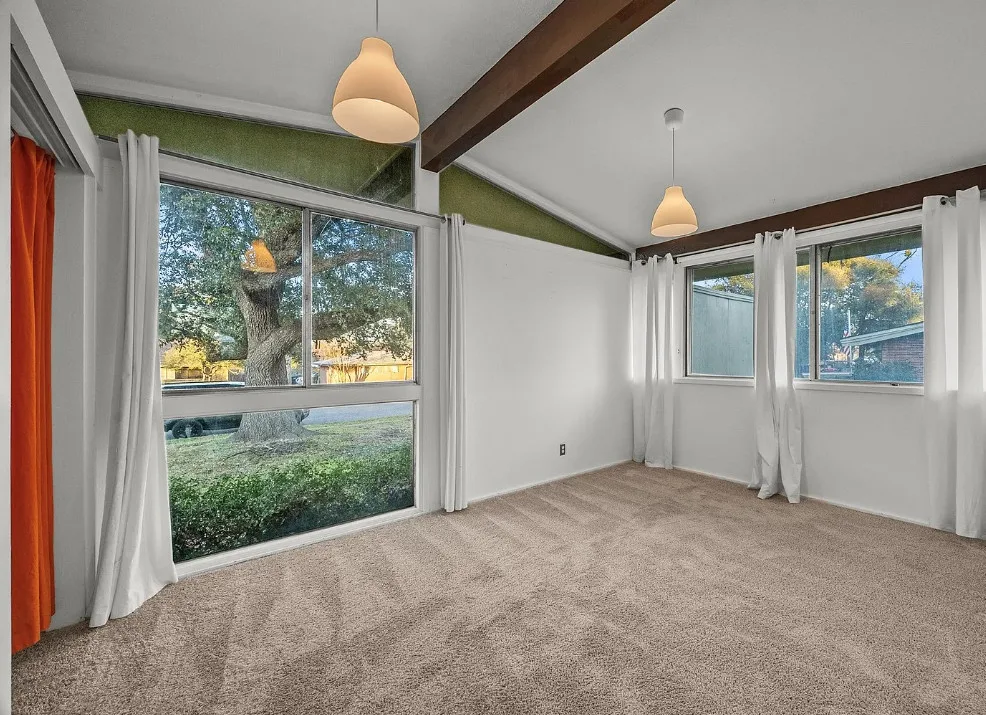 Love a good mid-century modern! This one has nice details! There is a pool on the property, but the listing says it needs work. The house was built in 1955. It is located on .5 acre in Greenville, Texas. The house features a covered front porch, exposed brick, nice windows, a lot of natural light, spacious kitchen, wood floors and vintage bathrooms. There is a large backyard patio, great old trees and an in-ground pool. Four bedrooms, three bathrooms and 2,366 square feet. $280,000