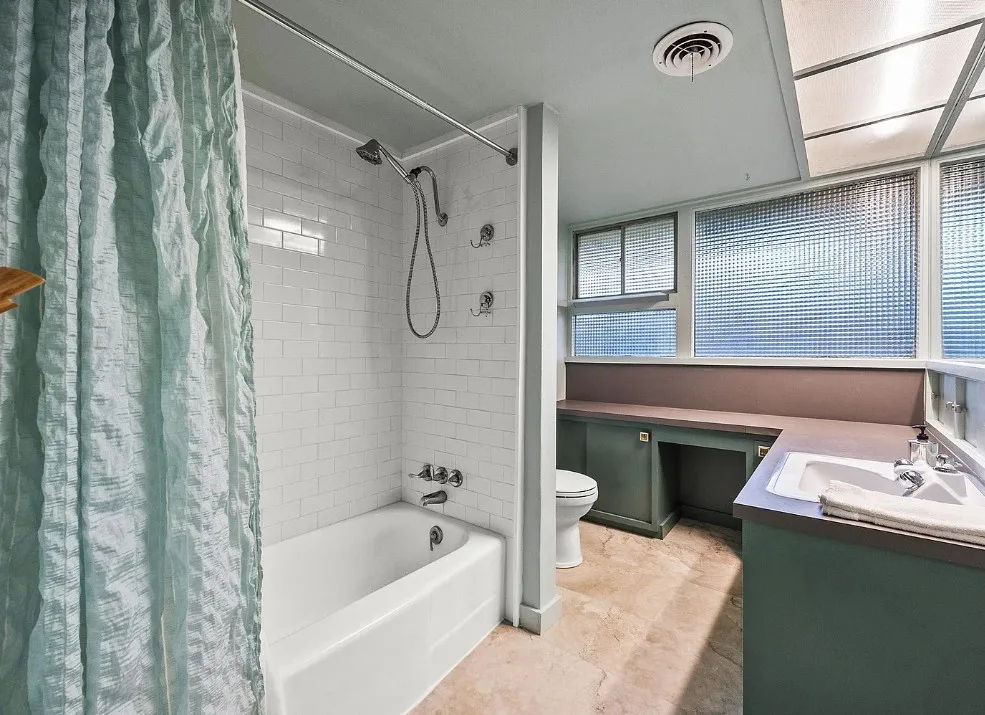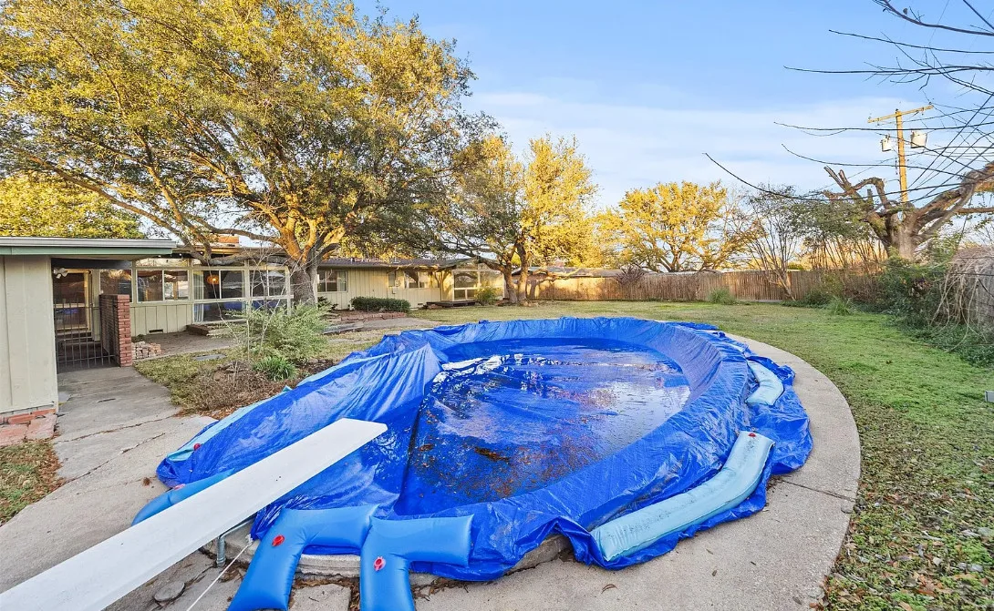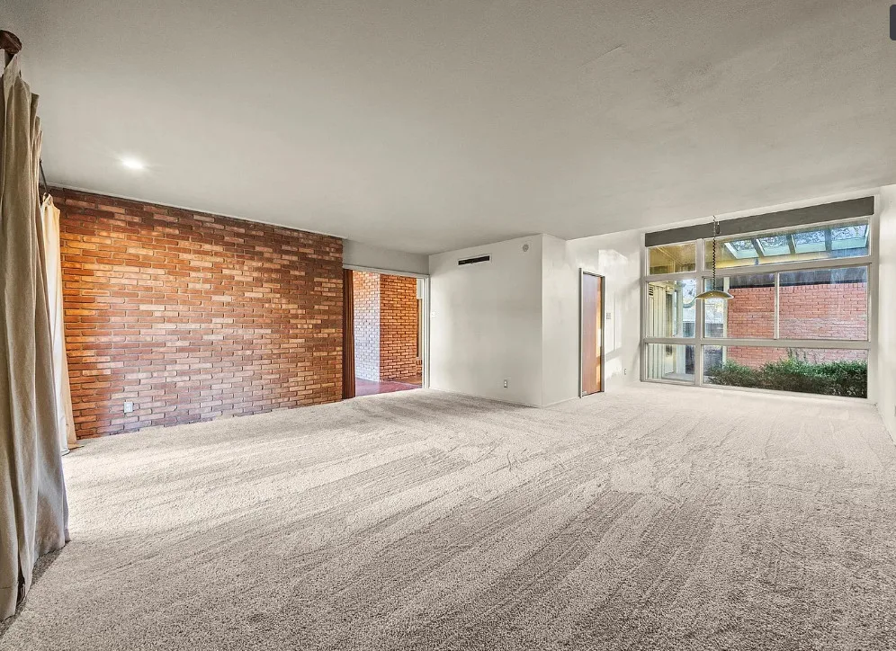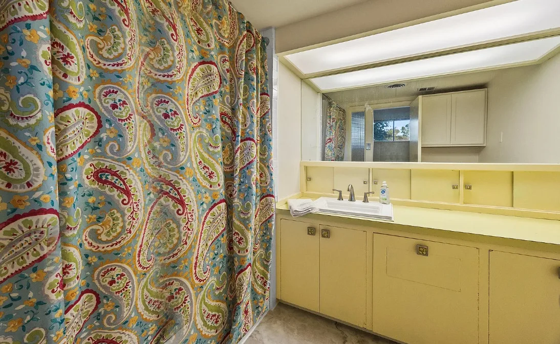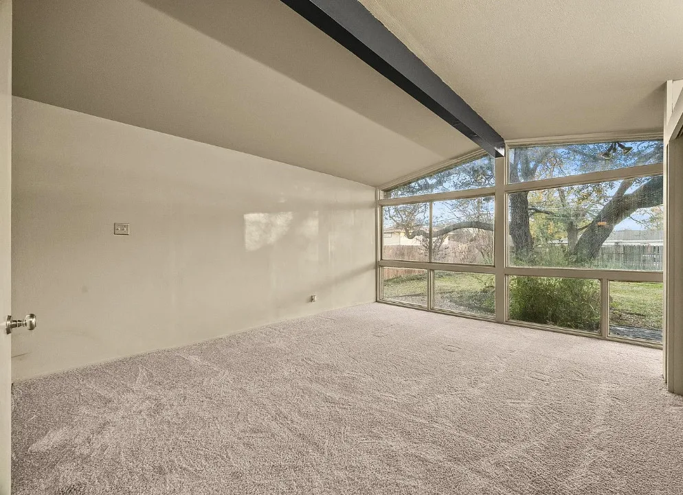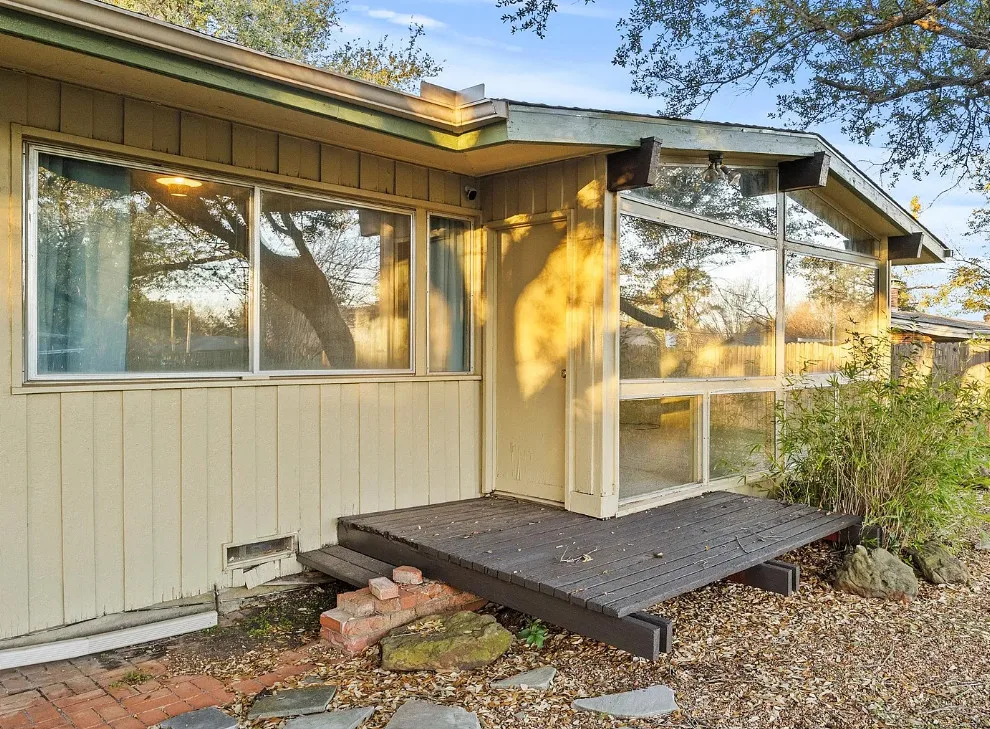 Love a good mid-century modern! This one has nice details! There is a pool on the property, but the listing says it needs work. The house was built in 1955. It is located on .5 acre in Greenville, Texas. The house features a covered front porch, exposed brick, nice windows, a lot of natural light, spacious kitchen, wood floors and vintage bathrooms. There is a large backyard patio, great old trees and an in-ground pool. Four bedrooms, three bathrooms and 2,366 square feet. $280,000