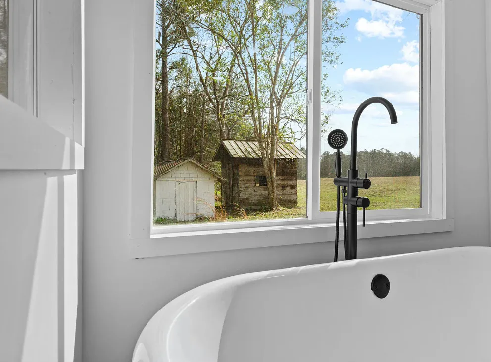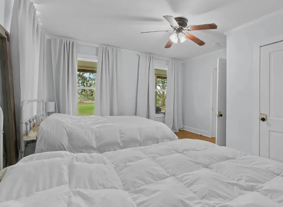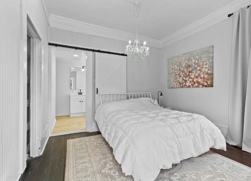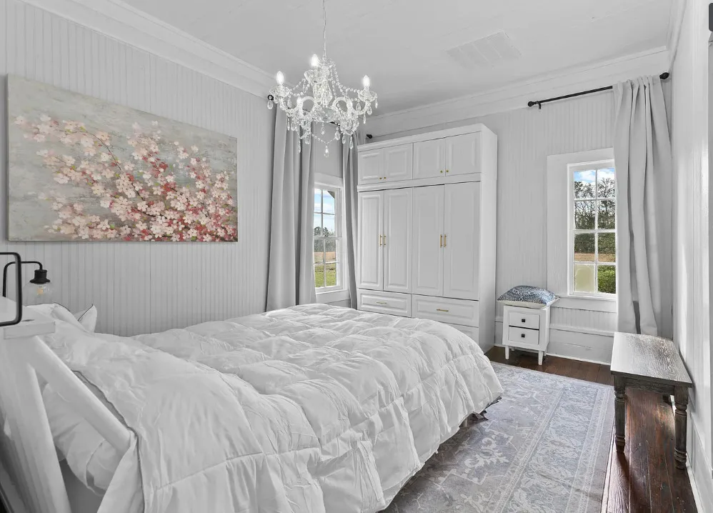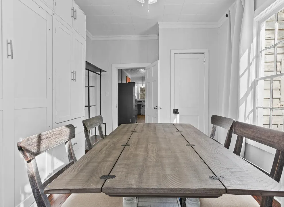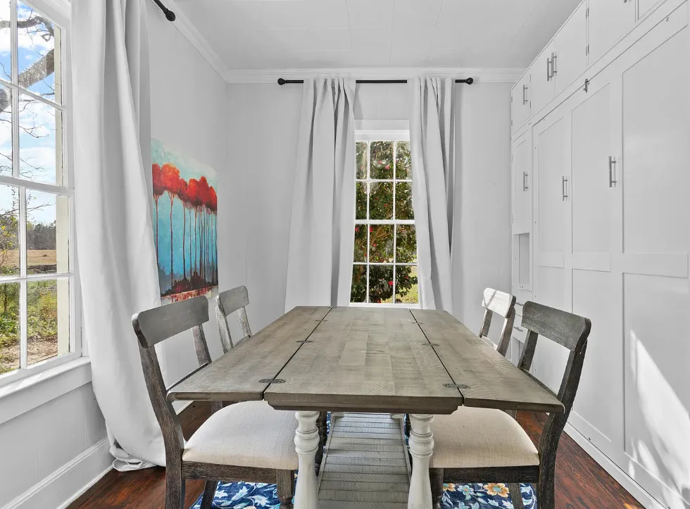 The trees on this property are beautiful! It’s a really pretty setting! The house was built in 1900. It is located on 6.6 acres in Walterboro, South Carolina. The house features a covered front porch, wood floors, a lot of natural light, a claw foot tub, crown moulding, wide baseboards, bead board, a crystal chandelier, brick fireplace and updated bathrooms. There are a few outbuildings on the property and beautiful moss-draped trees. Three bedrooms, two bathrooms and 1,331 square feet. $395,000