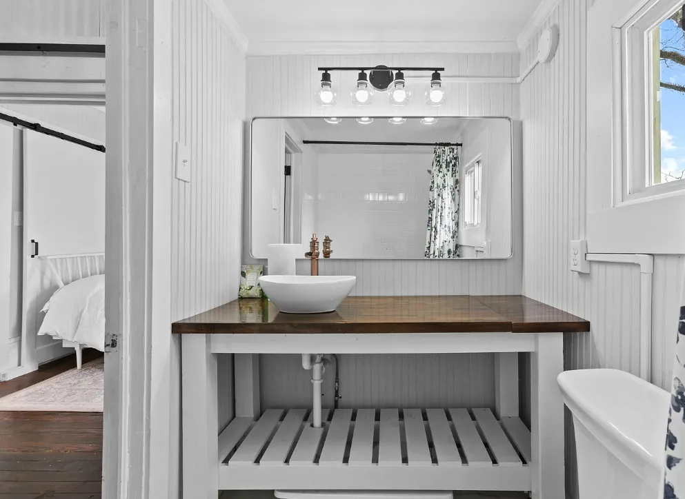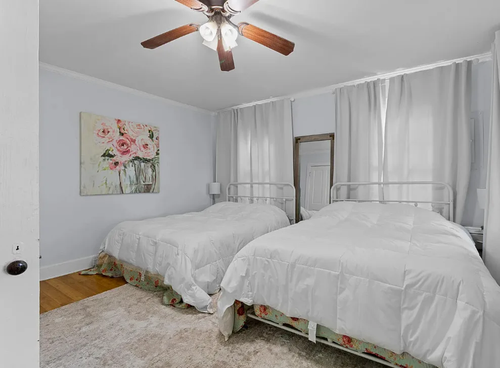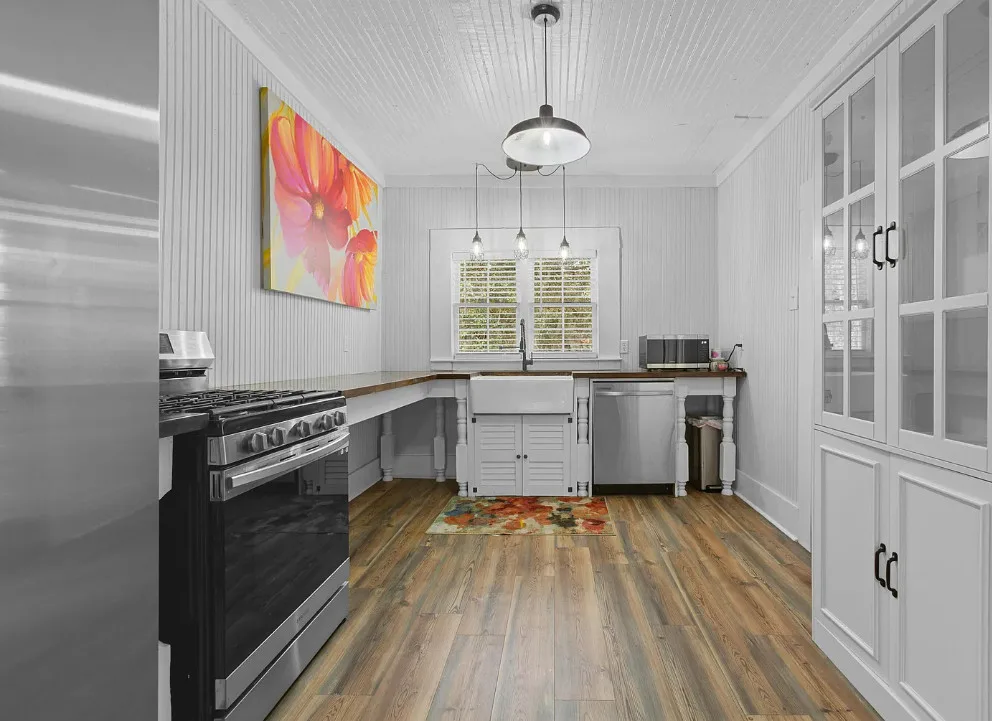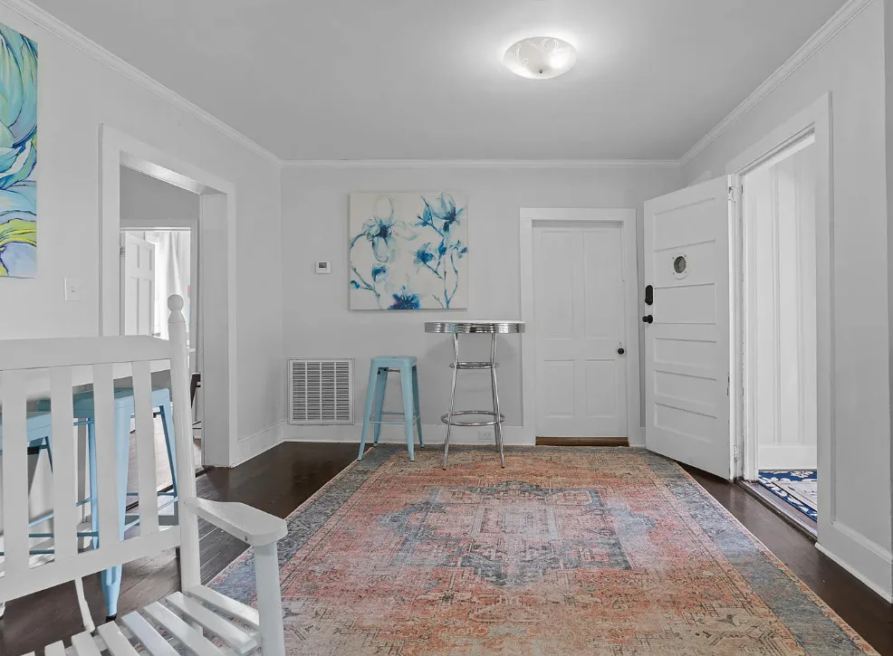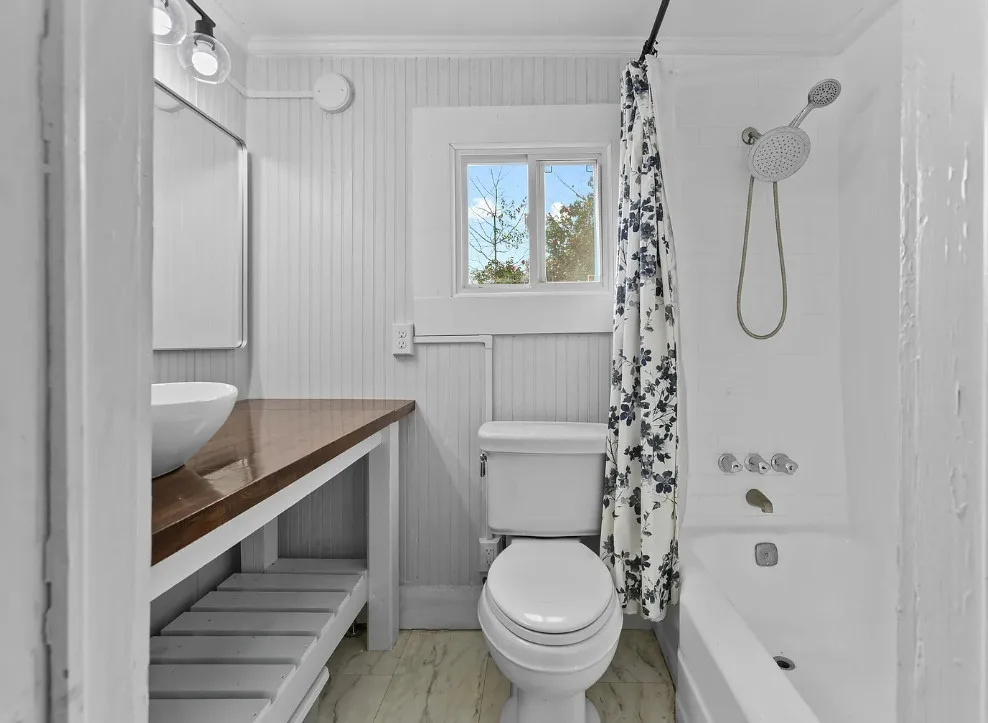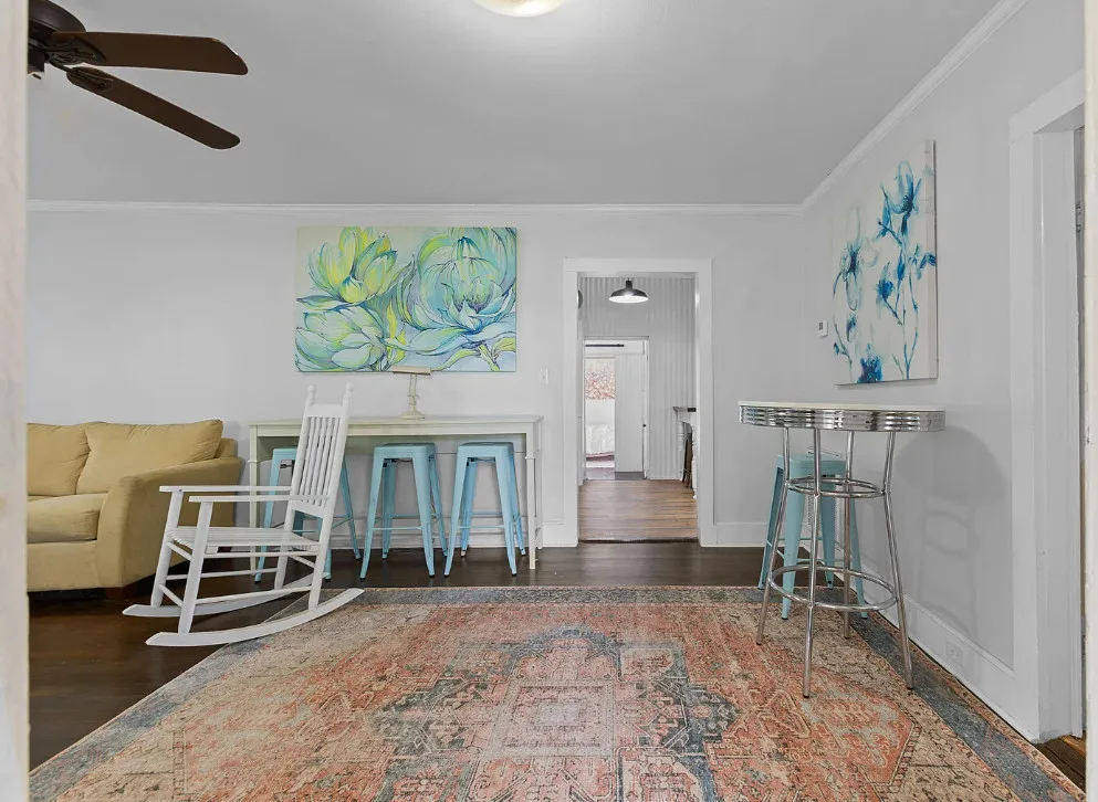 The trees on this property are beautiful! It’s a really pretty setting! The house was built in 1900. It is located on 6.6 acres in Walterboro, South Carolina. The house features a covered front porch, wood floors, a lot of natural light, a claw foot tub, crown moulding, wide baseboards, bead board, a crystal chandelier, brick fireplace and updated bathrooms. There are a few outbuildings on the property and beautiful moss-draped trees. Three bedrooms, two bathrooms and 1,331 square feet. $395,000