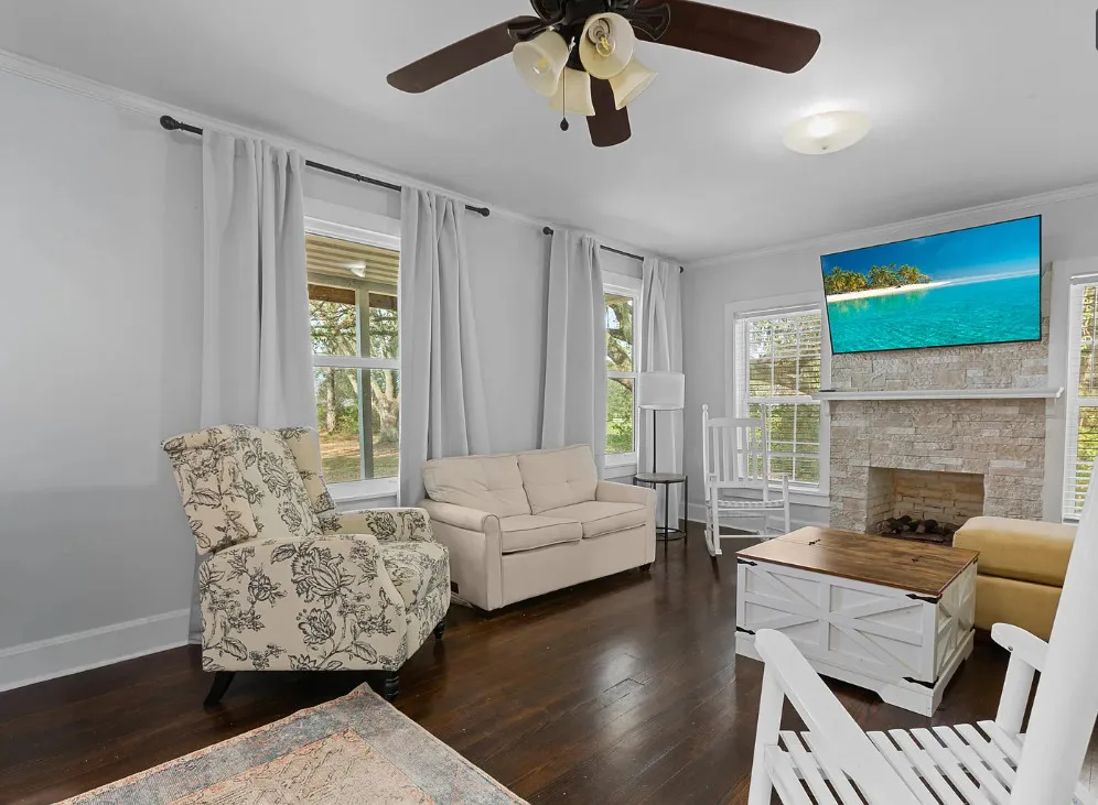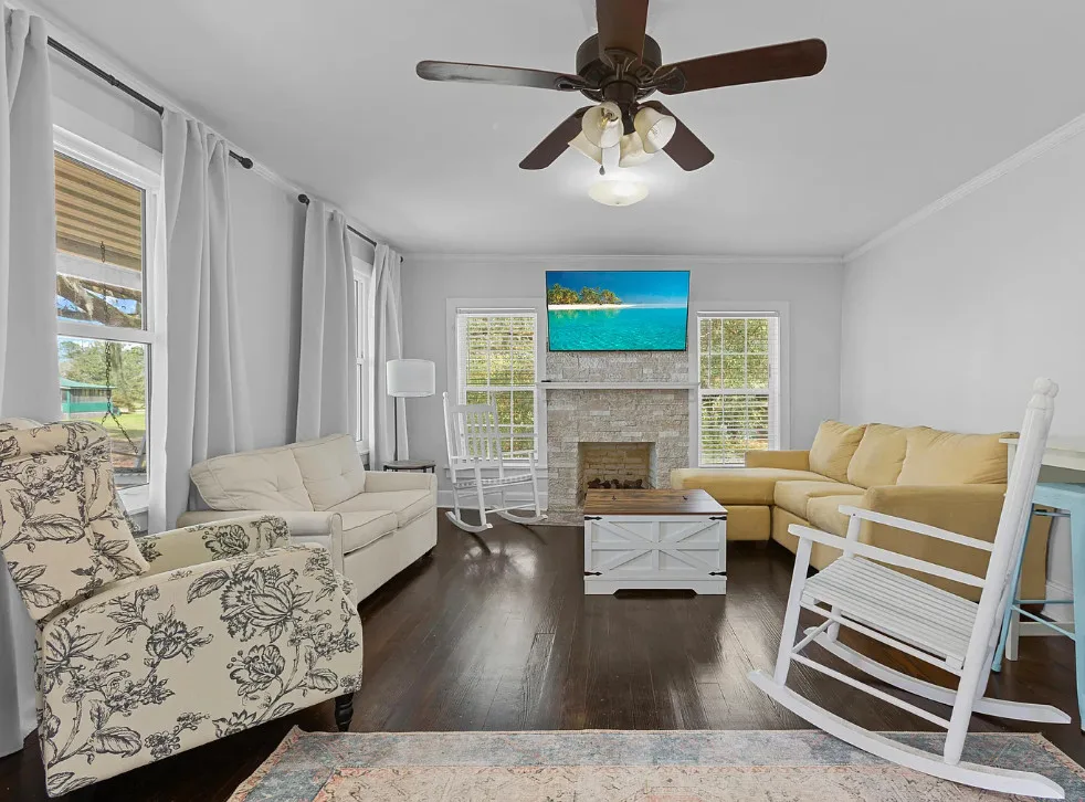 Step back in time with this Southern farmhouse, built circa 1900 and nestled on 6.61 acres beneath majestic Spanish moss draped Oak trees. Beautifully restored, this inviting home blends timeless character with modern comforts, including thoughtfully updated kitchen, bedrooms, bathrooms, tankless water heater and city water. The old barn has potential to be brought back to its original purpose could be great workshop.The peaceful setting offers the kind of quiet country lifestyle that’s getting harder to find. Wide open space surrounds the home, including a nice field that could easily be fenced for horses or used for seasonal planting. Whether you dream of gardening, having horses, chickens or a just a couple of dogs its a rare opportunity to obtain this chance. It is a short