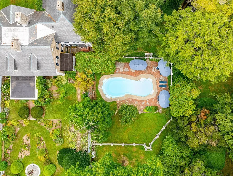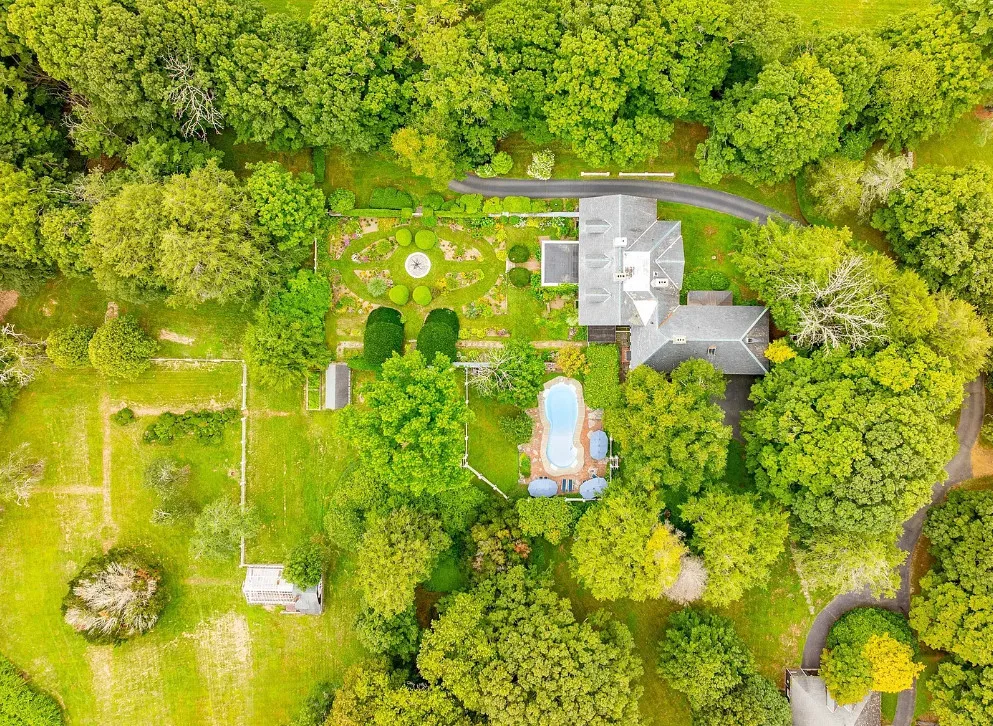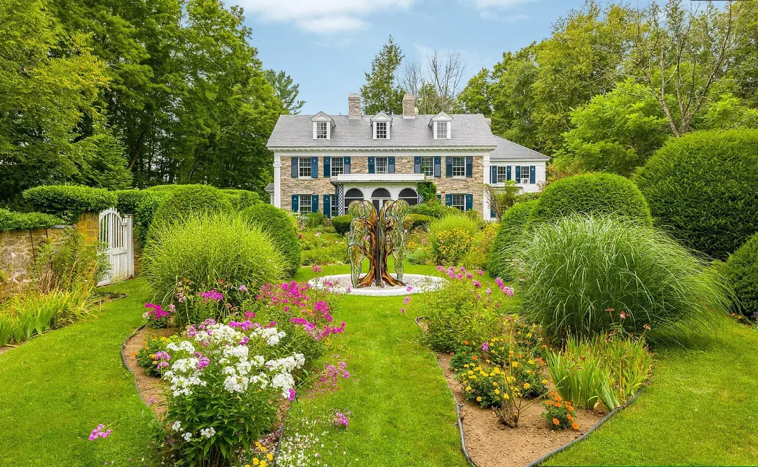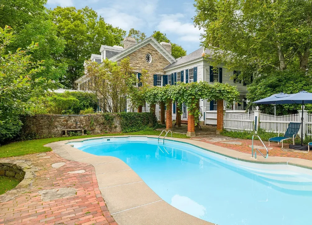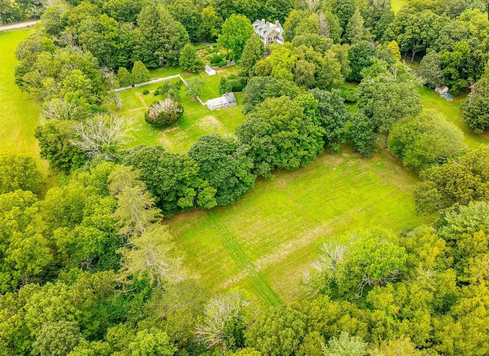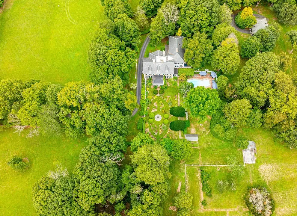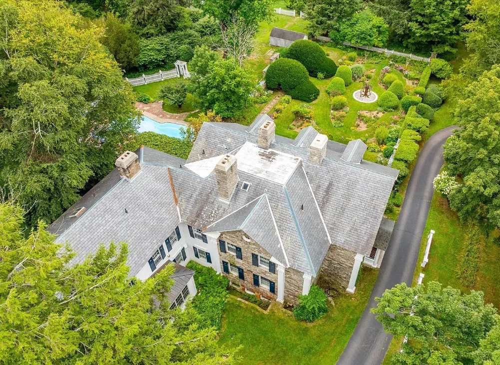 Reimagined in the early 1900s and surrounded by natural beauty, this extraordinary 41-acre estate offers unmatched privacy, timeless architecture, and refined craftsmanship. The 7,772 sq ft stone residence, crowned with a slate roof, is framed by rolling fields, mature trees, and manicured gardens. Inside, hand-carved moldings, elegant fireplaces, and artisan details reflect a level of quality rarely found today. The chef’s kitchen features a Thermador gas range and oven, double wall ovens, a well-appointed butler’s pantry, and an original Walker & Pratt Manufacturing Co. wood-burning cooking stove-both a functional centerpiece and a striking architectural feature. An impressive full-service bar makes entertaining effortless, while the screened porch with chevron brick flooring overlooks the gardens and grounds. Outdoor amenities include a heated fiberglass-lined pool, an original sauna room opening directly to the pool area, a greenhouse, and a two-car garage with a full loft. Bordered in part by protected land, including preserved acreage across the road, the setting offers exceptional privacy and a true sense of retreat. Whether enjoyed as a primary residence or a luxurious escape from the city, this exceptional estate presents a rare combination of seclusion, beauty, and timeless appeal.
