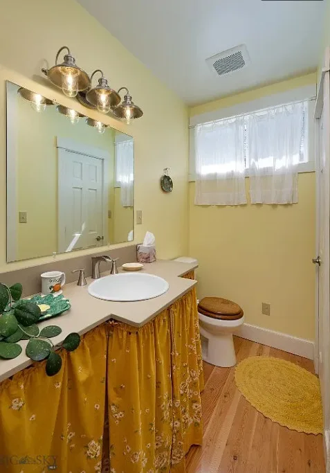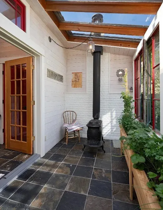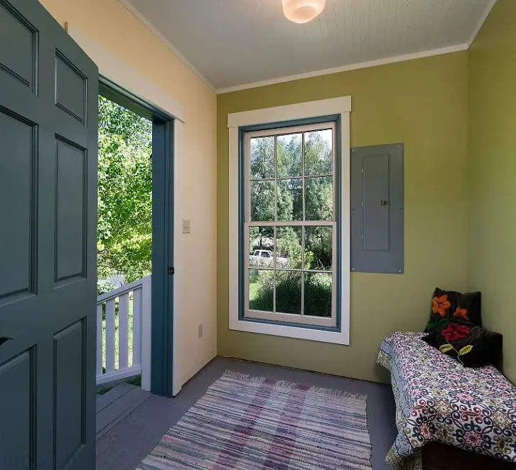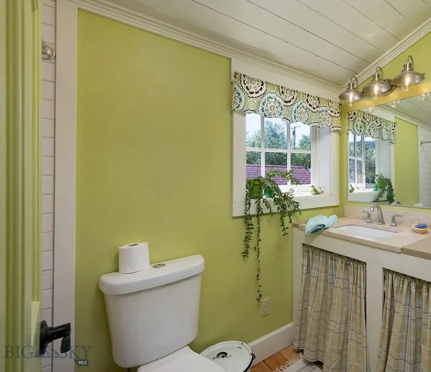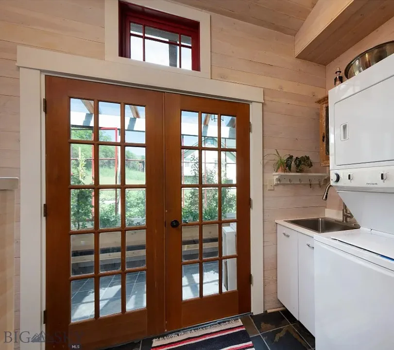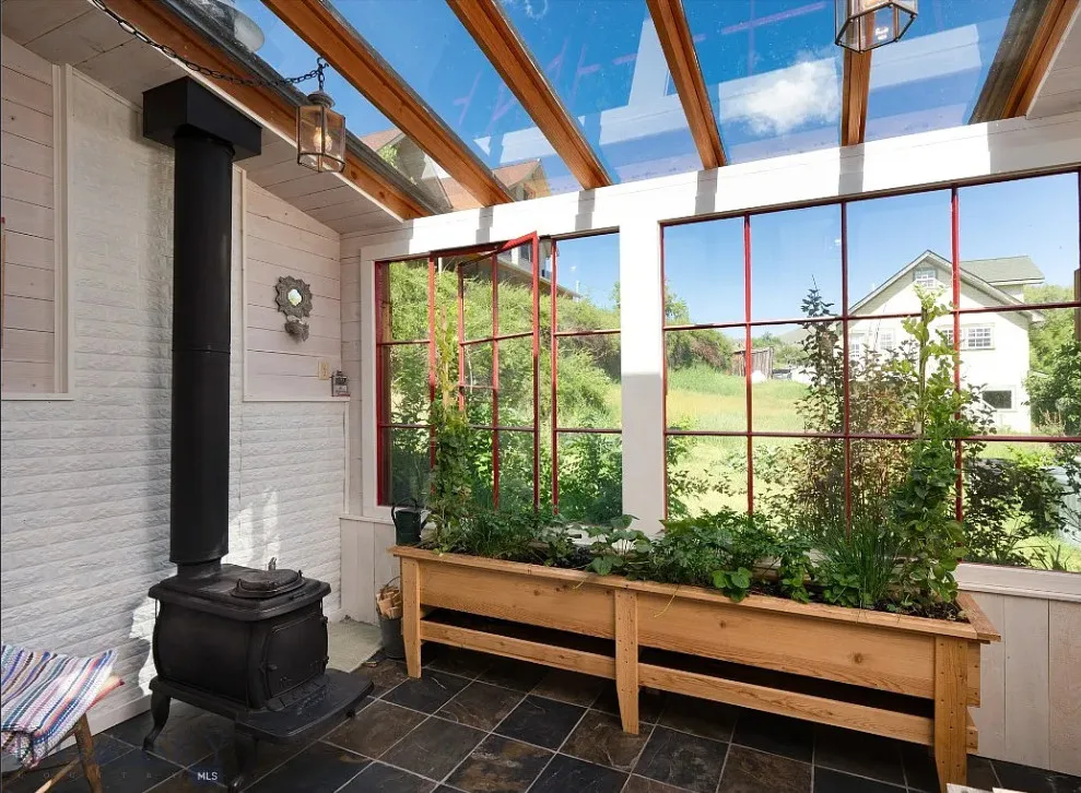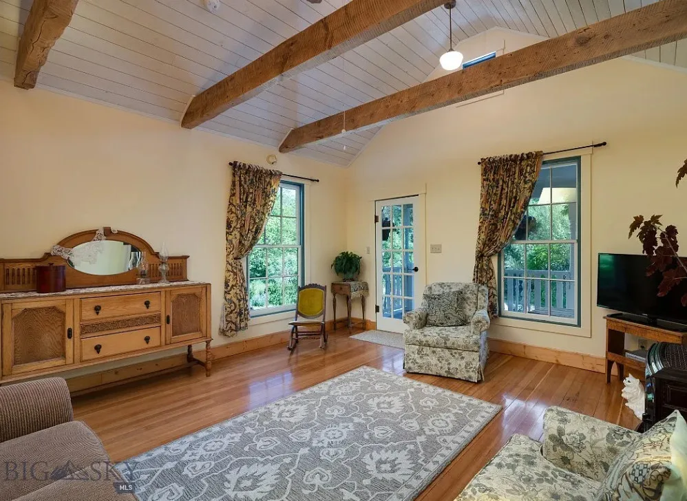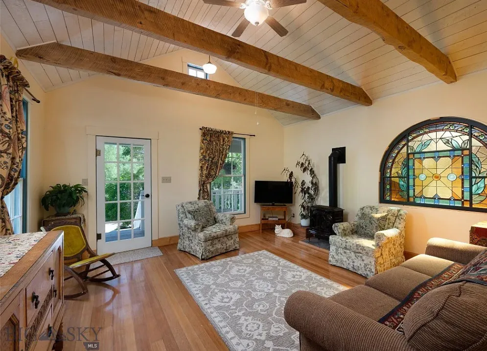 Love this interior! That glass sunroom and the kitchen sink are perfect! This is known as the Samuel Russell House. It was built in 1900. The house is located in Virginia City, Montana. The house features a covered front porch, vaulted ceilings, exposed beams, wood floors, great kitchen sink, baseboards, french doors, glass sunroom and bead board. There is a detached storage building on the property. Two bedrooms, two bathrooms and 1,455 square feet. $445,000
