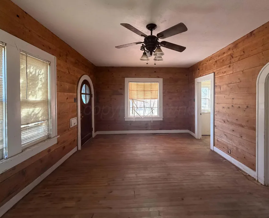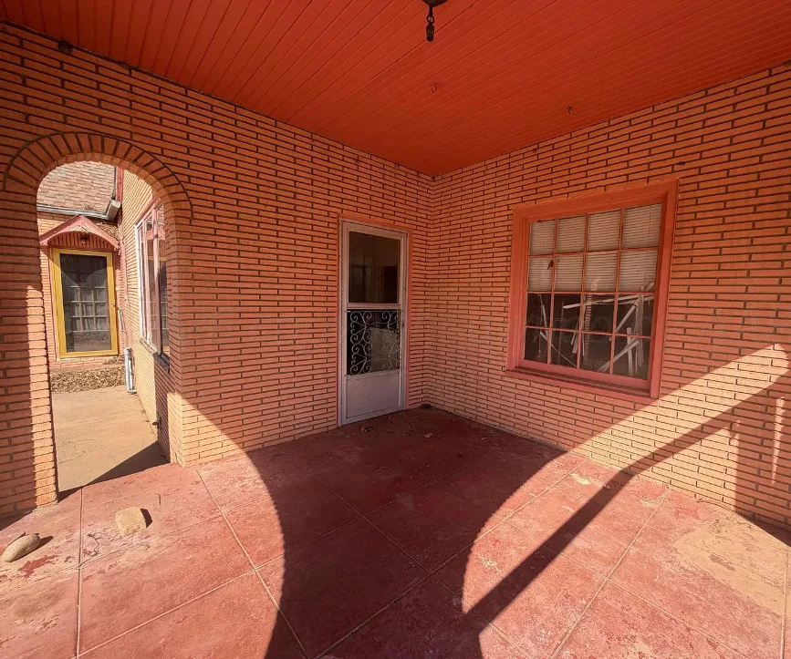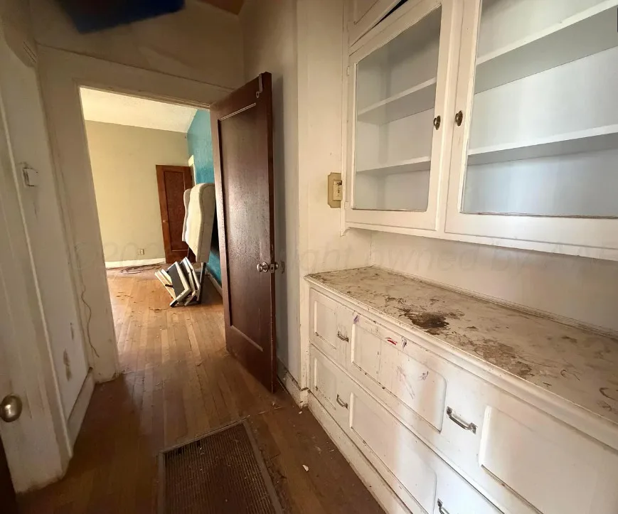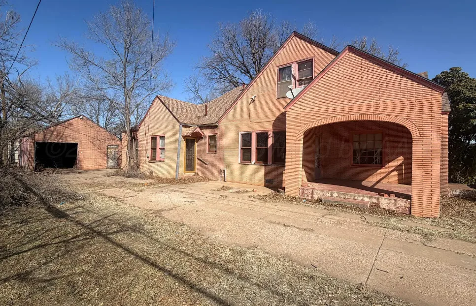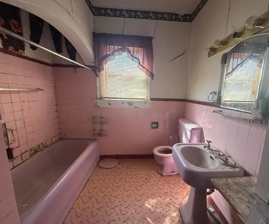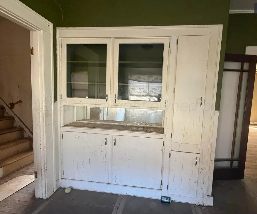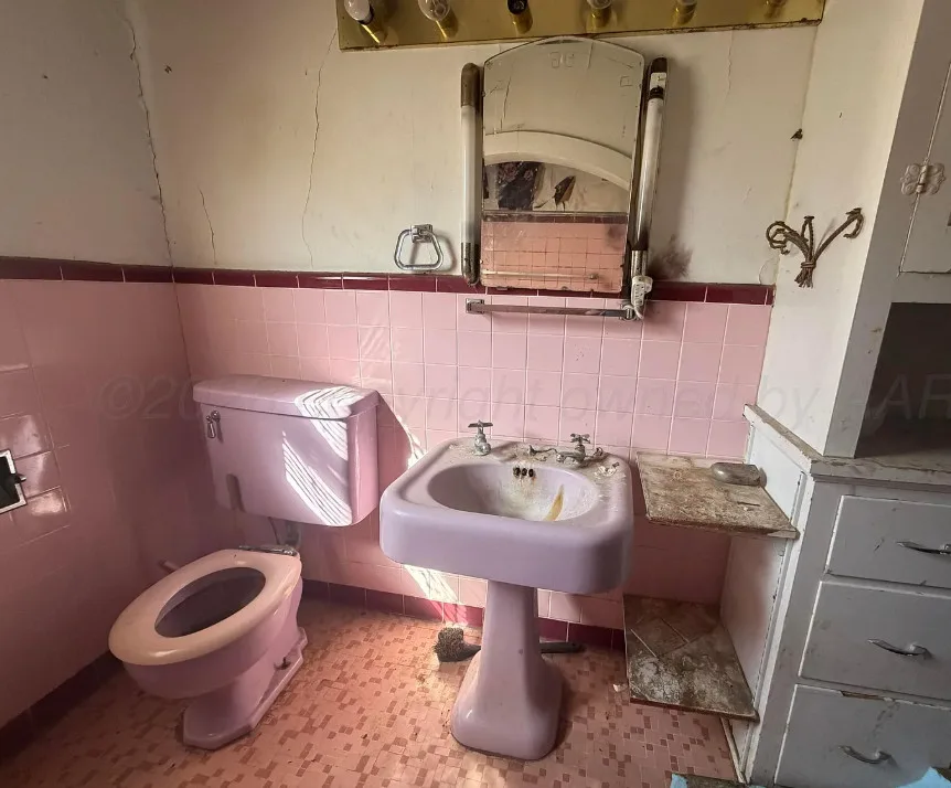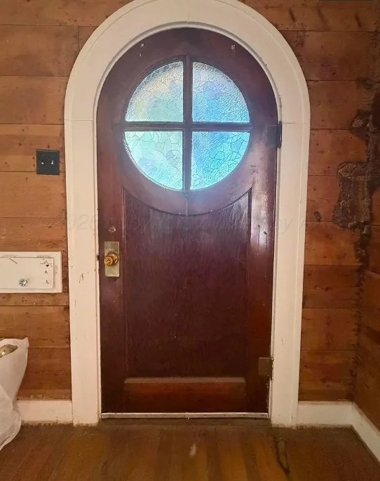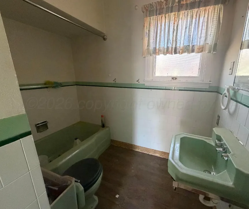 Hard to believe that price of $35,000. Going to assume it is a location issue. The front door is pretty! Love the vintage bathrooms. The house was built in 1940. It is located on .52 acre acre in Memphis, Texas. The house features multiple covered porches, arched front door with leaded glass, original wood floors, vintage bathrooms, baseboards and unpainted woodwork. A good cleaning and some landscaping would go a long way with this house! The house is bigger than it looks! Five bedrooms and three bathrooms. $35,000