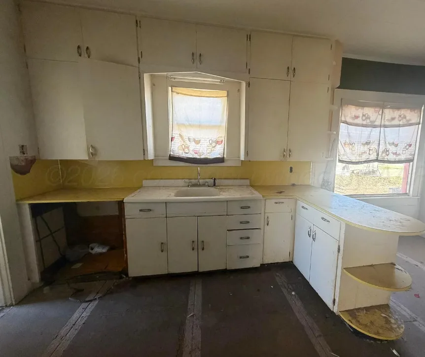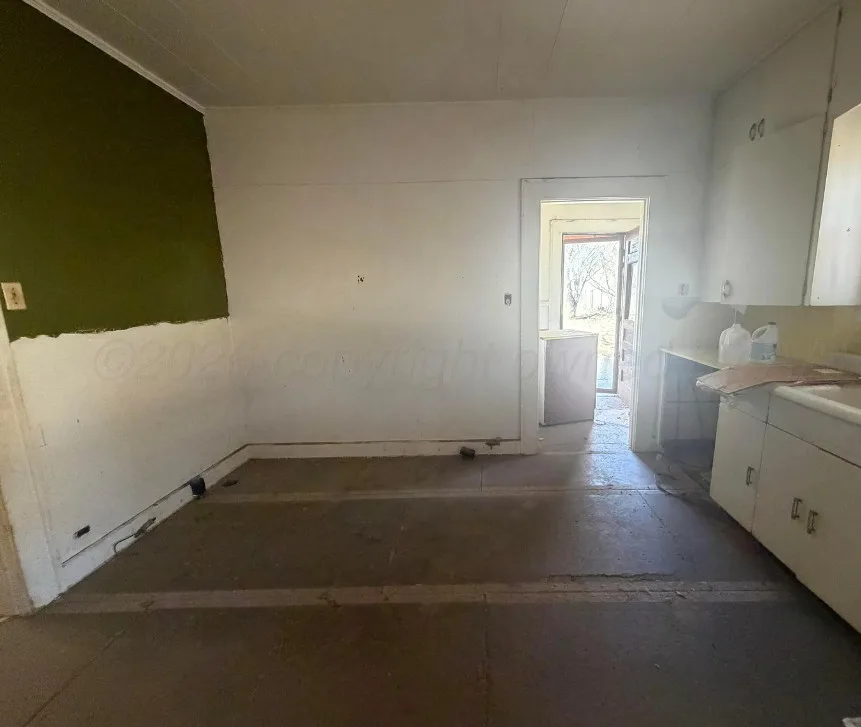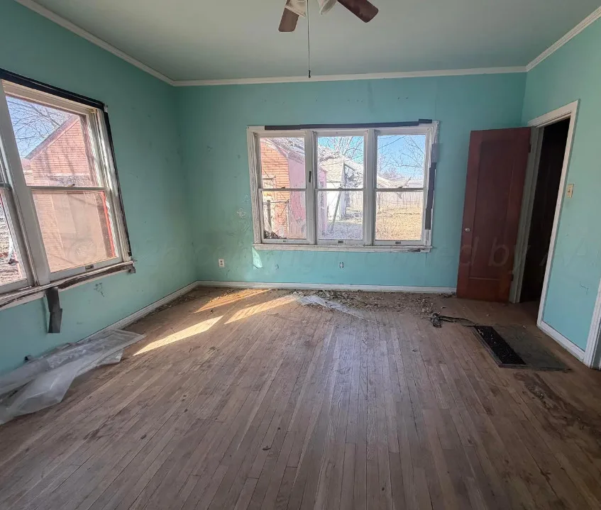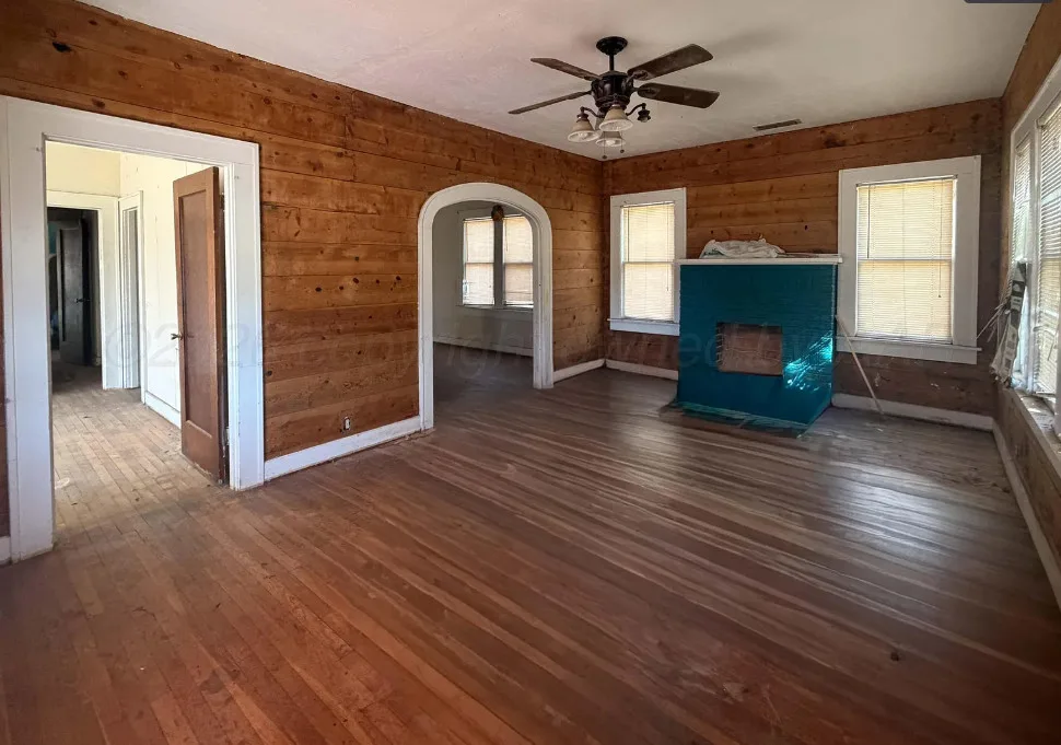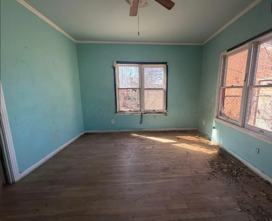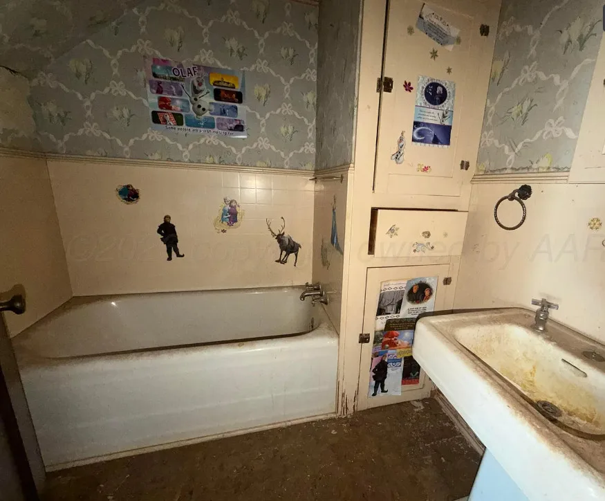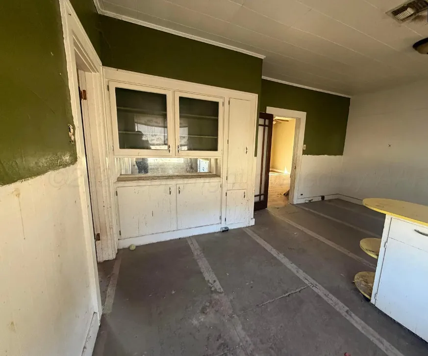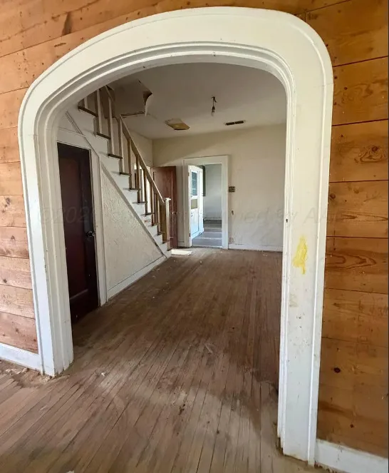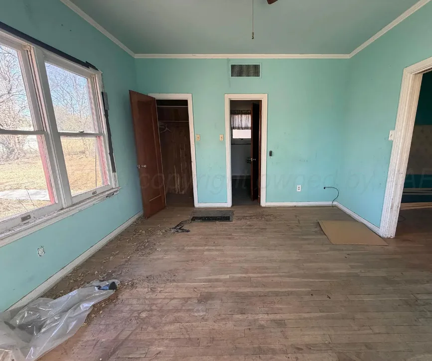 Hard to believe that price of $35,000. Going to assume it is a location issue. The front door is pretty! Love the vintage bathrooms. The house was built in 1940. It is located on .52 acre acre in Memphis, Texas. The house features multiple covered porches, arched front door with leaded glass, original wood floors, vintage bathrooms, baseboards and unpainted woodwork. A good cleaning and some landscaping would go a long way with this house! The house is bigger than it looks! Five bedrooms and three bathrooms. $35,000
