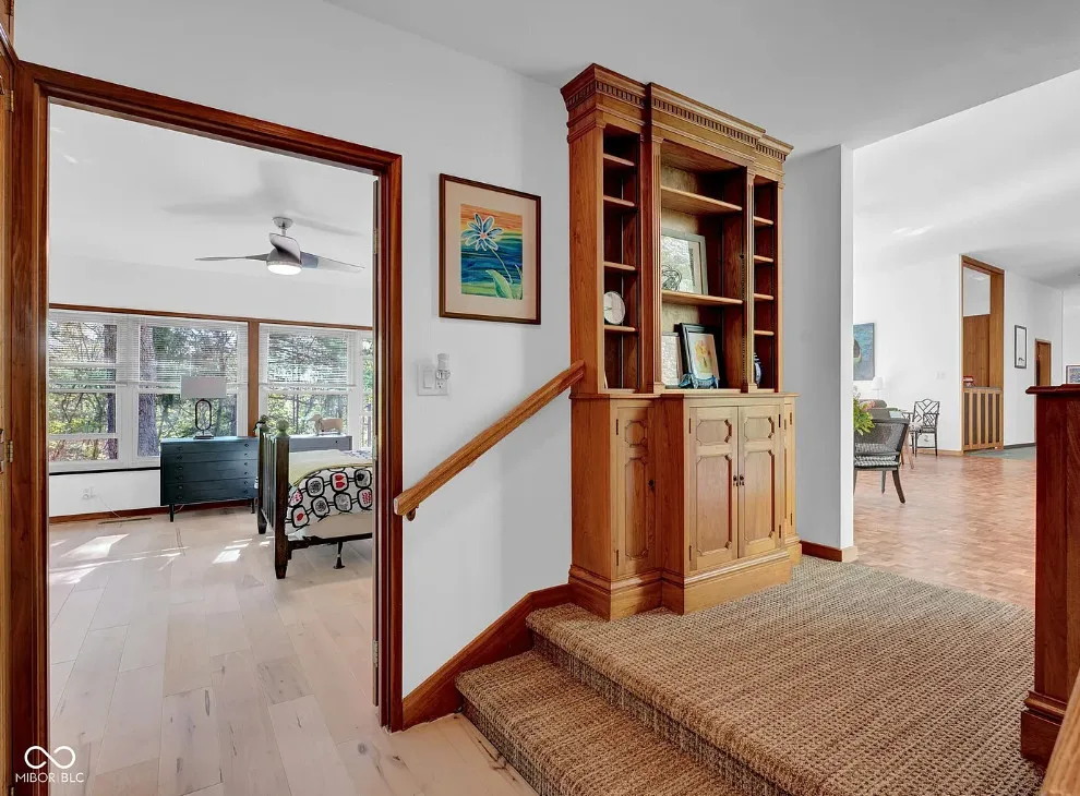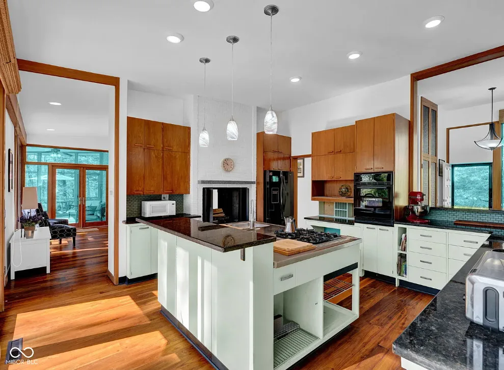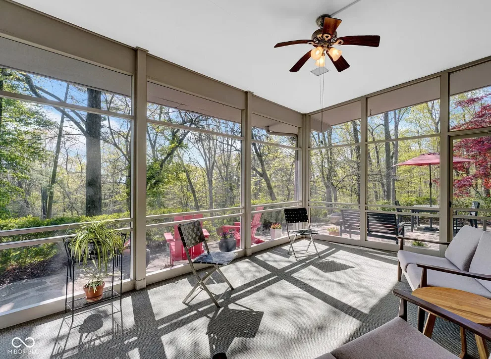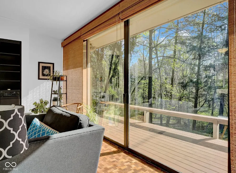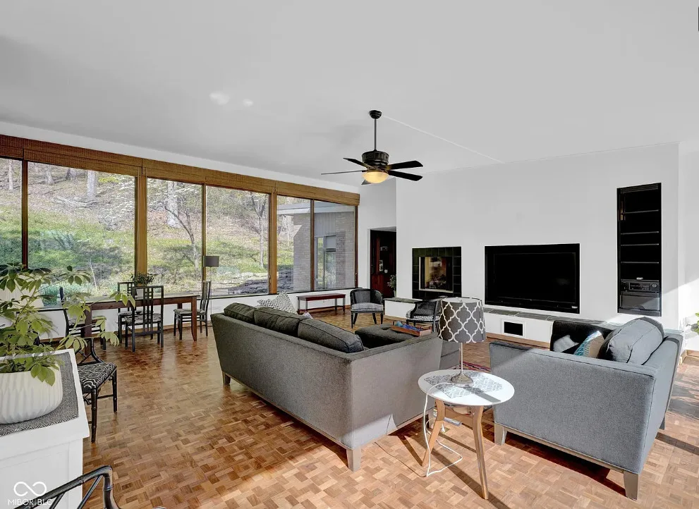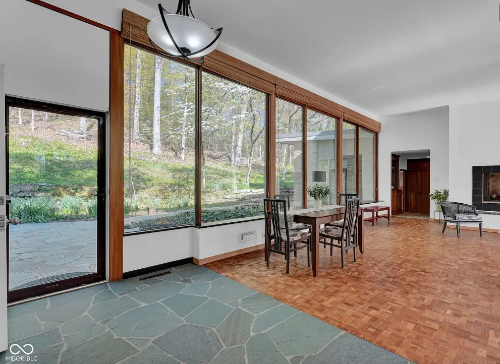 Love the windows in this mid-century home! Pretty view! The house was built in 1950. It is located on 4.14 acres in Columbus, Indiana. The house features a large deck, a beautiful patio, wood floors, a lot of natural light. spacious kitchen and built-in bookshelves. This is a big house! Four bedrooms, four bathrooms and 3,468 square feet. $695,000